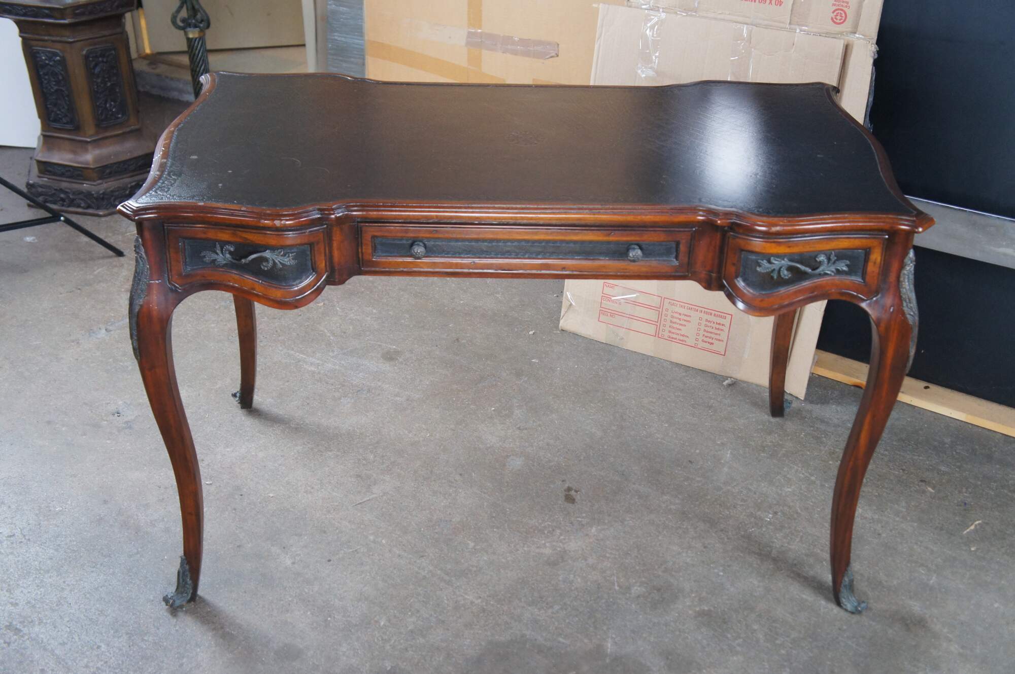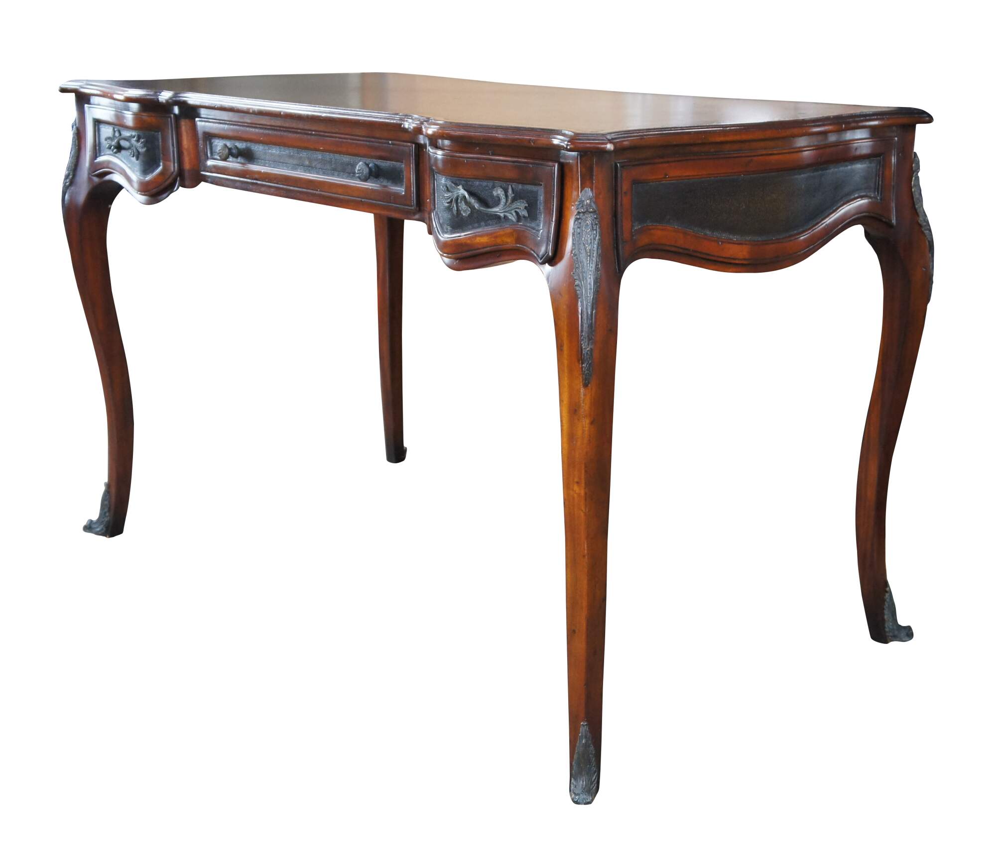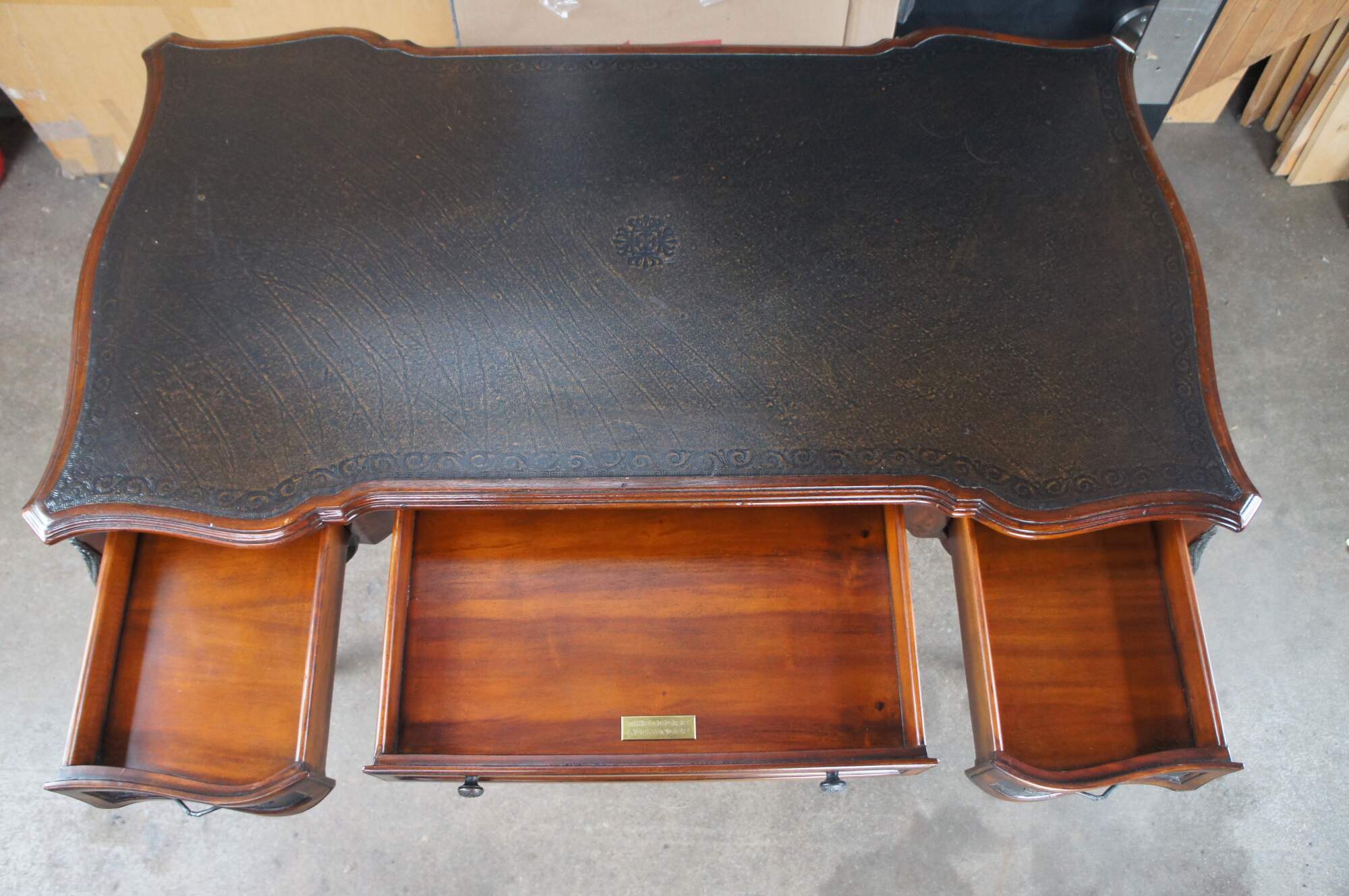 Theodore Alexander "Chateau du Vallois" French Provincial Writing Desk. Features a serpentine form made from mahogany with tooled leather surfaces. Includes three dovetailed drawers and shapely carbriole legs with bronze mounts.
