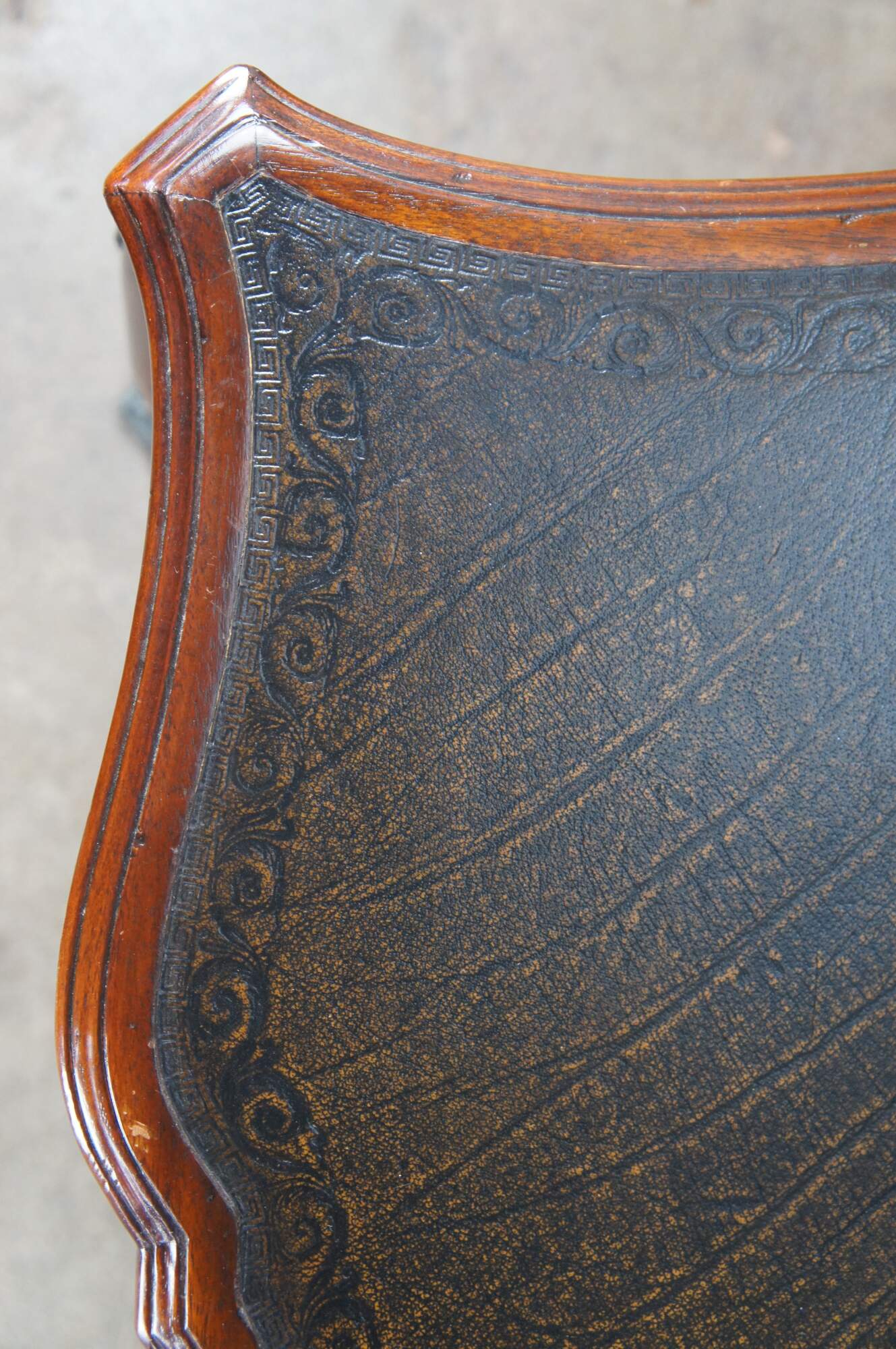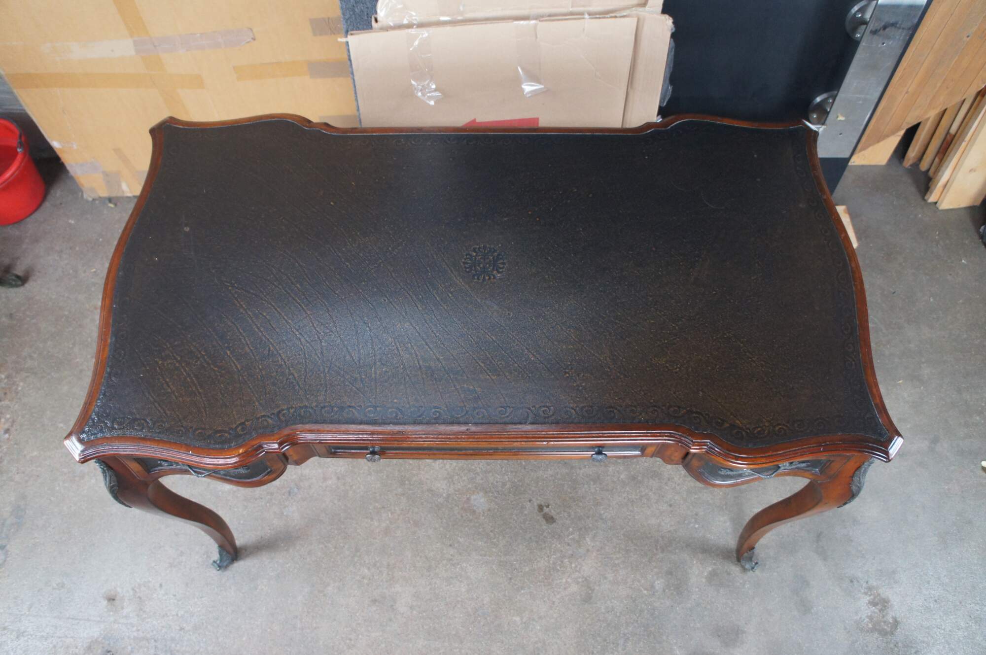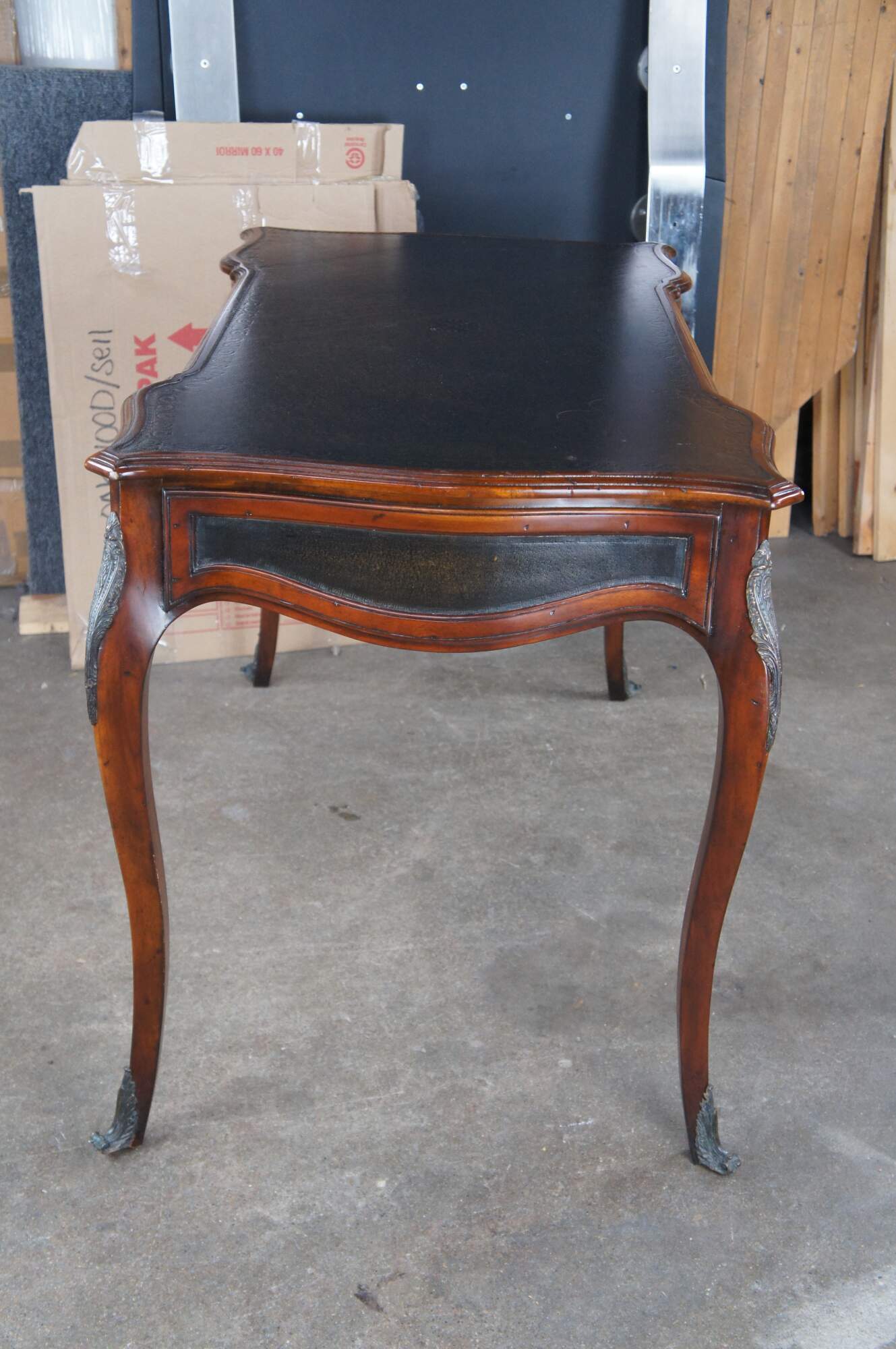 Theodore Alexander "Chateau du Vallois" French Provincial Writing Desk. Features a serpentine form made from mahogany with tooled leather surfaces. Includes three dovetailed drawers and shapely carbriole legs with bronze mounts.