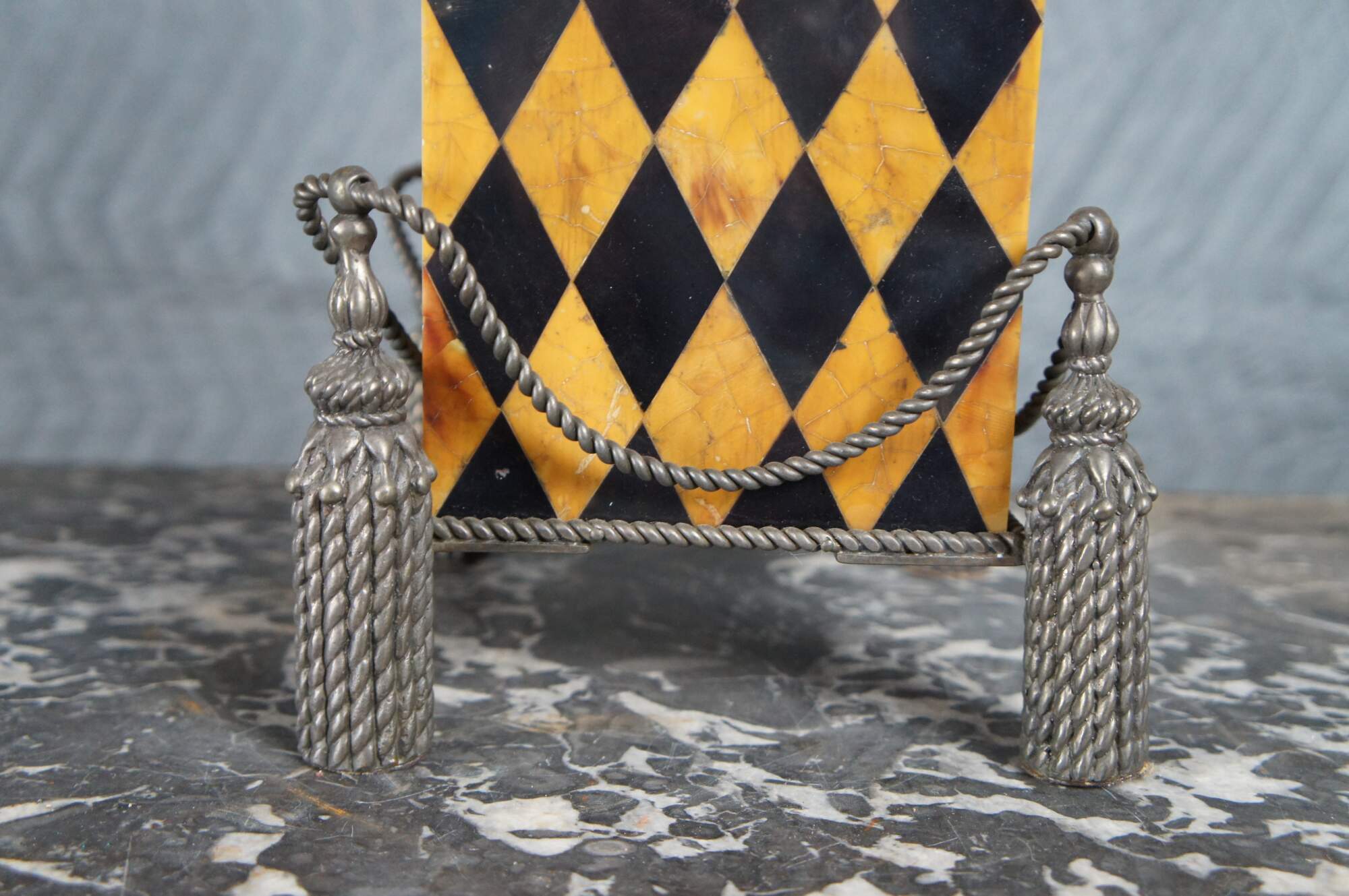 Late 20th Century Maitland Smith Lidded Box / Urn. Features a beautiful Harlequin pattern Penshell exterior resting on a footed brass neoclassical style tasseled base. The lid opens via a trophy shaped finial to a velvet lined interior.