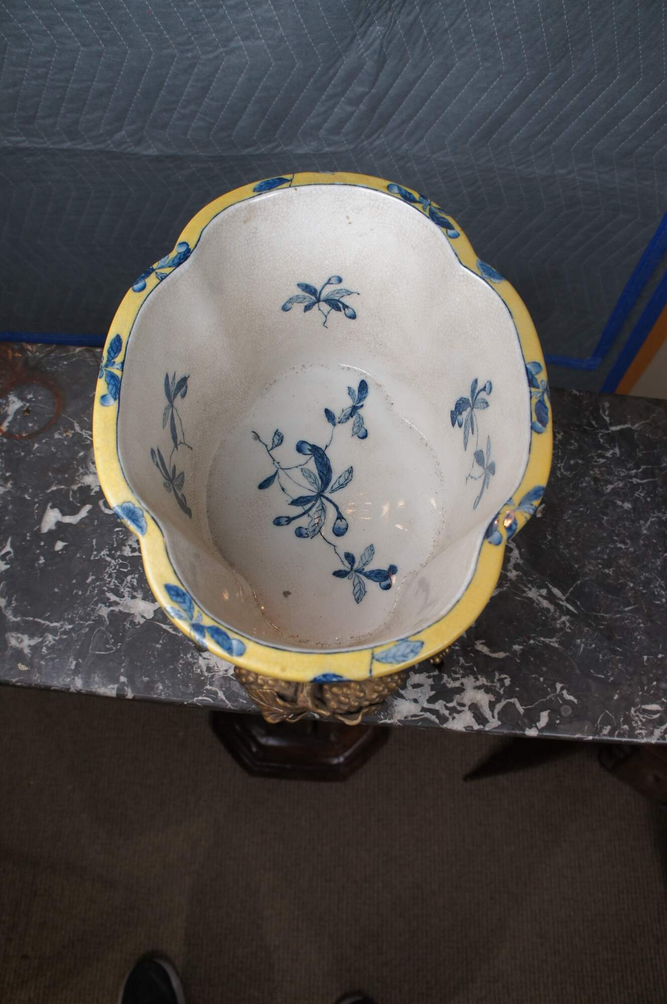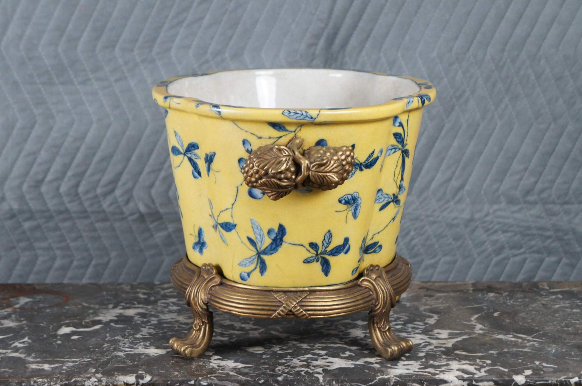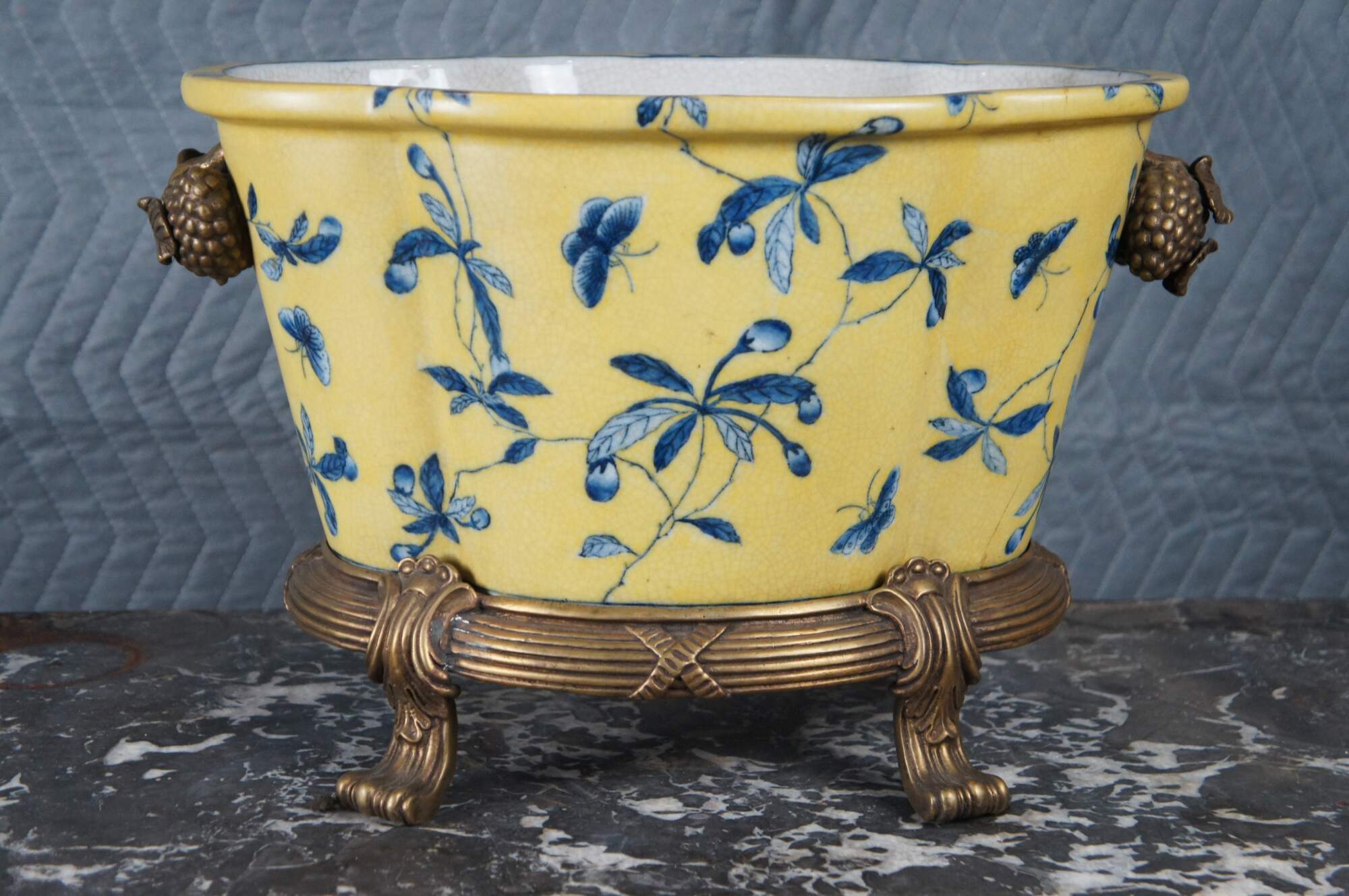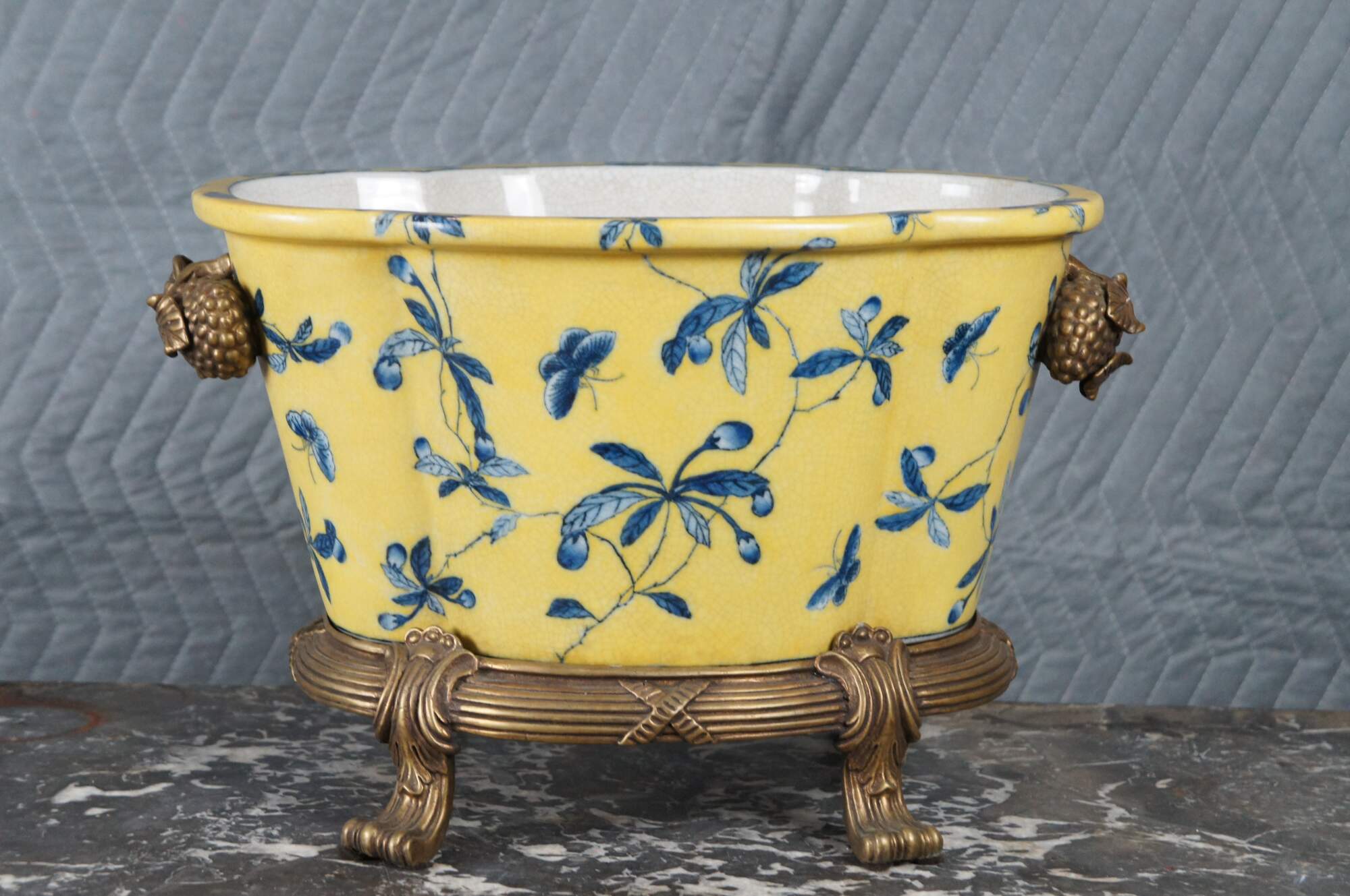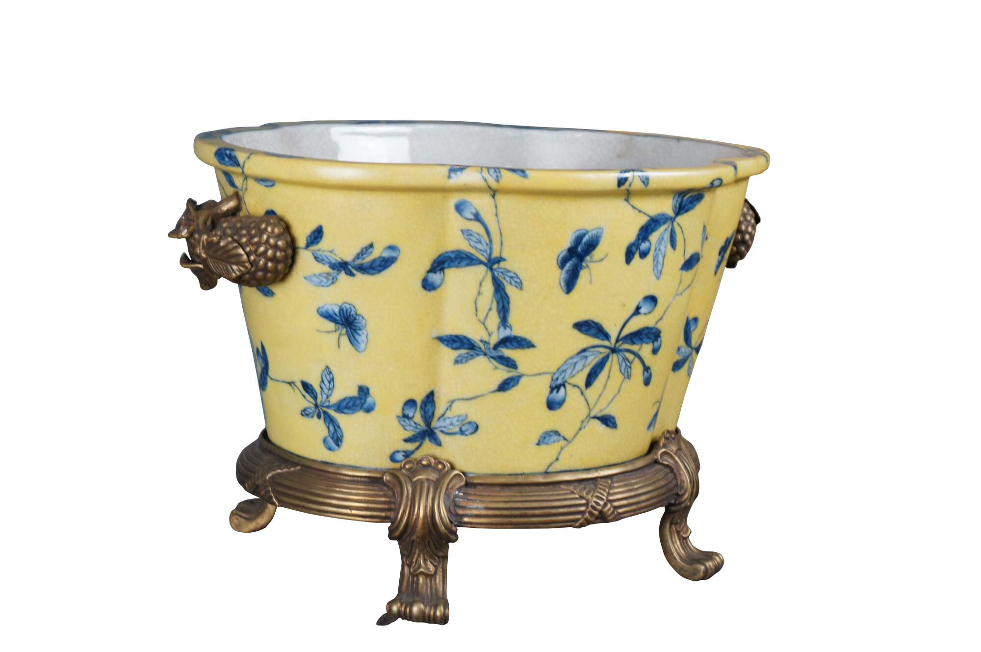 A lovely 20th Century Chinoiserie cachepot by United Wilson (JUWC). Features a lobed porcelain body in yellow with blueberry shrub and butterfly motif. The planter rests on a French inspired bronze base with contoured feet. Handles are high relief bronze blueberry shrubbed. Makers mark along underside of pot.