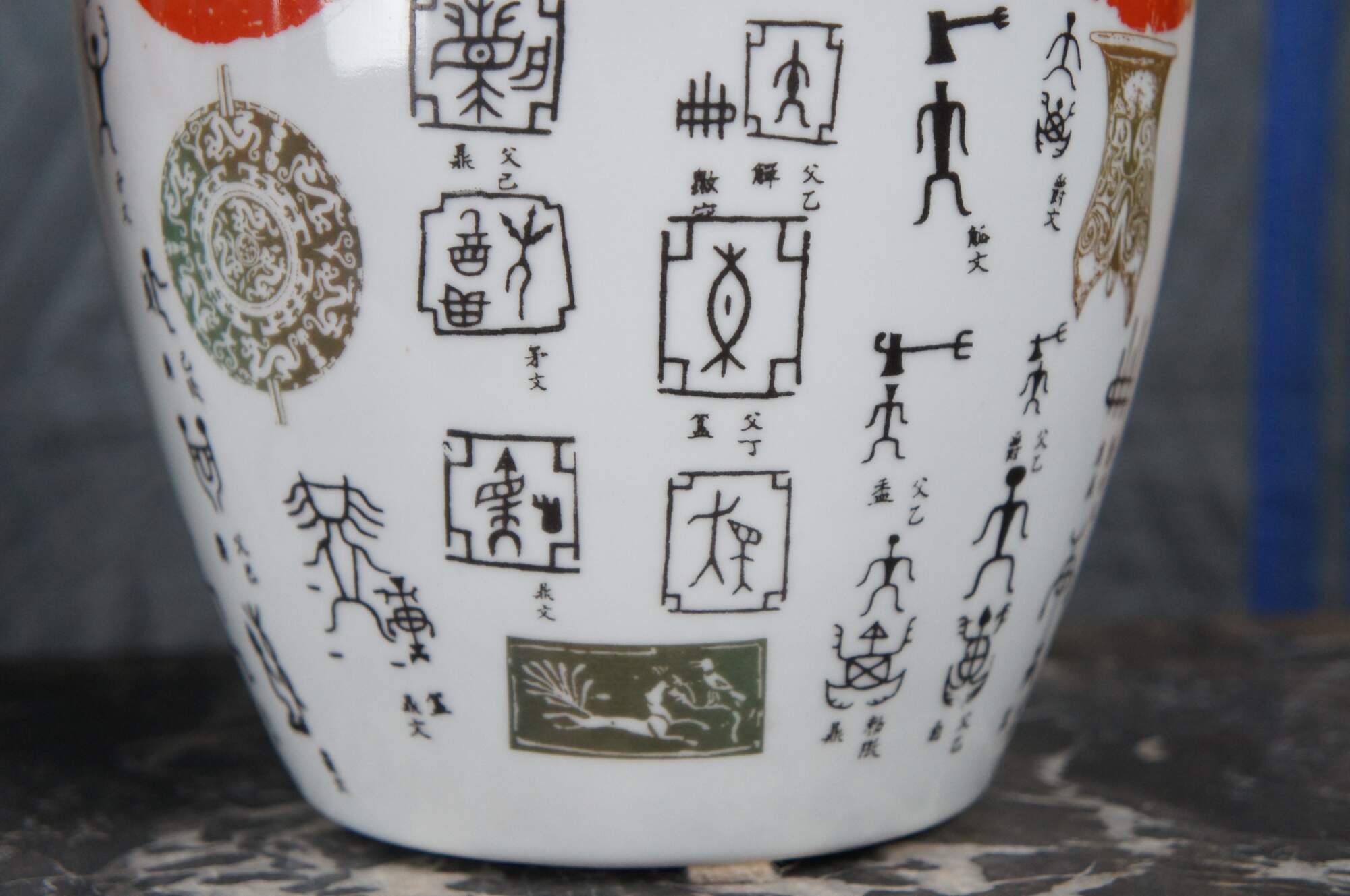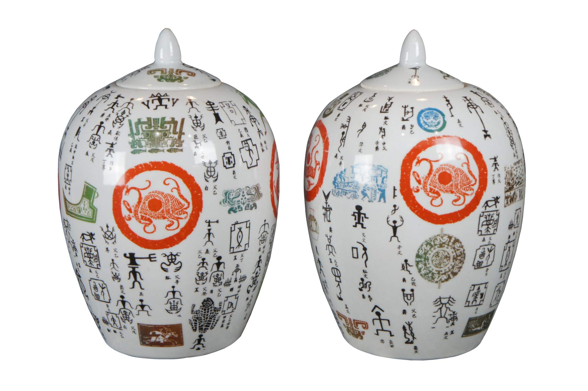 Pair of Chinese Famille Rose ginger jars. Made from porcelain with a uniquely finished exterior featuring animals and figures. The urn has a unique melting pot vibe drawing together motifs from Mesoamerica and Egypt.