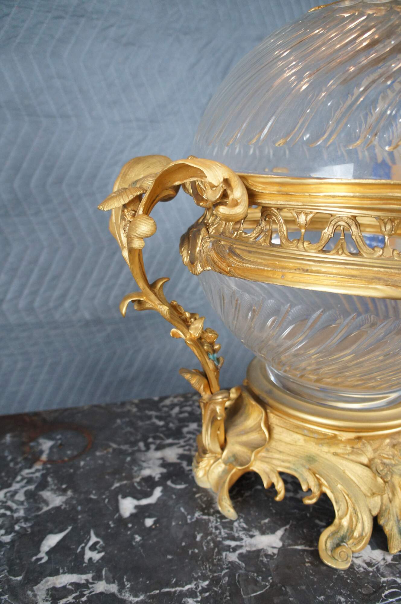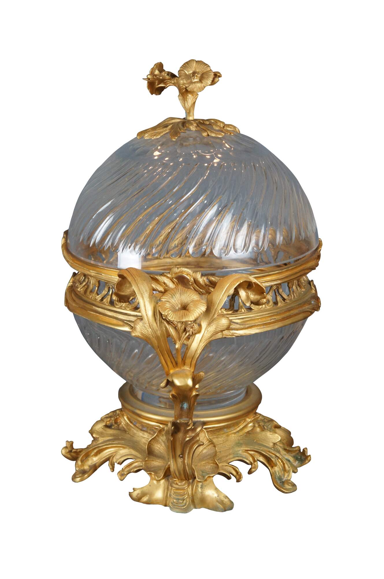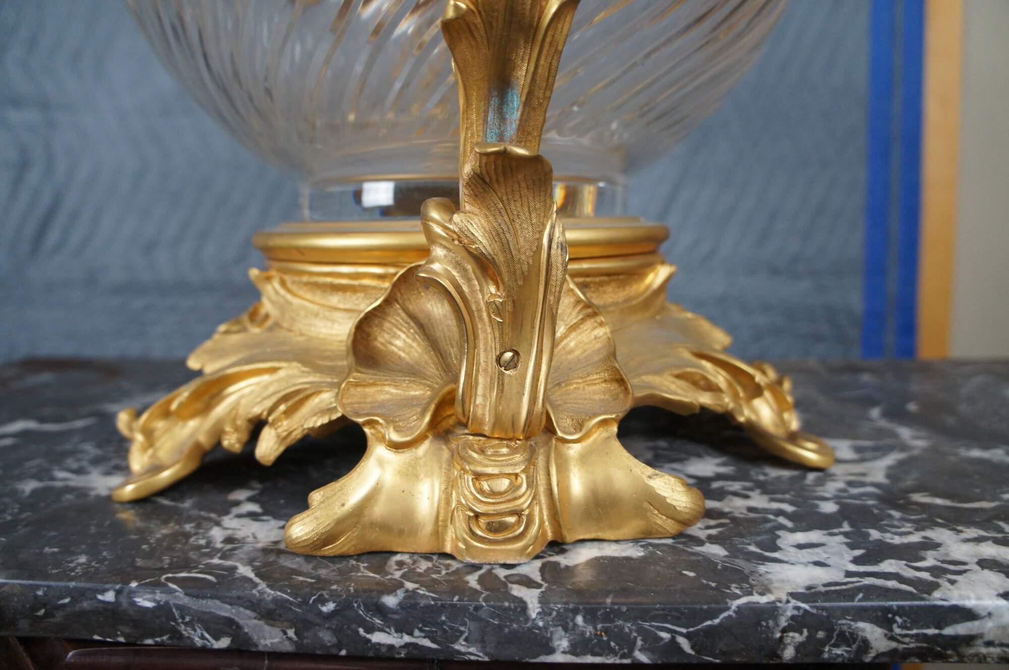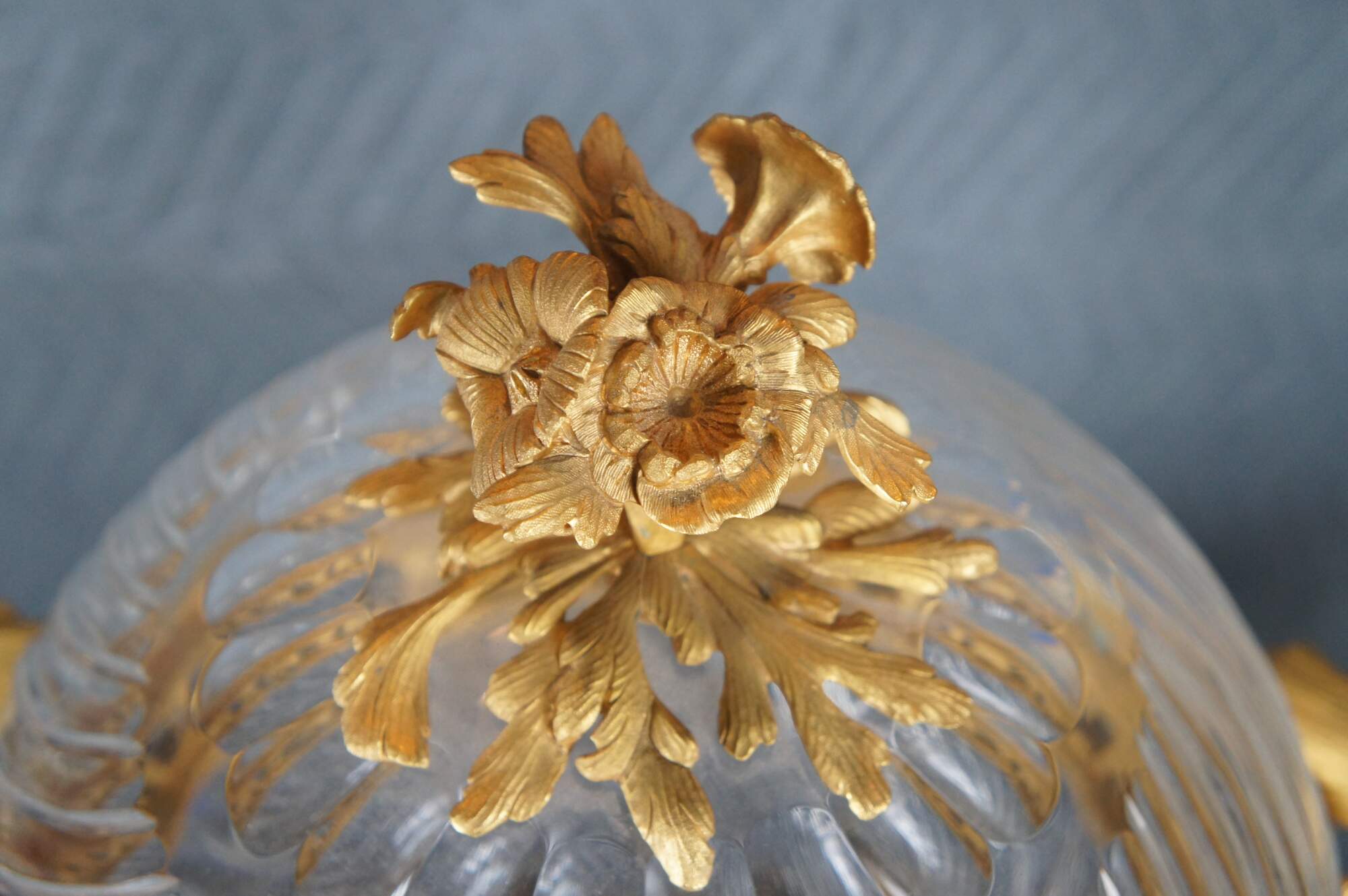 Large and impressive French Louis XV style ormolu-mounted crystal incense burner / centerpiece bowl and cover. Features beautifully chiseled brass mounts in 24 carats with tulip and acanthus foliate details. The bowl is pierced at the center and fixed to an ornate heavy base. Crystal is embossed with a gadrooned pattern. Circa 1990s.
