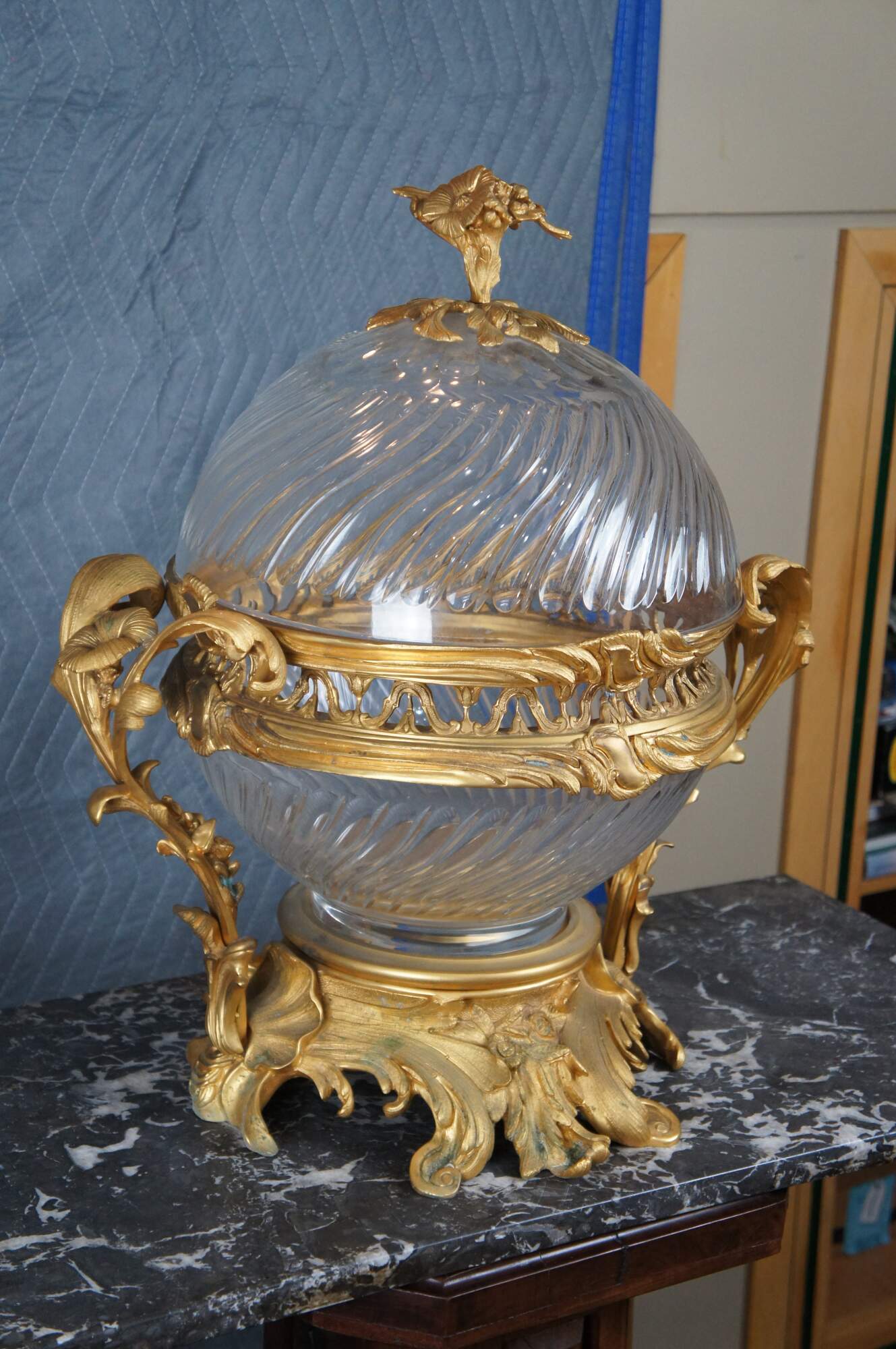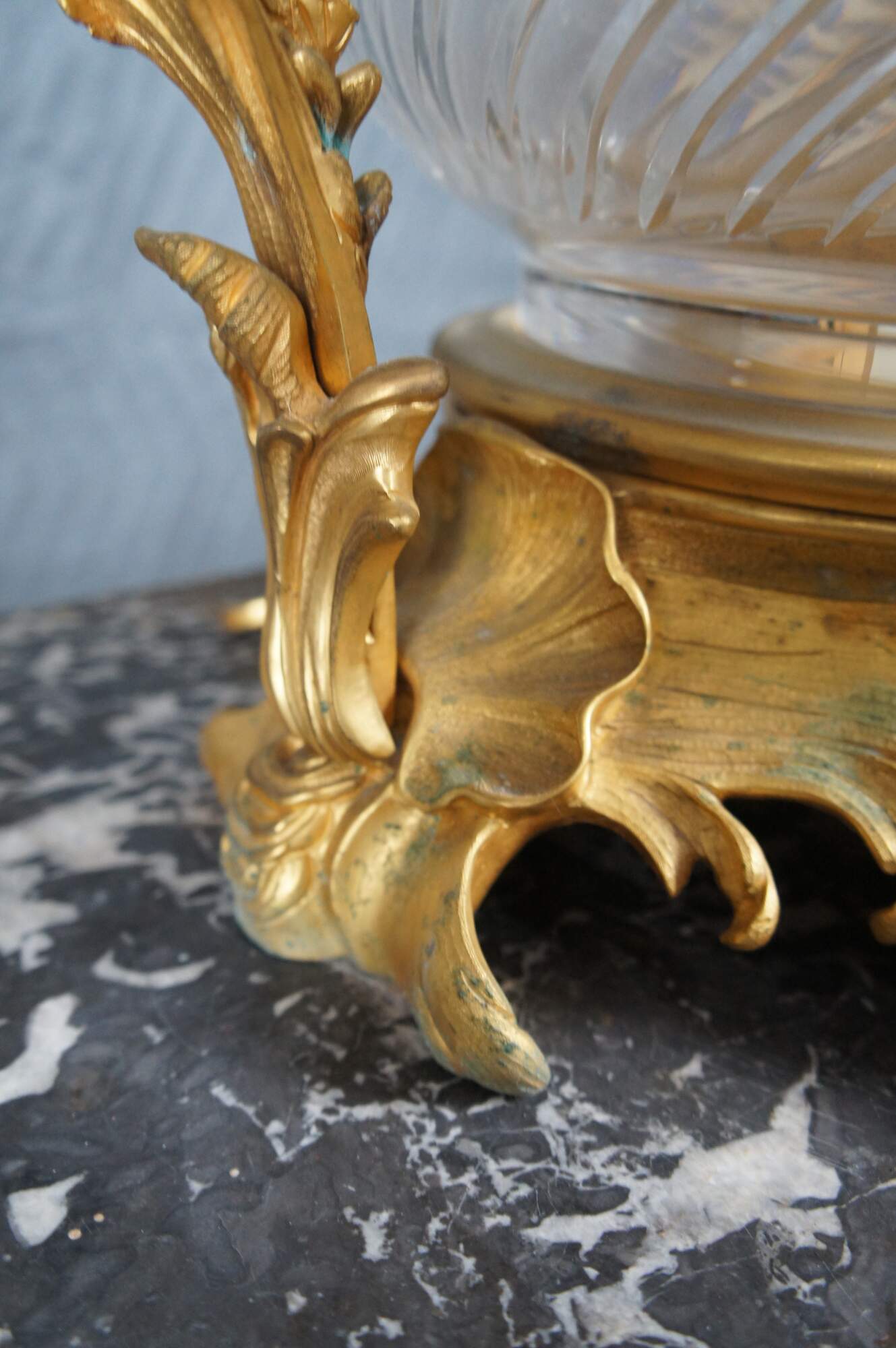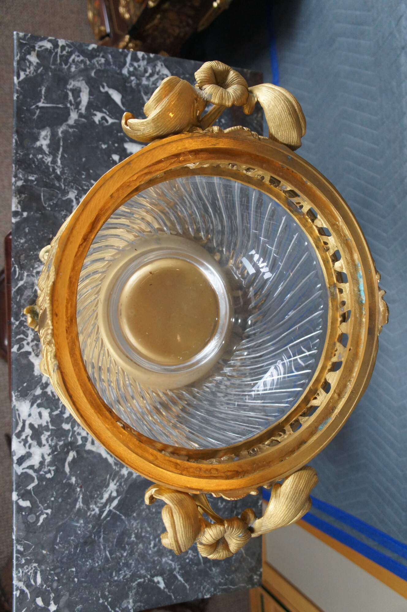 Large and impressive French Louis XV style ormolu-mounted crystal incense burner / centerpiece bowl and cover. Features beautifully chiseled brass mounts in 24 carats with tulip and acanthus foliate details. The bowl is pierced at the center and fixed to an ornate heavy base. Crystal is embossed with a gadrooned pattern. Circa 1990s.