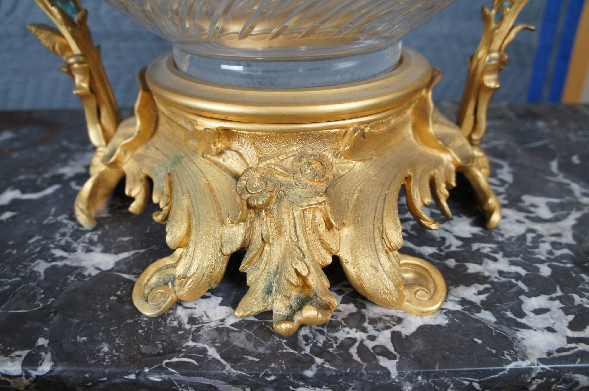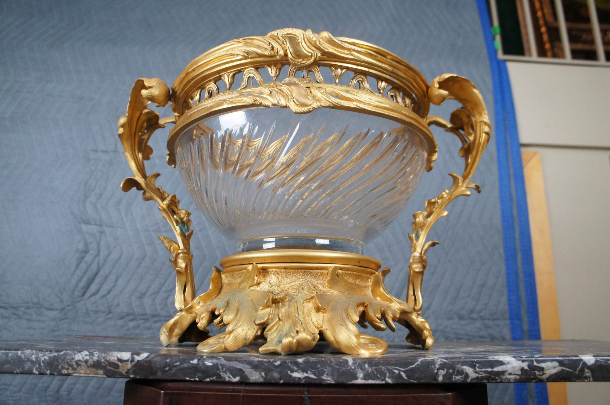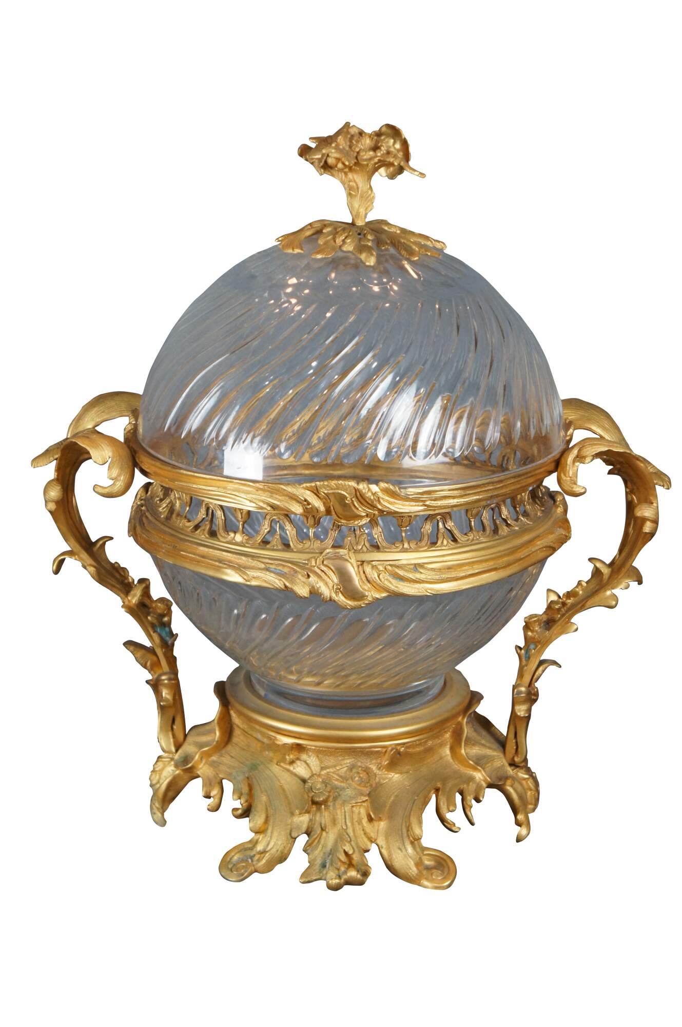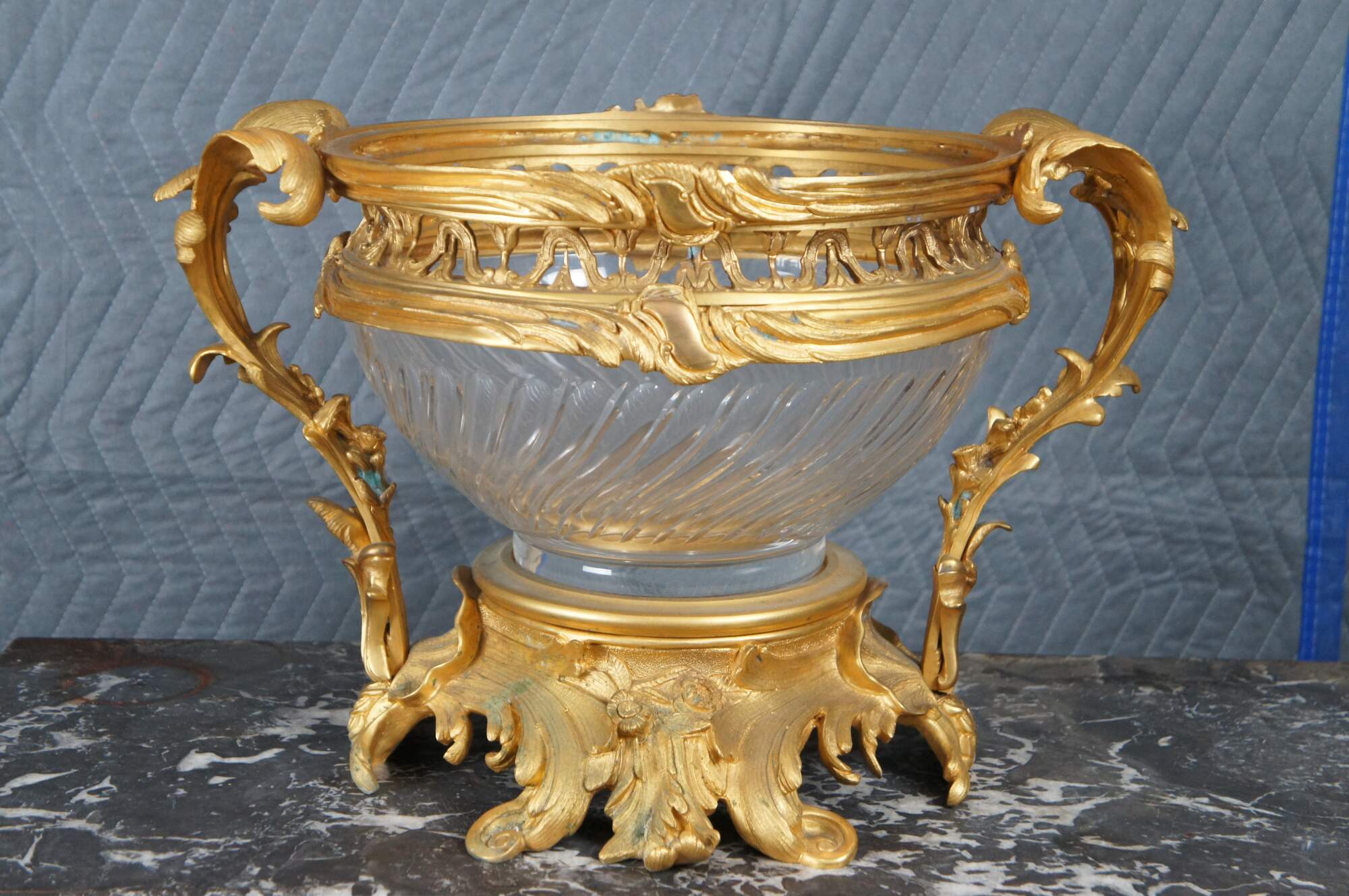 Large and impressive French Louis XV style ormolu-mounted crystal incense burner / centerpiece bowl and cover. Features beautifully chiseled brass mounts in 24 carats with tulip and acanthus foliate details. The bowl is pierced at the center and fixed to an ornate heavy base. Crystal is embossed with a gadrooned pattern. Circa 1990s.