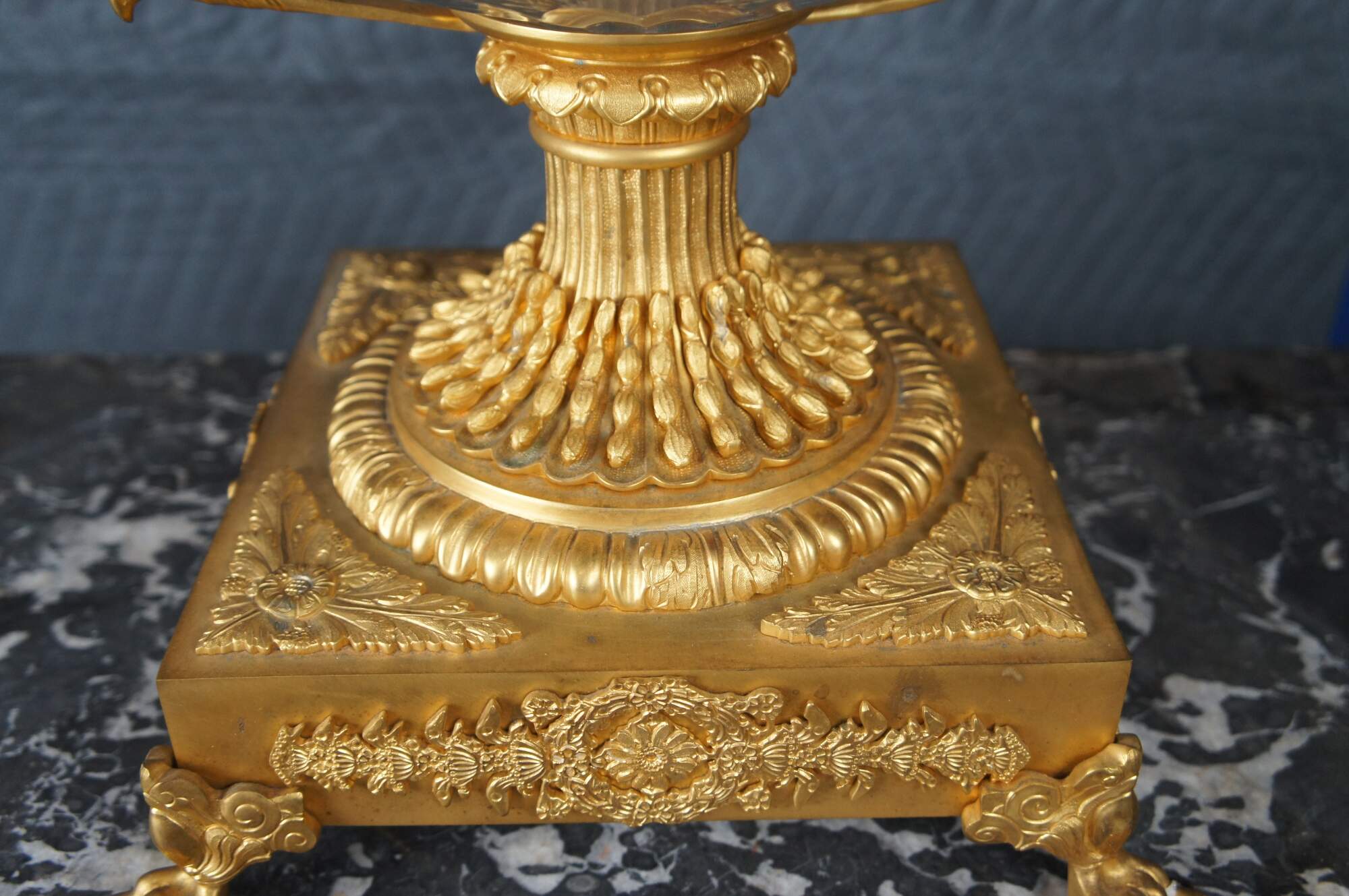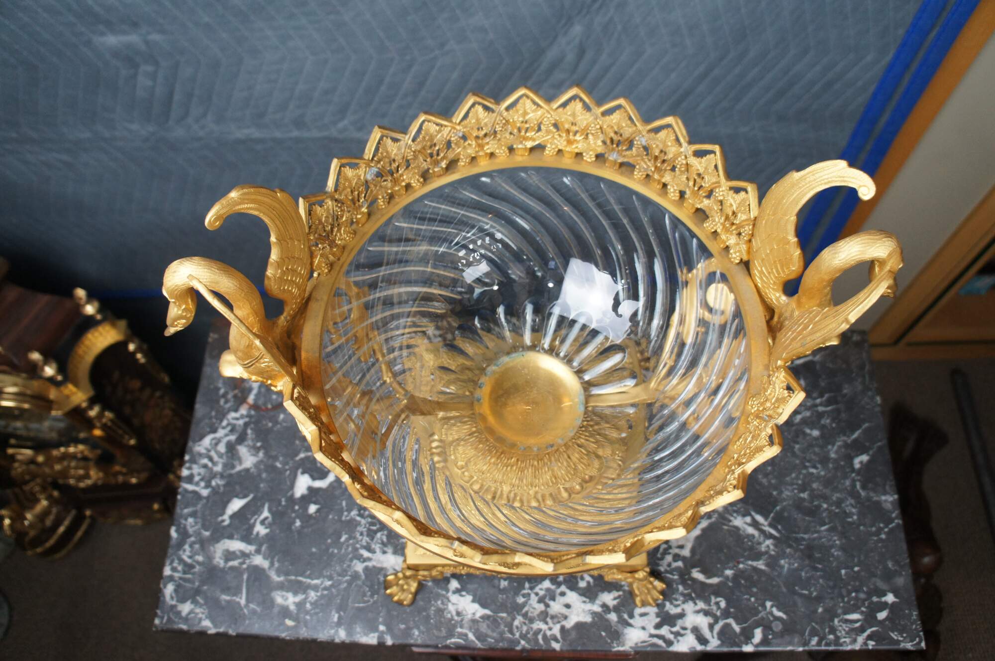 Late 20th Century Eric Stepniewski French Louis XV style Ormolu & Crystal Footed Champagne Chiller / Compote / Centerpiece Bowl / Vase. Features a regal 24k gold finished body with interlaced sawtooth rim over grapevine motif, flanked by figural swan handles with outstretched wings. The crystal bowl has a swirled gadrooning pattern and rests upon a fluted Corinthian style column leading to a square plinth base with ornate applied medallions over paw feet. A breathtaking specimen that will grab attention in any setting.