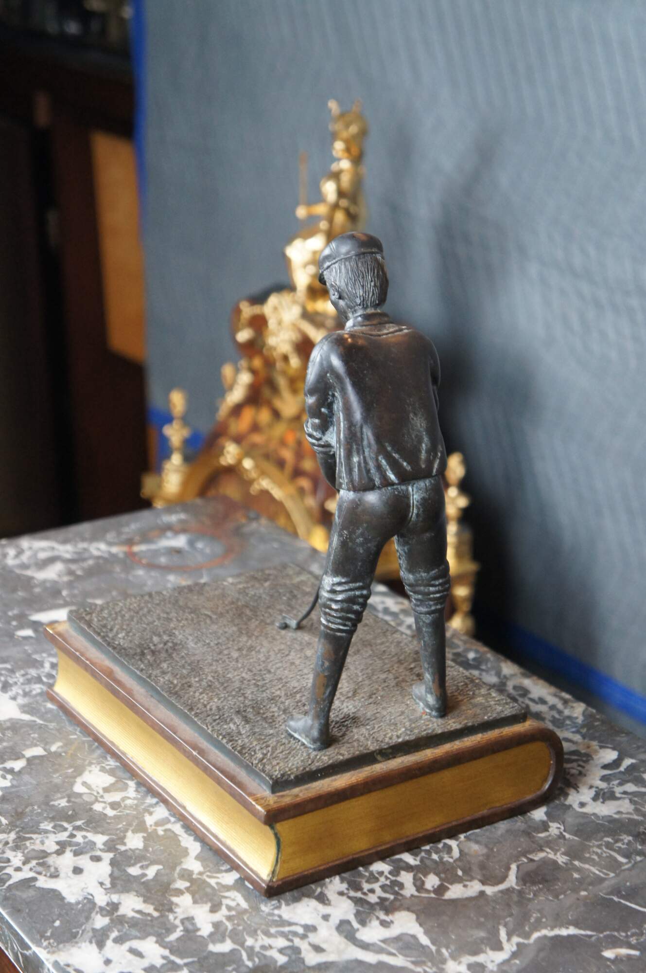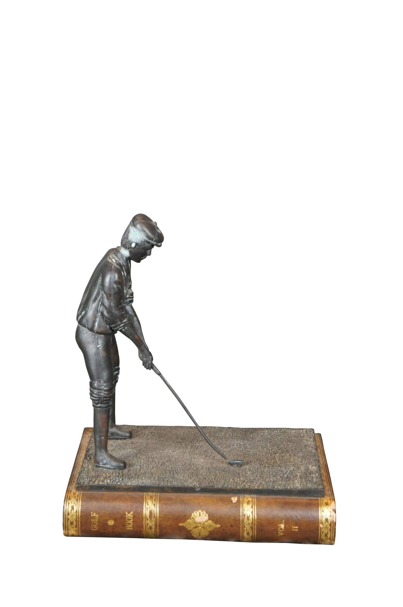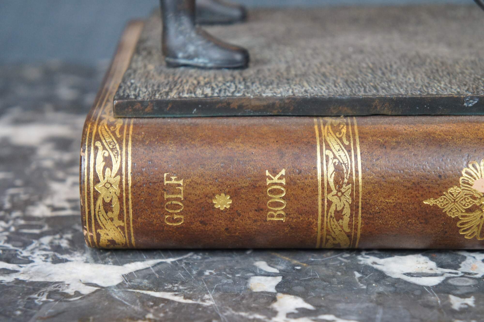 Late 20th Century Maitland Smith Bronze Golfer on Book Sculpture / bookend. Features a right handed gentleman adressing the ball over a tooled leather book marked "Golf Book". The book has faux gilded pages.