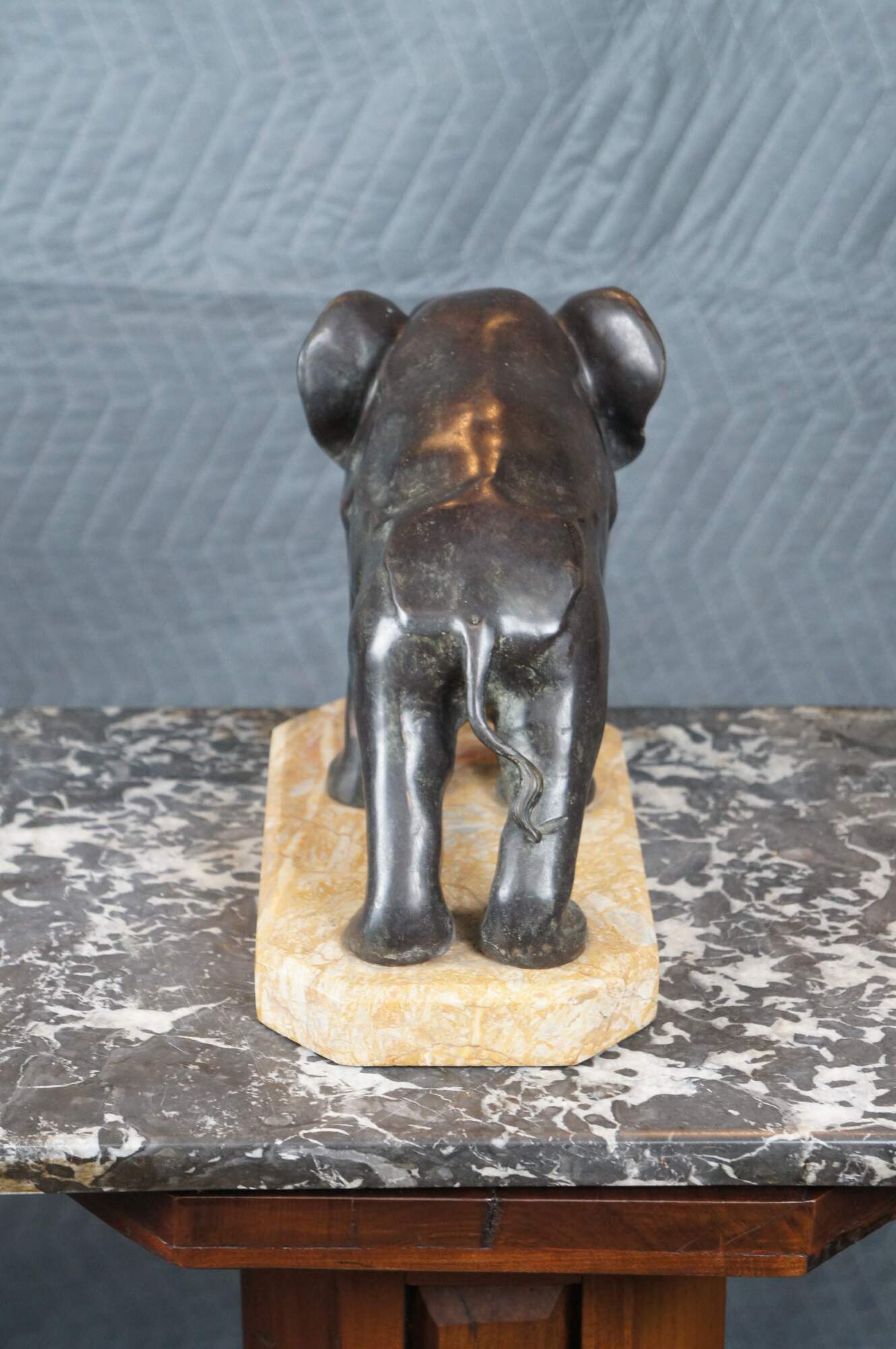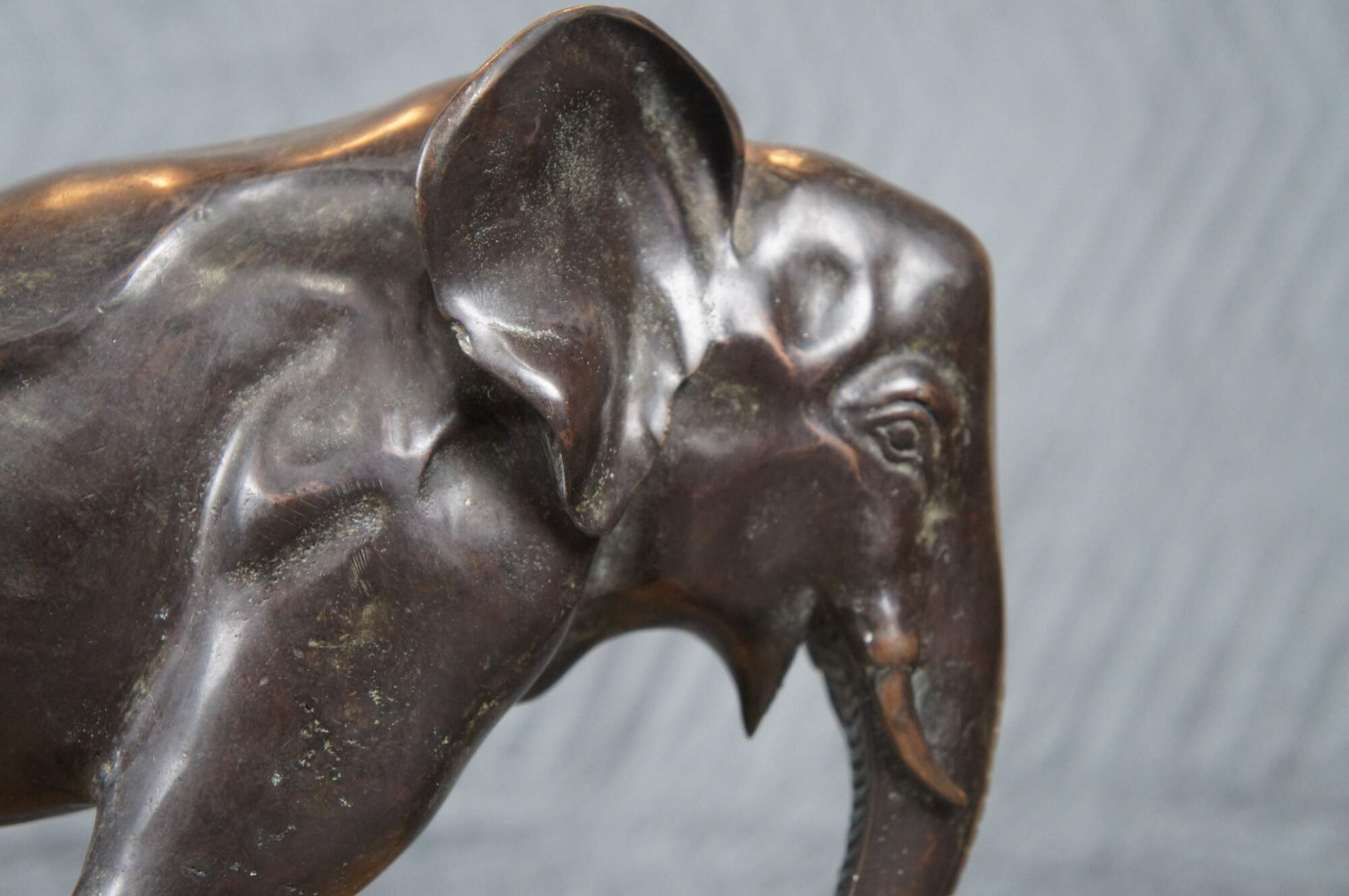 Art Deco bronze bookend, circa 1920s. An uncommon large size, depicting an elephant leaning forward bracing to hold up a row of books.
