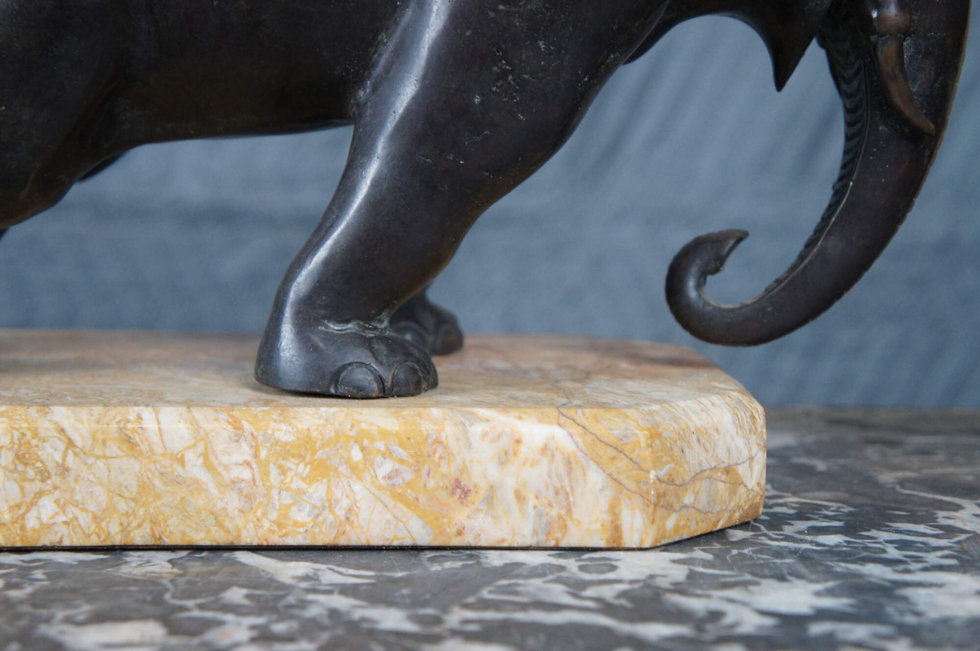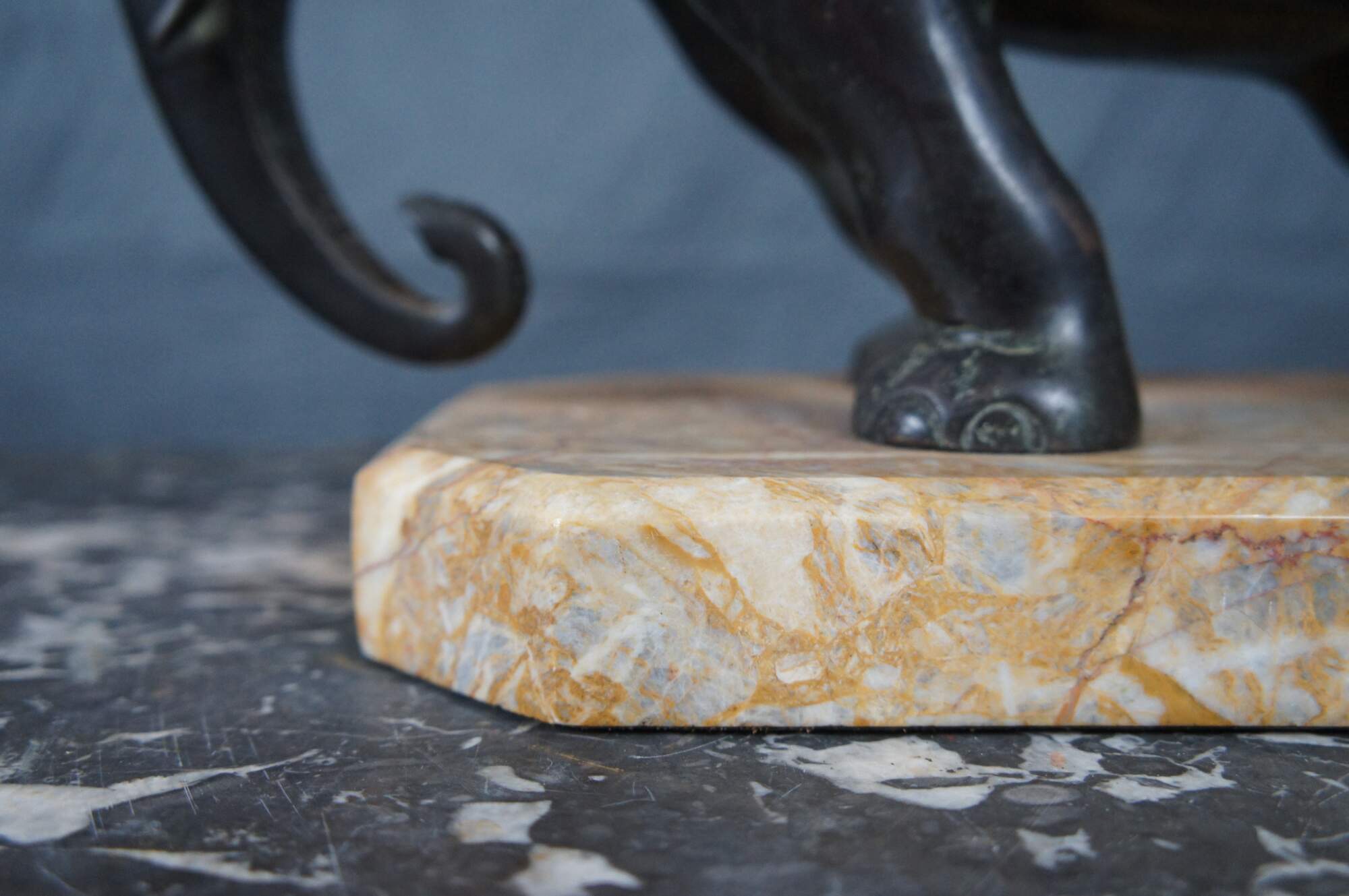 Features a dark brown patina, set on an attractive amber coloured shaped marble plinth bases.