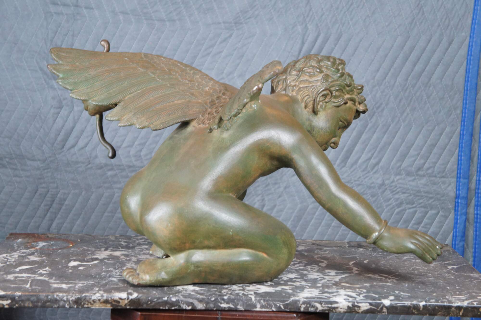 Features a winged cherub / putti in the kneeling postion with ab outstretched arm and bow. Signed along the side of the left foot. The bronze has a beautiful verdigris patina.