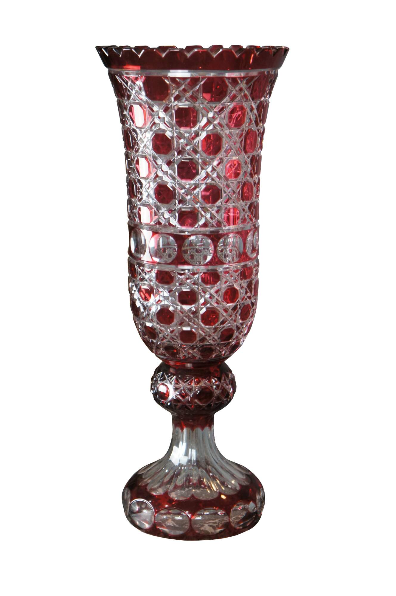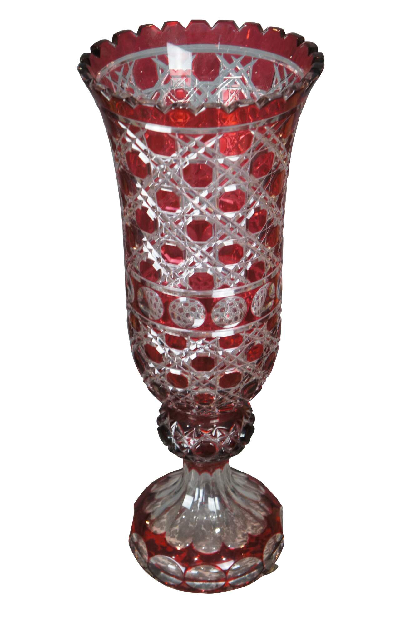An impressive vintage Bohemian ruby cut to clear crystal vase. Features a coin dot and lattice pattern with sawtooth flared mouth. The vases is poised on a footed base.