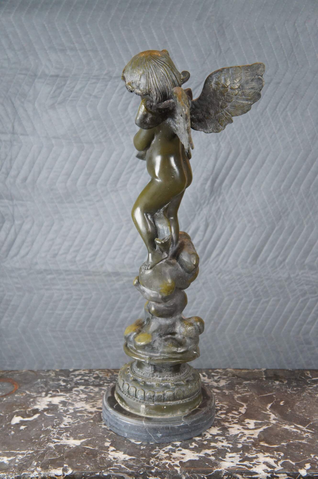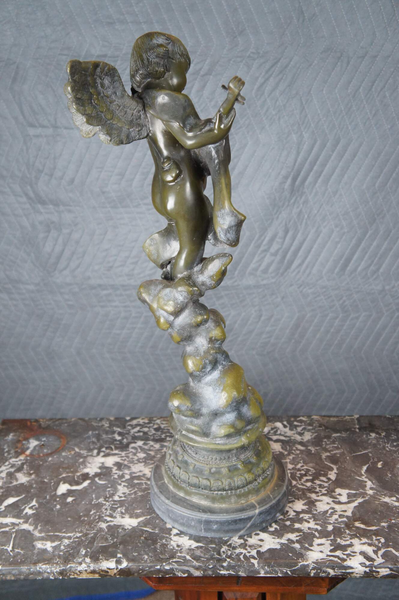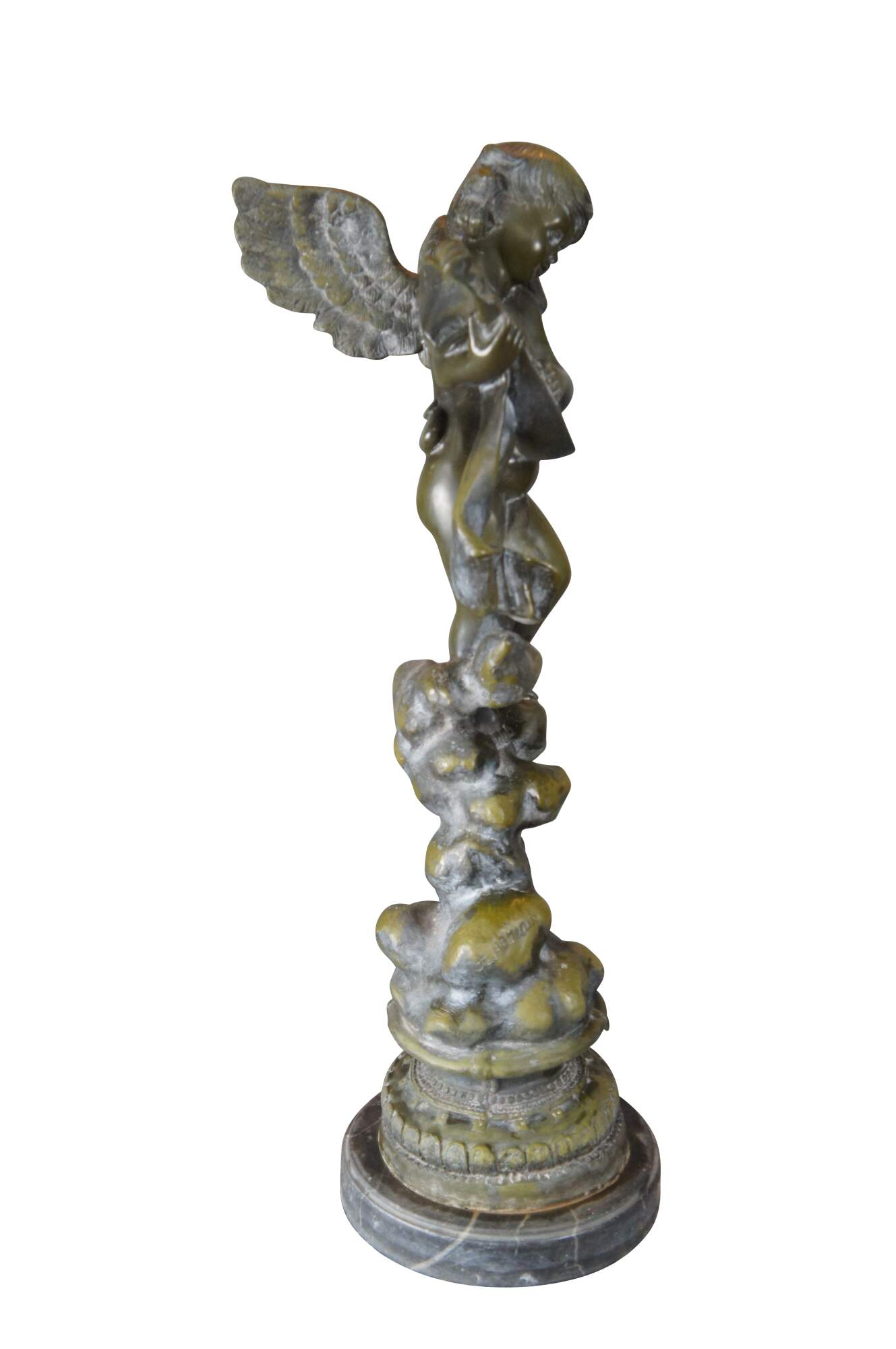 Large verdigris bronze of an angel playing a mandoling over rocks. After A. Moreau, circa mid 20th century. The bronze is mounted to marble plinthe.