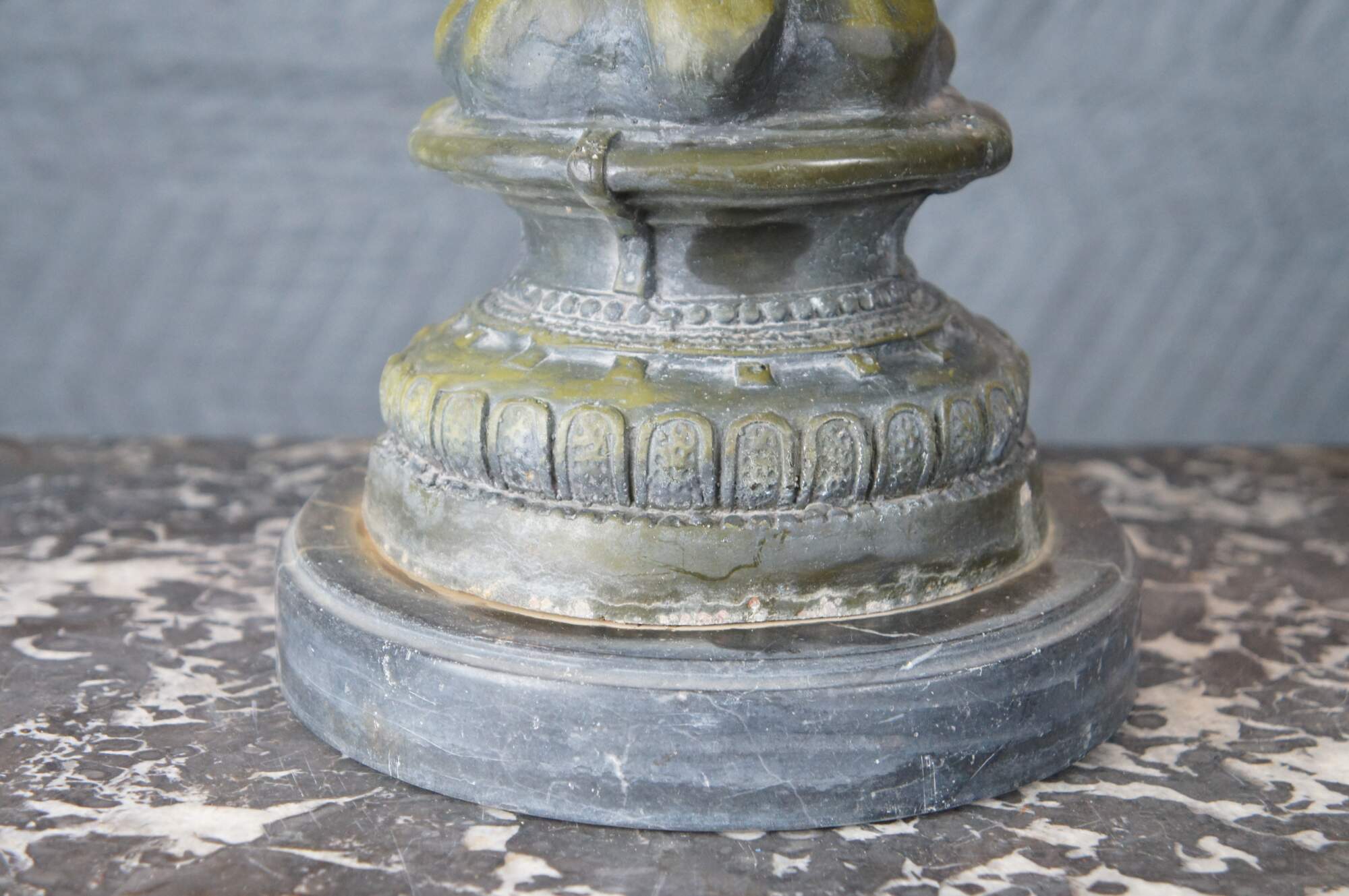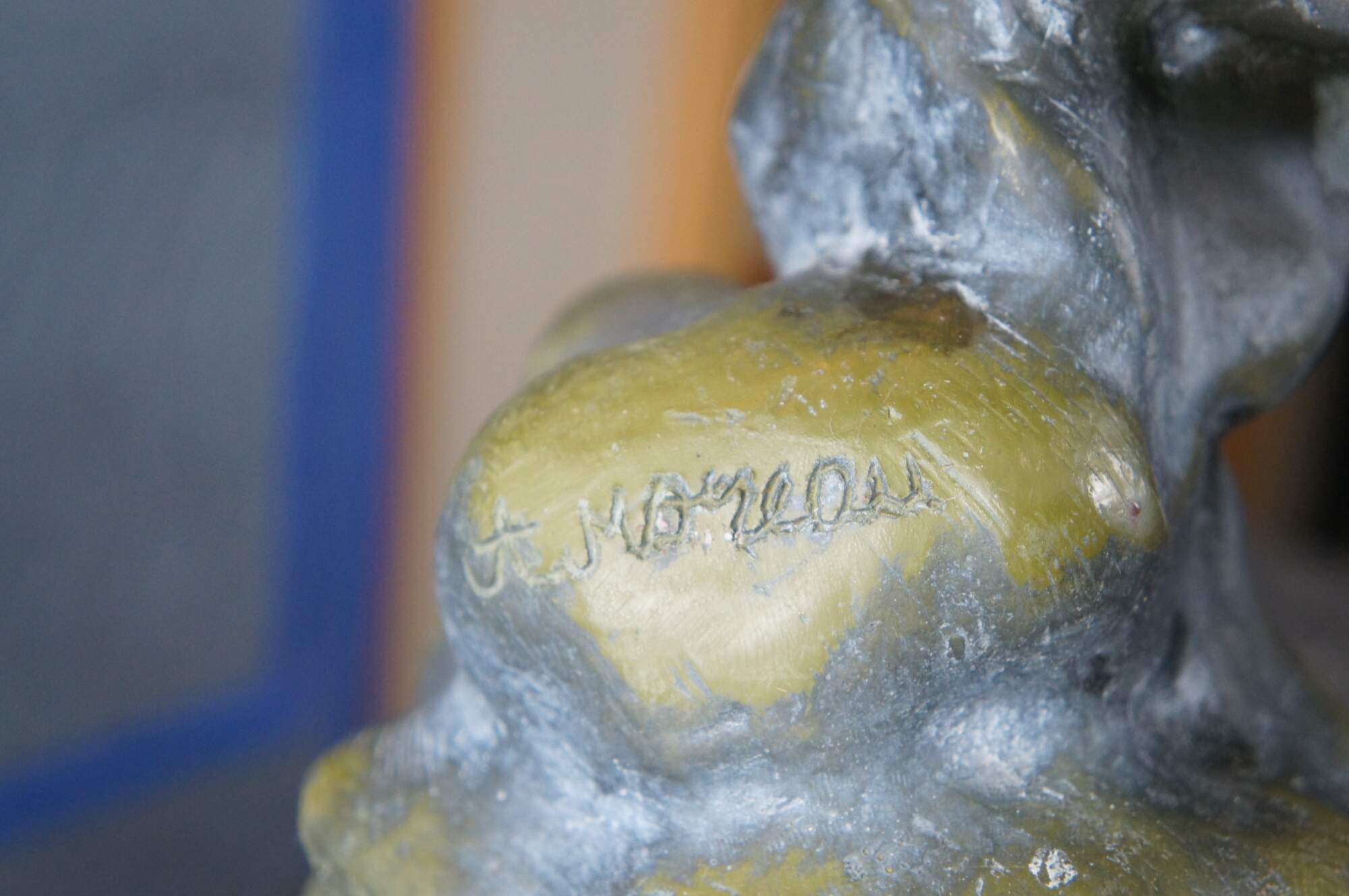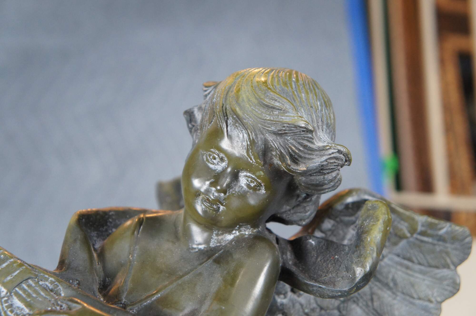 Large verdigris bronze of an angel playing a mandoling over rocks. After A. Moreau, circa mid 20th century. The bronze is mounted to marble plinthe.