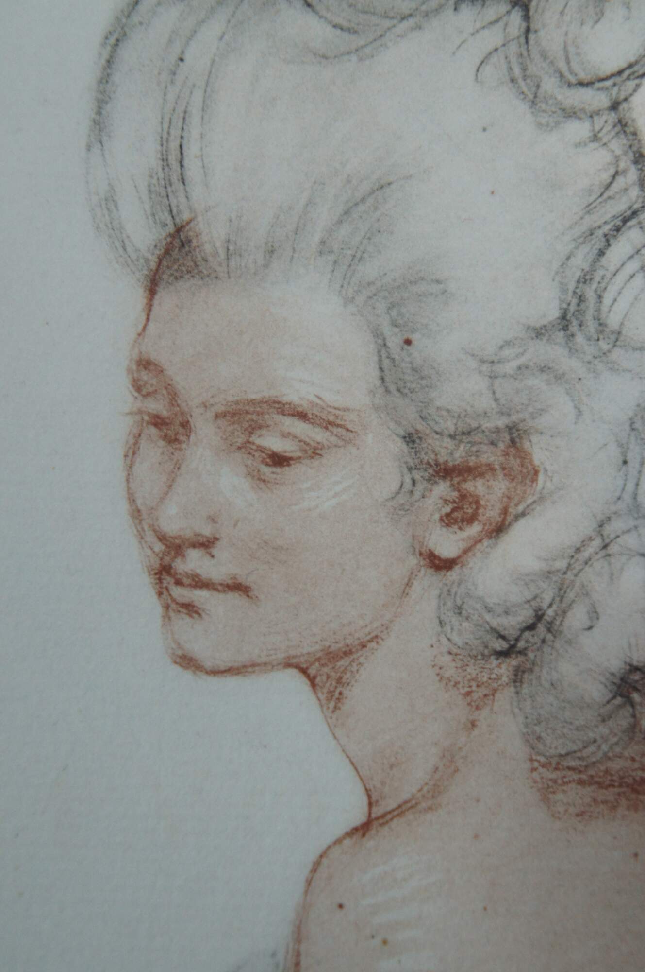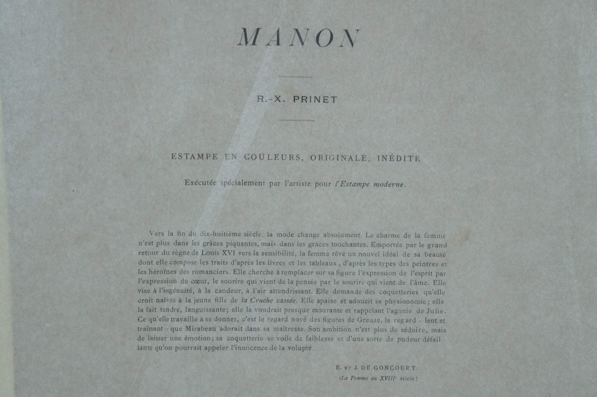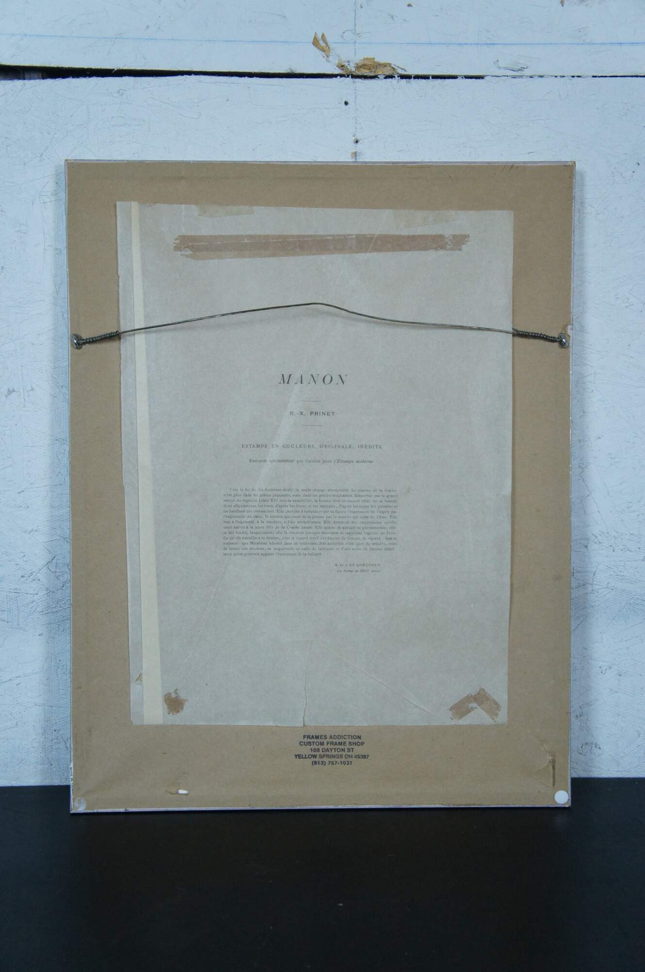 Late 19th century antique color lithograph print titled "Manon" by Rene-Xavier Francois Prinet. Shows a female figure with tall Pompador hair do, seated, looking over her left shoulder, dressed in a loose white chemise. Giltwood frame with raised foliate detail; mottled gray mat. Lithograph on wove paper. Signed on the plate lower right margin. L’Estampe Moderne’s blind stamp on the bottom right corner. Published by Masson & Piazza, Paris.