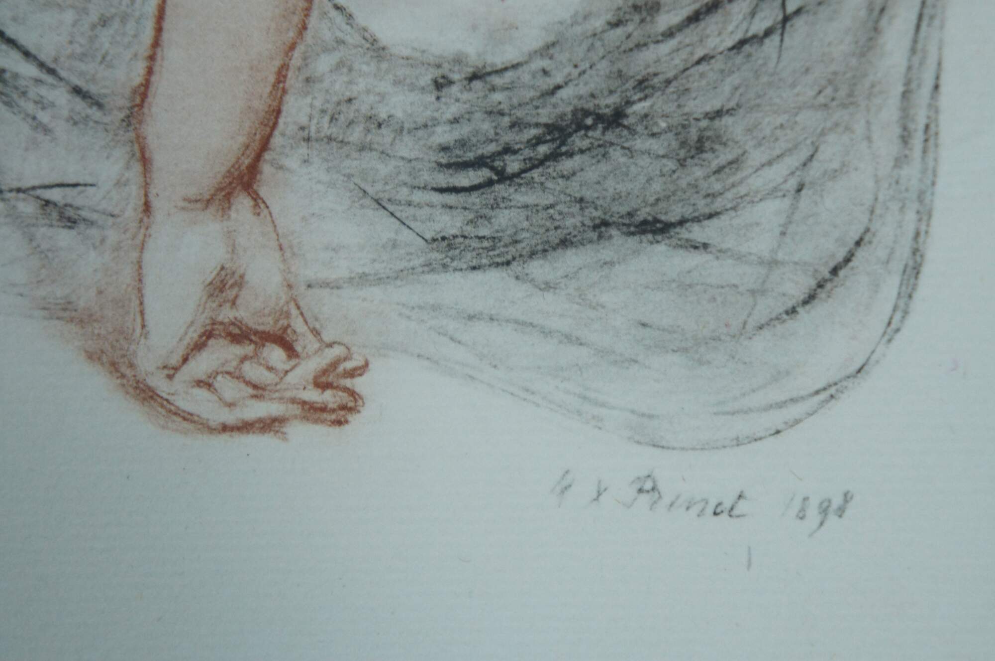 In the 1890s various fascicles of original prints were issued by French publishers. L’Estampe originale was a quarterly edited by André Marty between 1893 and 1895 - the original L’estampe moderne was published in five folios between November 1895 and March 1896 edited by Loÿs Delteil - the second L’Estampe Moderne was published monthly between May 1897 and April 1899. The publication was edited by Charles Masson and H. Piazza. Each issue came in a paper cover bearing an original lithograph by Alphonse Mucha. The publisher offered two extra lithographs a year, the "planches de prime", as an incentive to prospective subscribers. The aim was to promote the art of printmaking by commissioning images from noted Art Nouveau artists, such as Alphonse Mucha, Louis Rhead, Marcel-Lenoir, Henri Boutet, Henri Fantin-Latour, Edward Burne-Jones and Théophile Steinlen." (Source: Wikipedia)