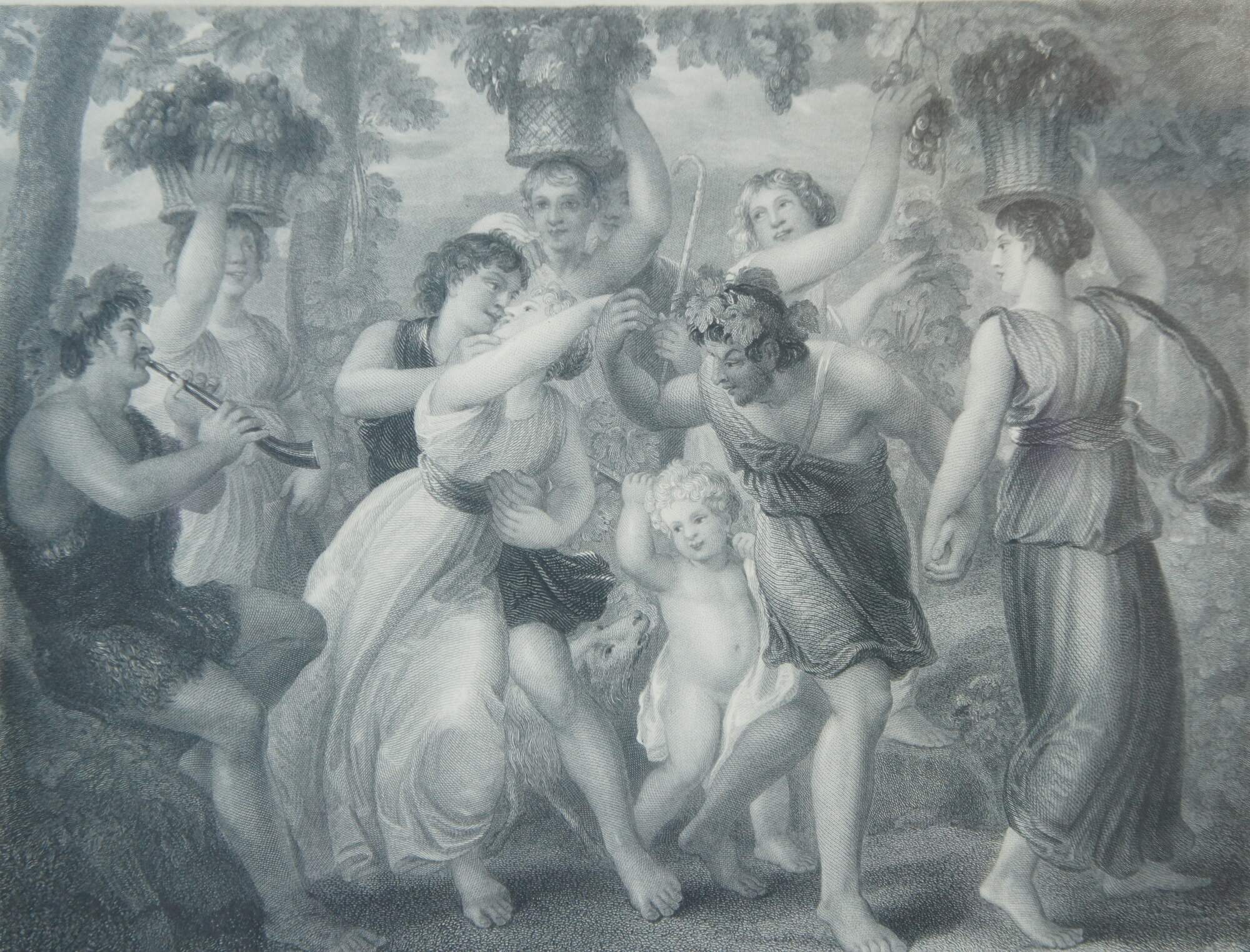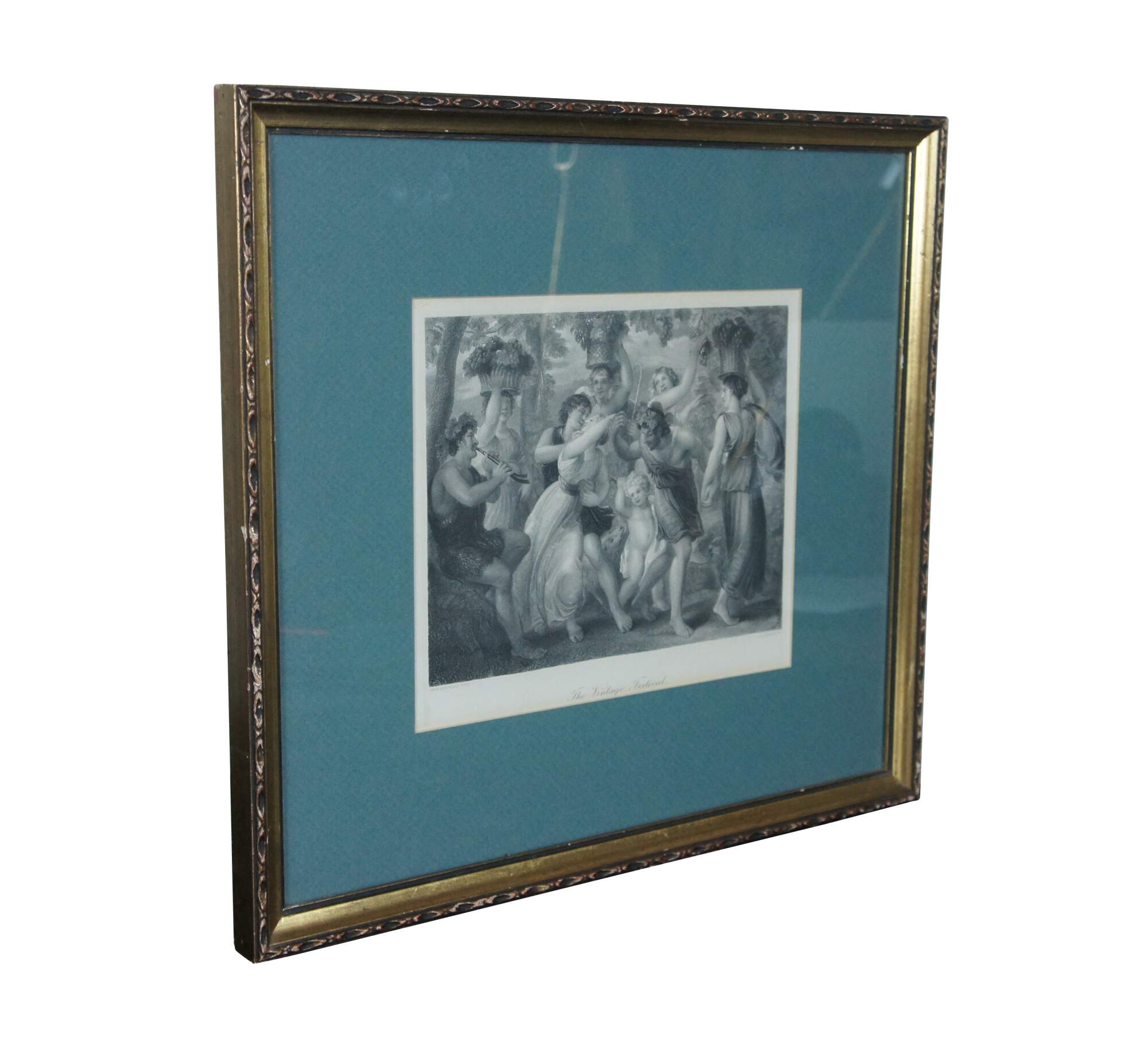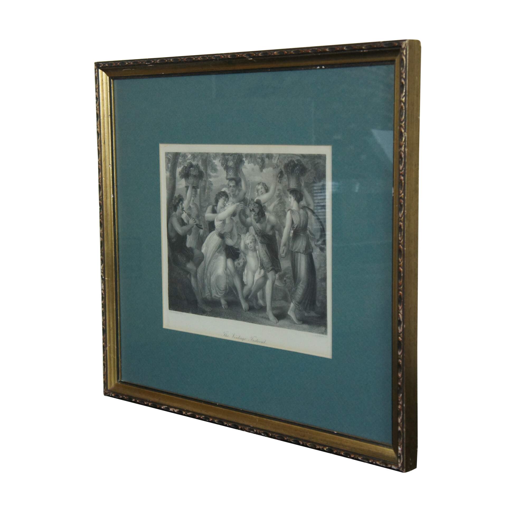 Late 19th century neoclassical engraving titled "The Vintage Festival" by Thomas Stothard, engraved by Thomas Garner, published by George Barrie. Shows a Greek / Roman festival scene / bacchanal of male and female figures dancing with baskets of grapes. Beveled giltwood frame with distressed carved edge; turquoise blue mat.