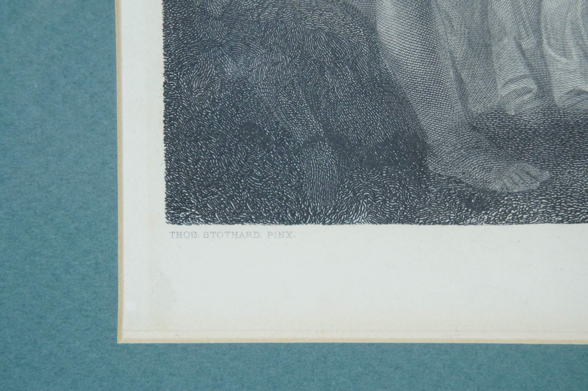"Thomas Stothard RA (17 August 1755 – 27 April 1834) was a British painter, illustrator and engraver. Stothard was born in London, the son of a well-to-do innkeeper in Long Acre. A delicate child, he was sent at the age of five to a relative in Yorkshire, and attended school at Acomb, and afterwards at Tadcaster and at Ilford, Essex. Showing talent for drawing, he was apprenticed to a draughtsman of patterns for brocaded silks in Spitalfields. In his spare time, he attempted illustrations for the works of his favourite poets. Some of these drawings were praised by James Harrison, the editor of the Novelist's Magazine. Stothard's master having died, he resolved to devote himself to art.