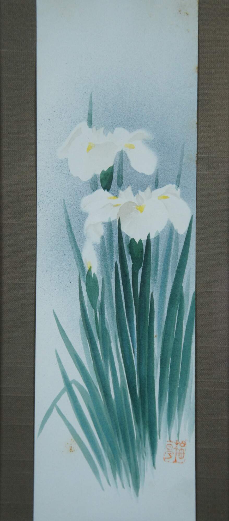 Vintage Japanese print of a strand of white irises in a blue background. Artist stamp in lower right corner. Light gray painted carved frame; brown linen mat.