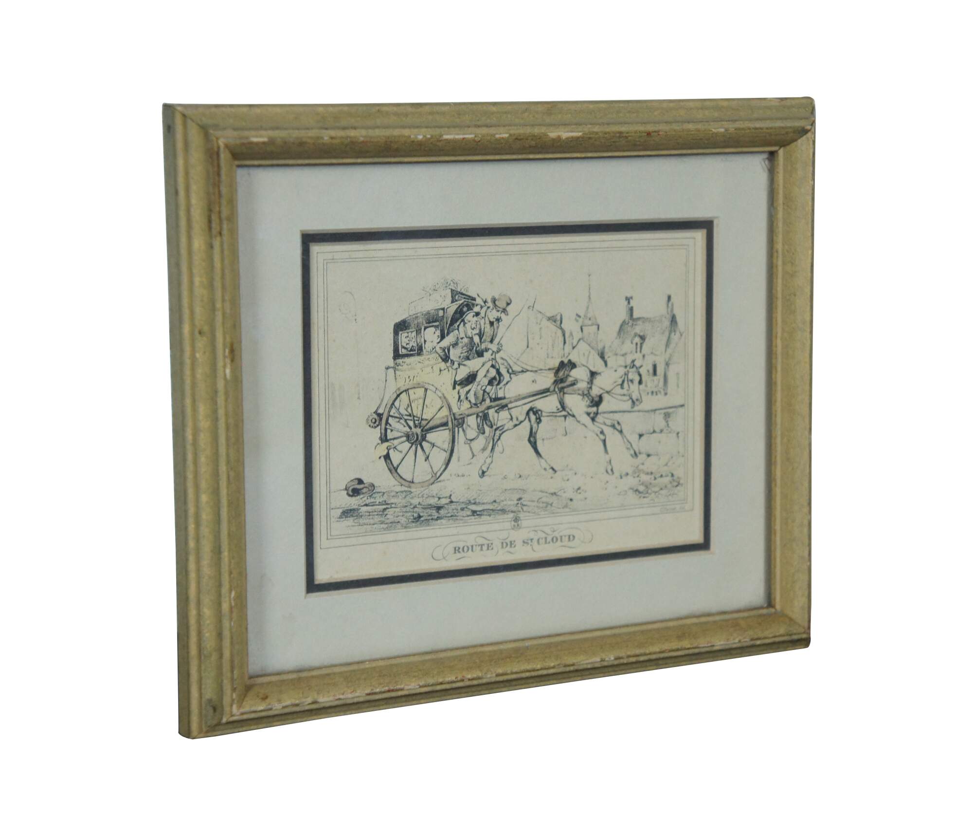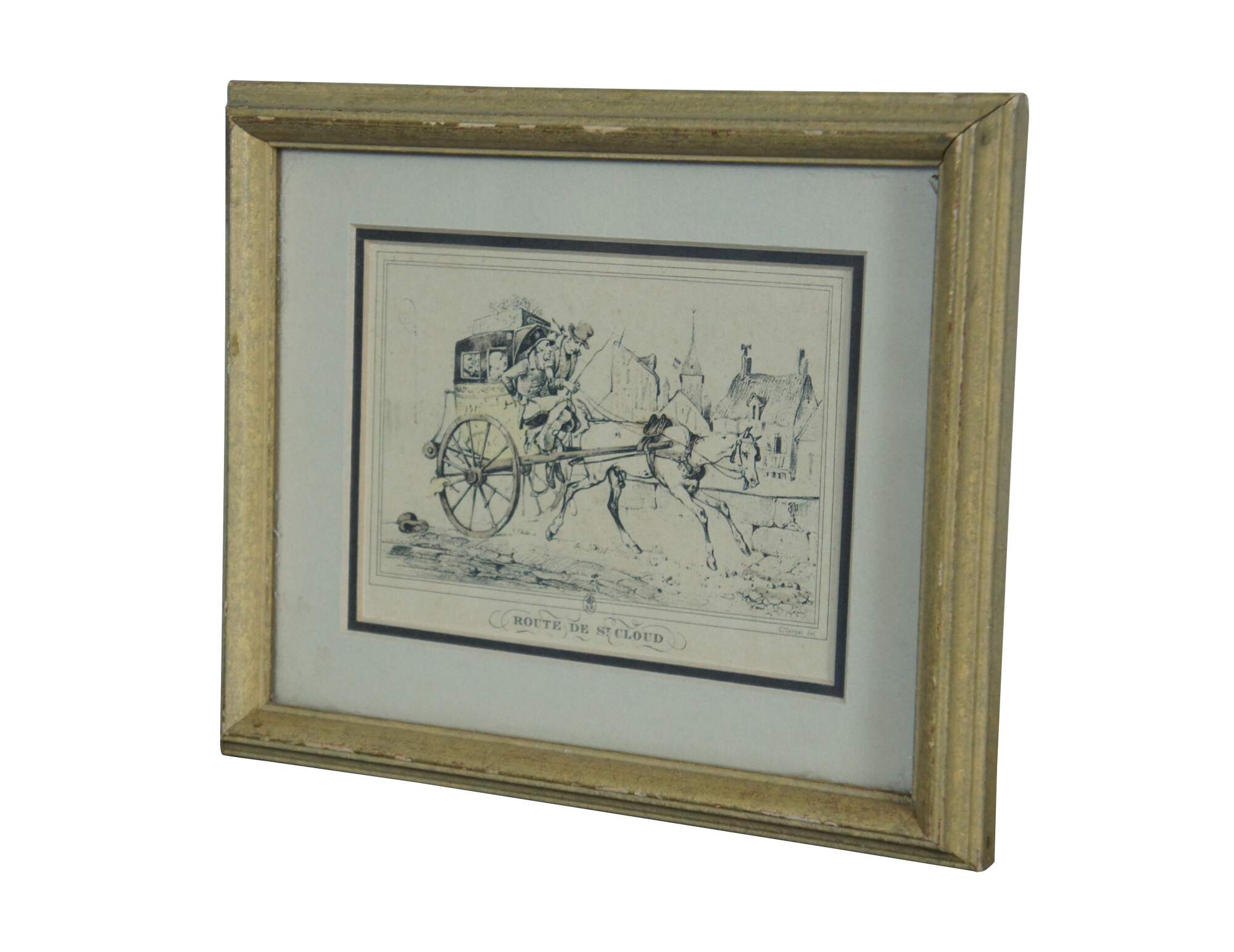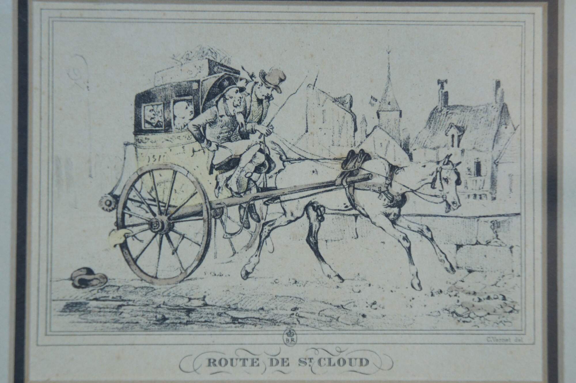 Early 19th century French aquatint engraving titled "Route de St. Cloud" after Carle Vernet's series Scènes de la vie quotidienne, Route et Chemins (Scenes of Daily Life, Roads and Paths). It features a equestrian scene with horse pulling carriage / buggy packed with passengers along a cobbled stone road. Published circa 1816 by Bance. Marked with a crowned BR in an oval, mimicking a British Royal cypher. Giltwood frame with raised bevel; off white and black layered mat.