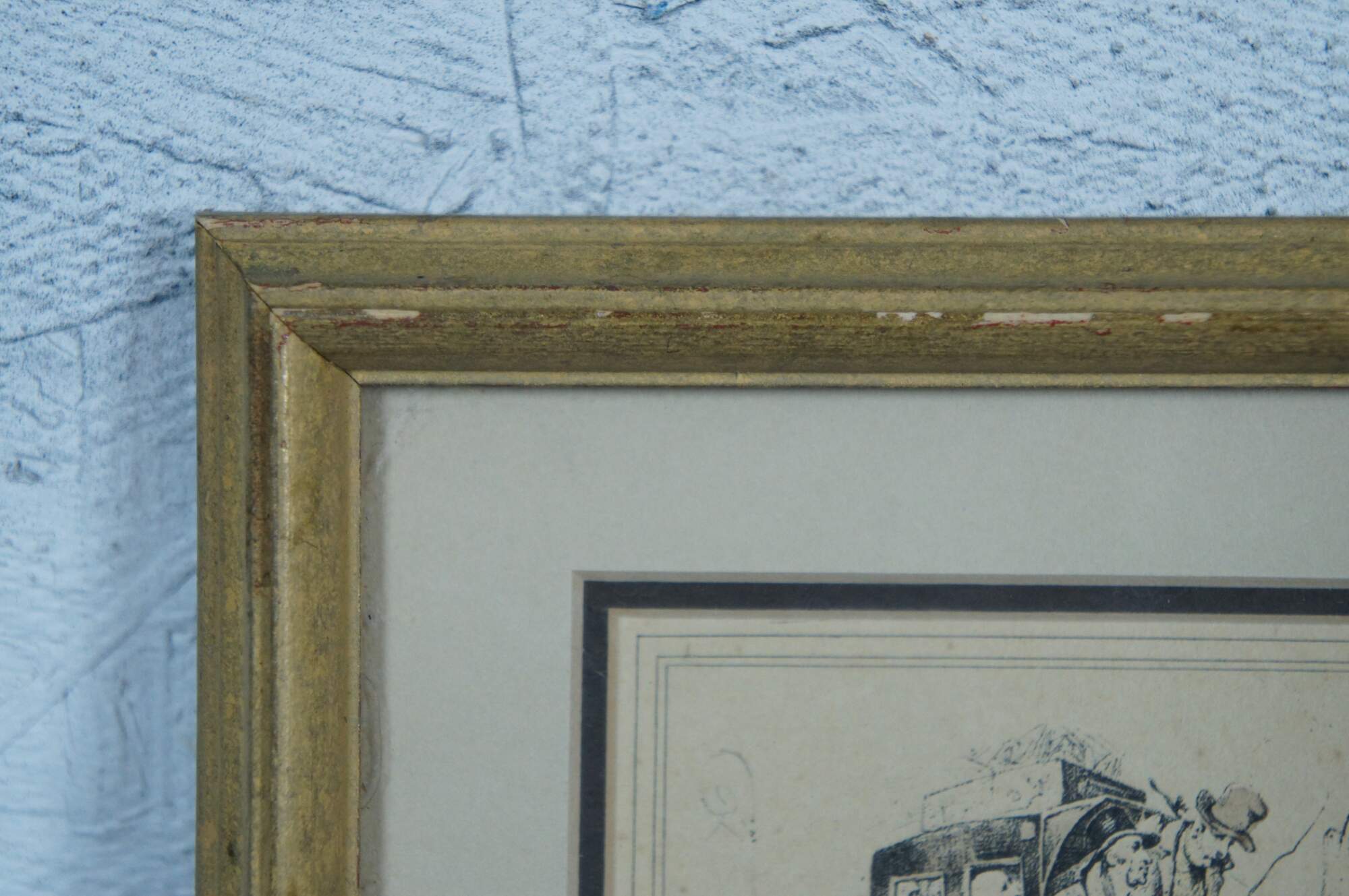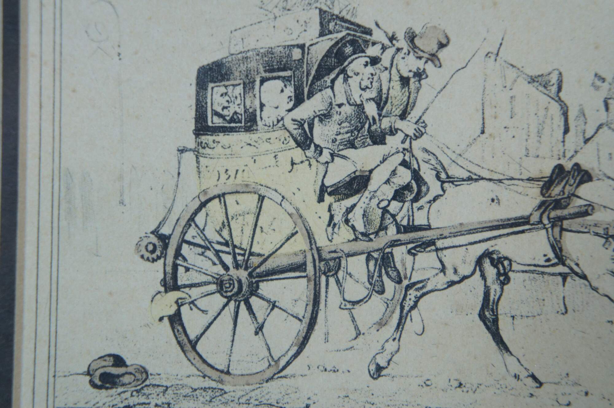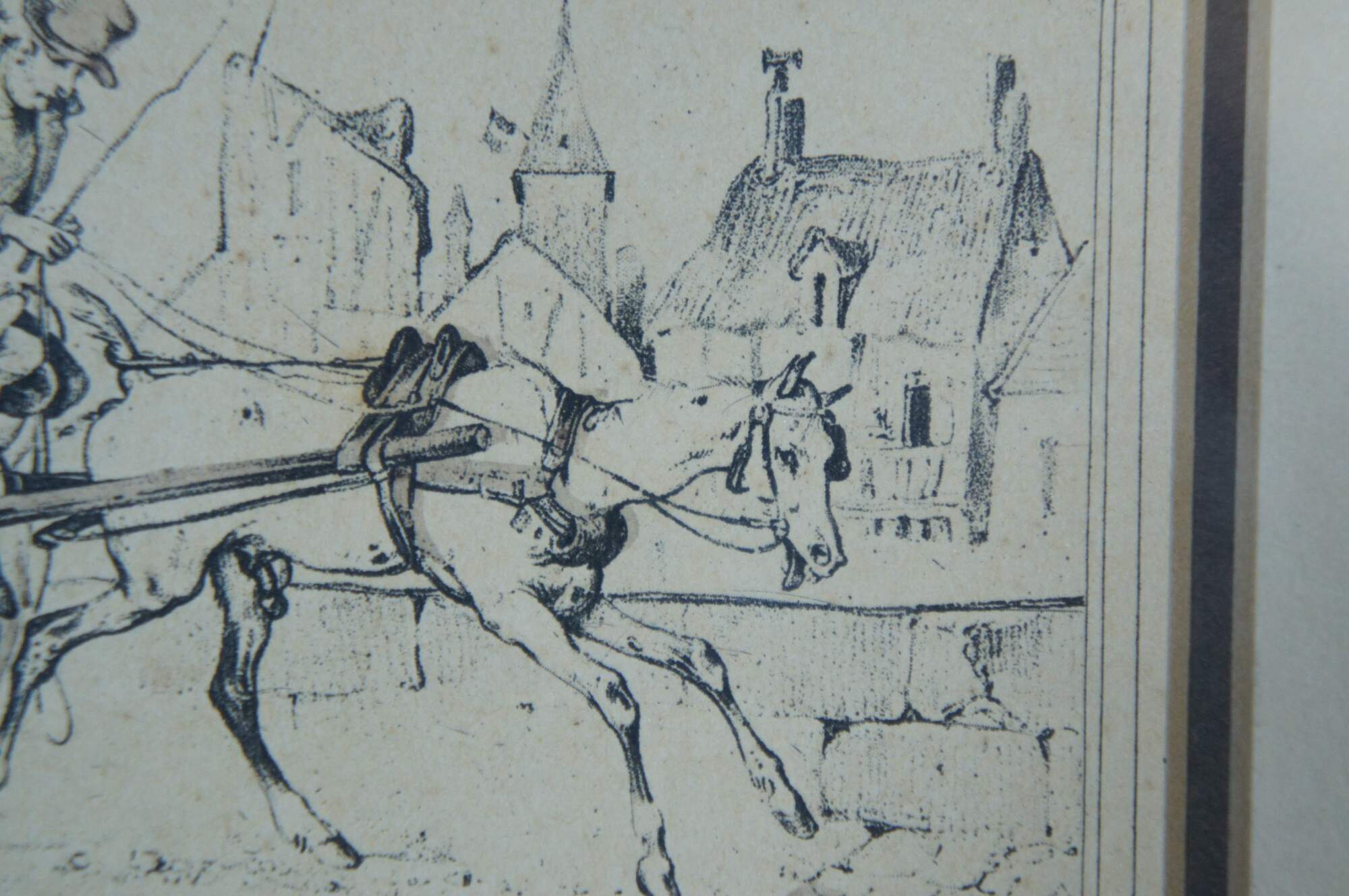 Early 19th century French aquatint engraving titled "Route de St. Cloud" after Carle Vernet's series Scènes de la vie quotidienne, Route et Chemins (Scenes of Daily Life, Roads and Paths). It features a equestrian scene with horse pulling carriage / buggy packed with passengers along a cobbled stone road. Published circa 1816 by Bance. Marked with a crowned BR in an oval, mimicking a British Royal cypher. Giltwood frame with raised bevel; off white and black layered mat.
