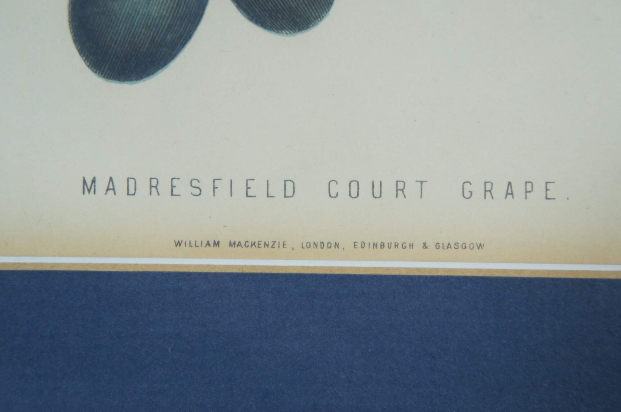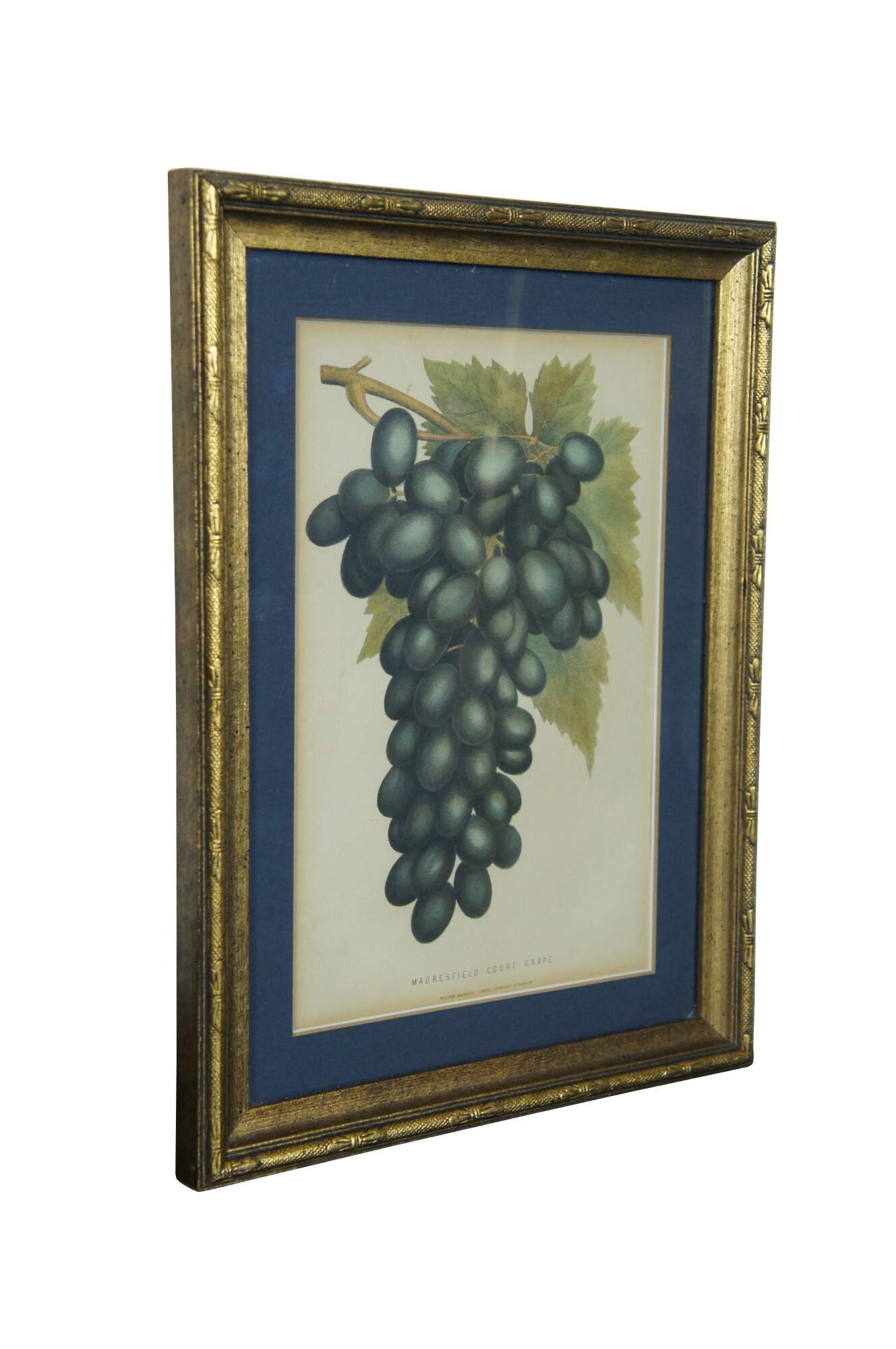 Antique circa 1870s color lithograph print of "Madresfield Court Grape" extracted from the book "The New Practical Gardener, and Modern Horticulturist," edited by James Anderson, published by William Mackenzie. Beveled giltwood frame with bunches of plumes carved along the edge; blue mat.