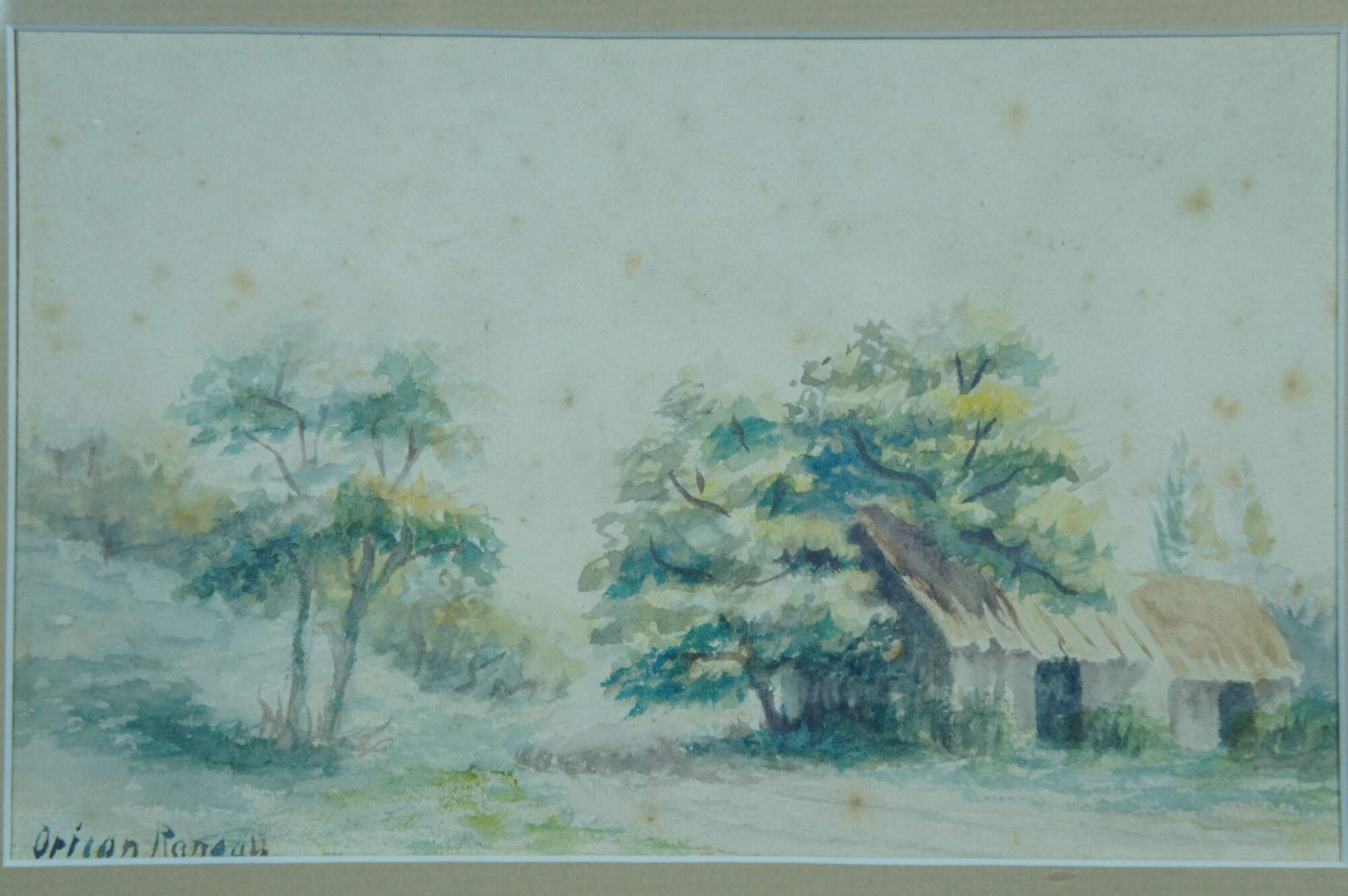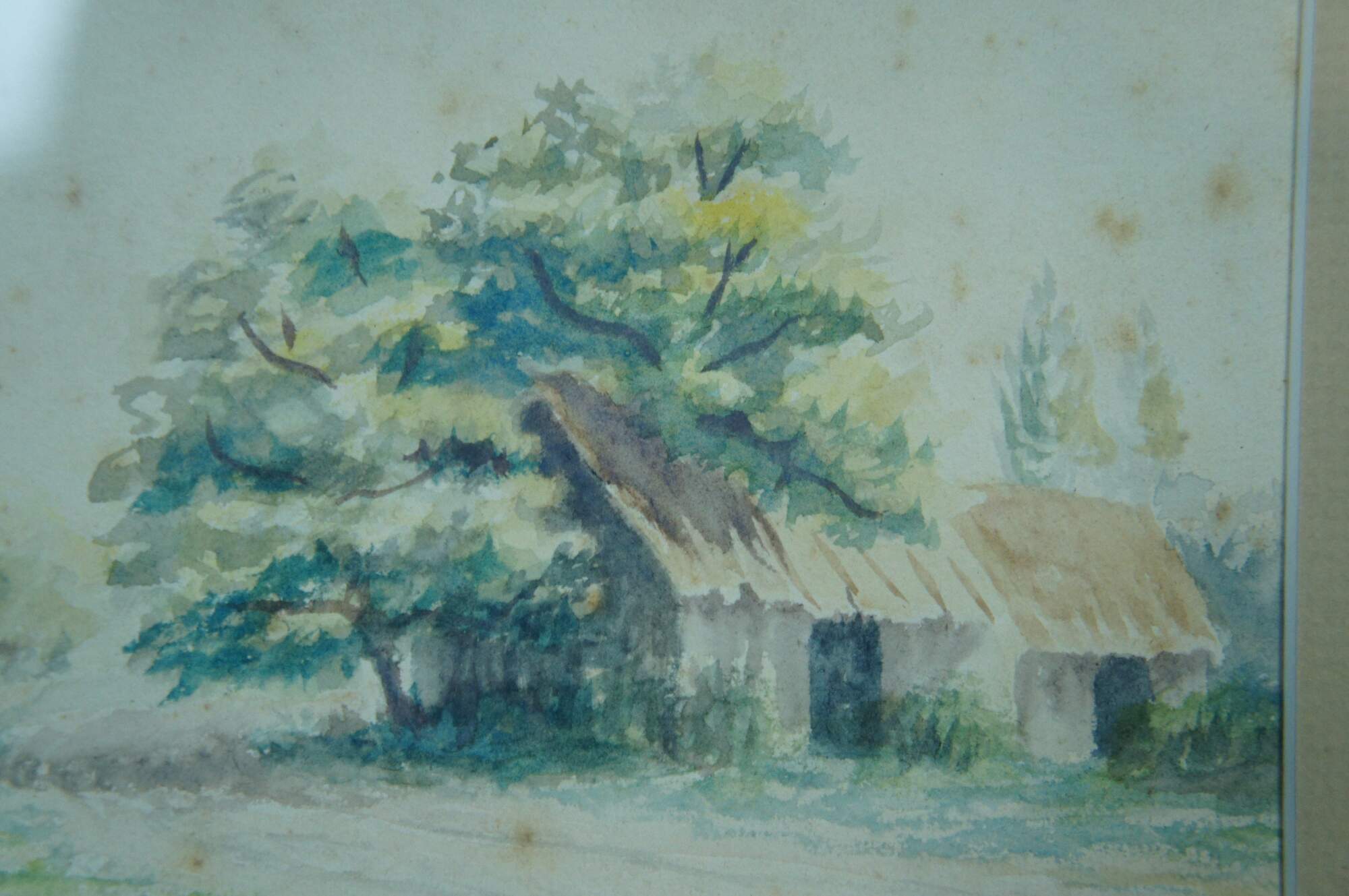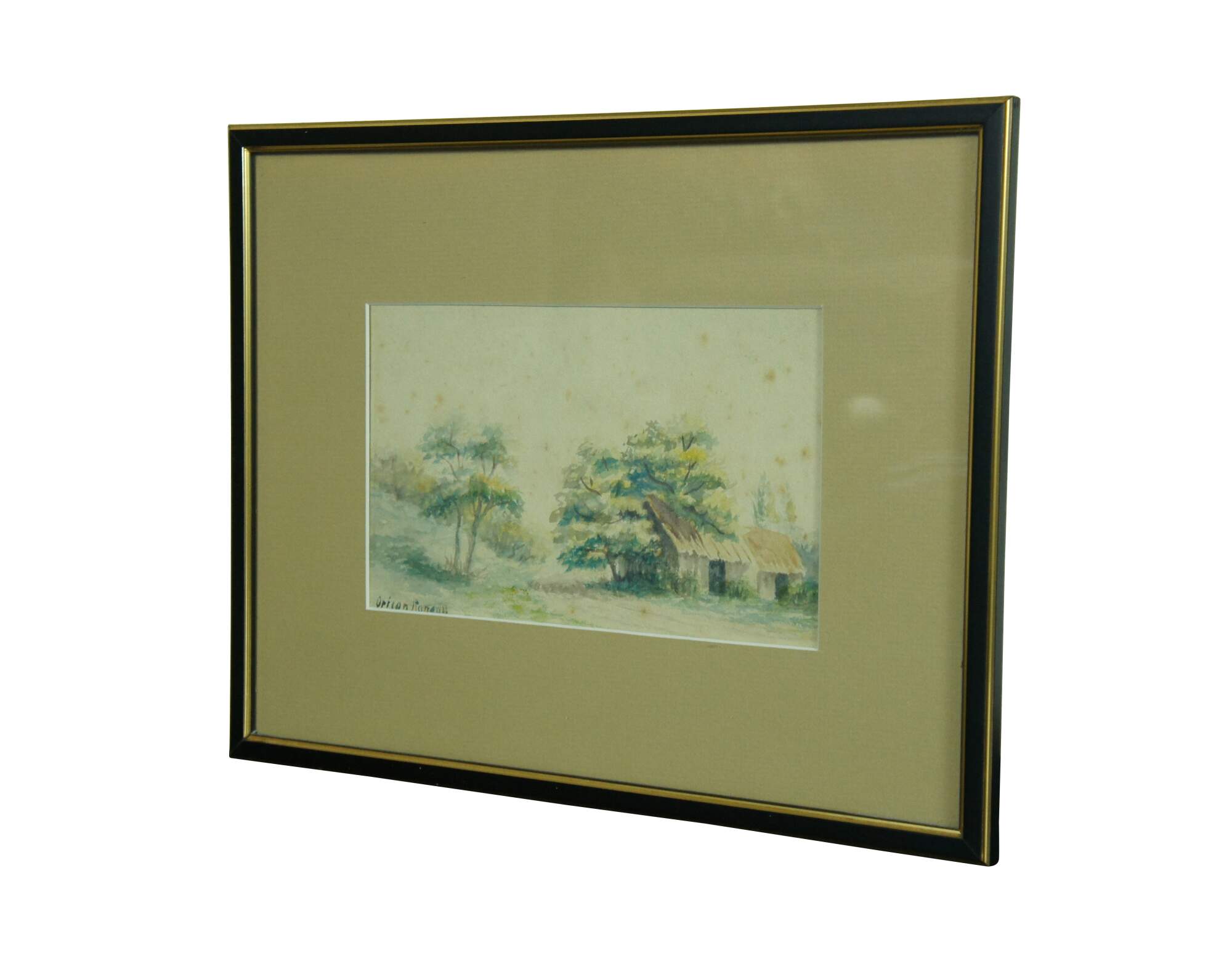 Vintage watercolor on paper country landscape painting showing a small thatched cottage / farmhouse barn and trees. Signed in lower left corner - O. Randall. Black wood frame with gilt edges; beige mat.