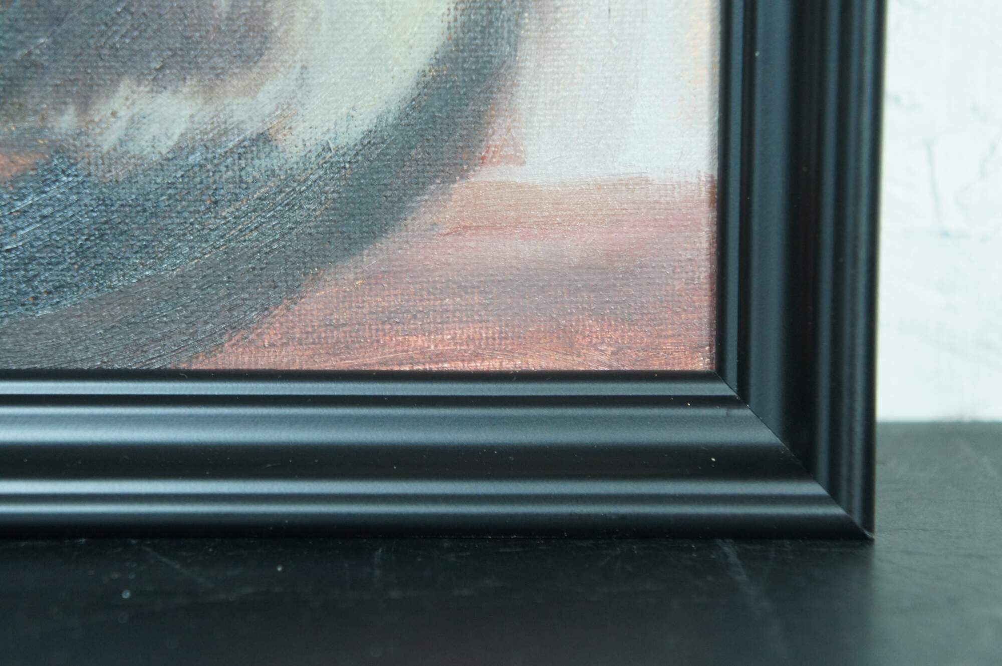 Late 20th century oil on canvas painting of a seated black cat with yellow eyes. Signed RH in lower left corner.