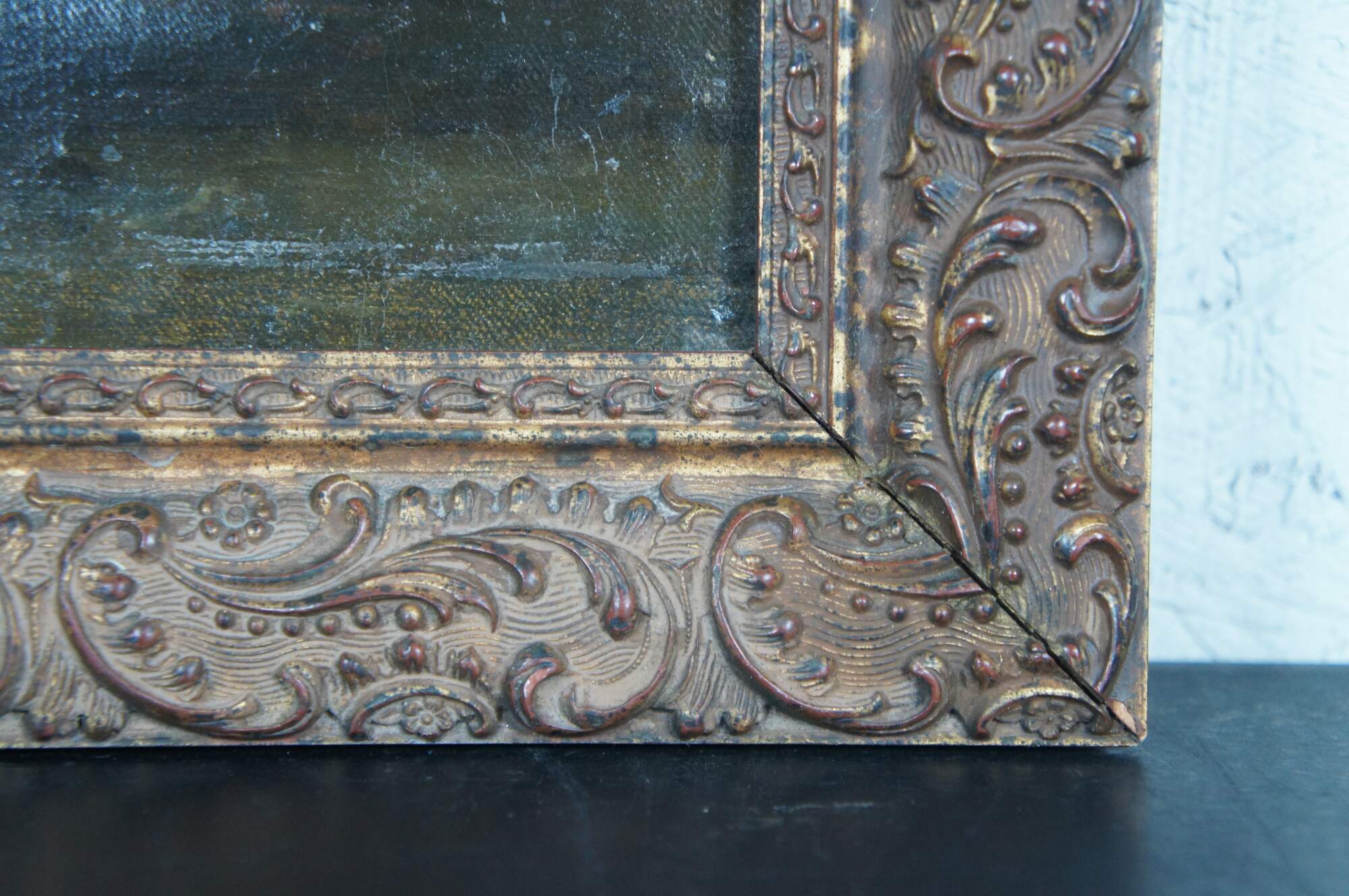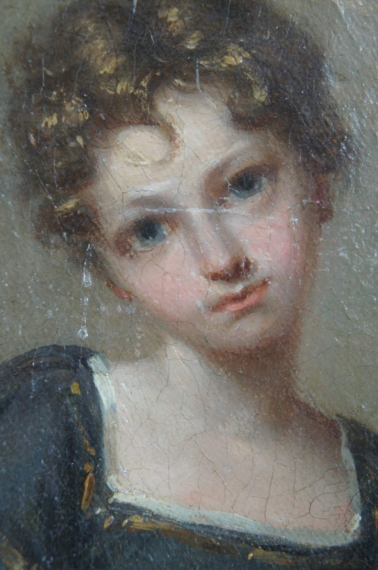 19th century antique portrait oil painting on canvas of a sassy young girl with blonde curls and large blue eyes, dressed in dark clothes, holding a hat. Gilded / distressed foliate carved frame.