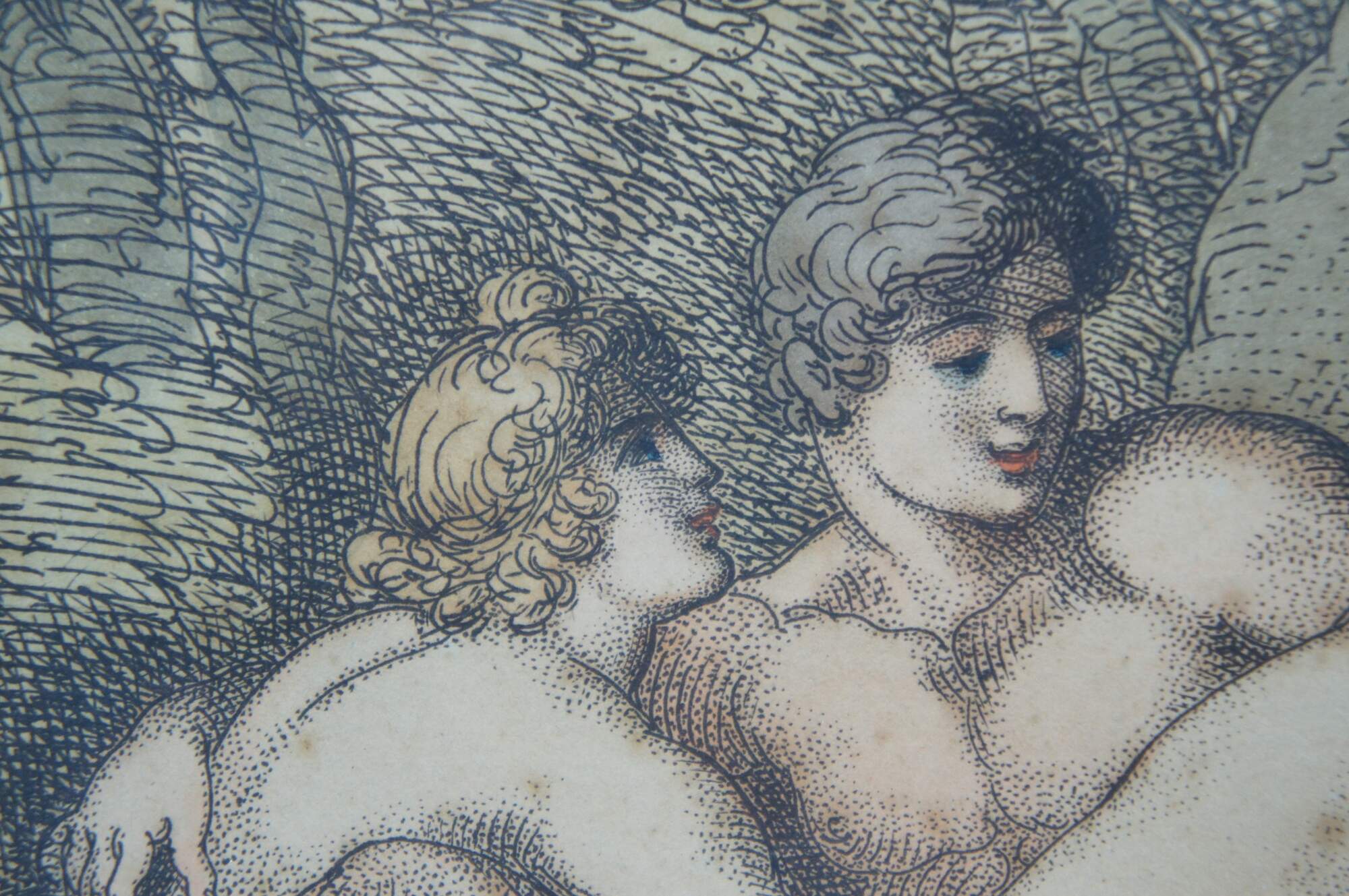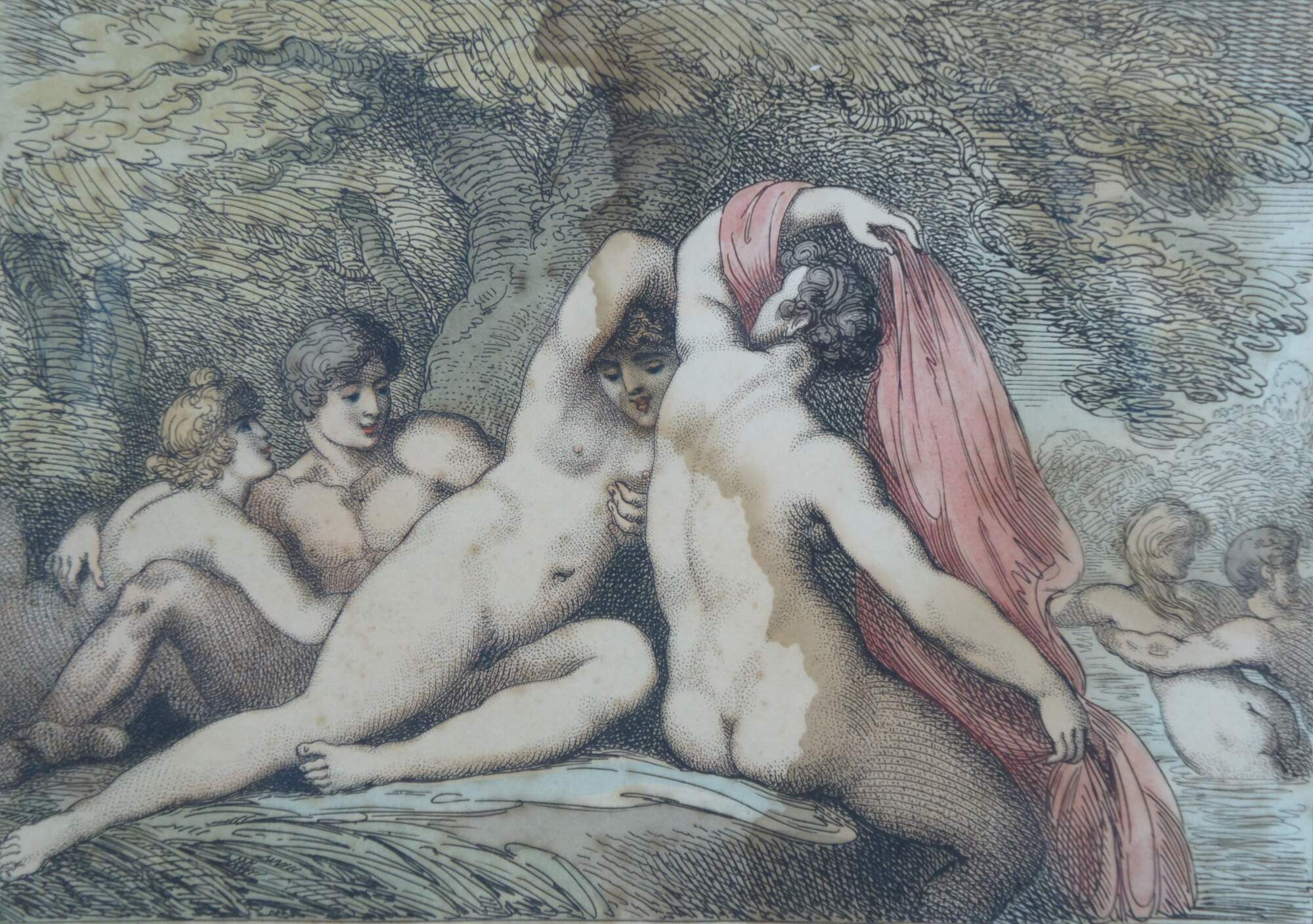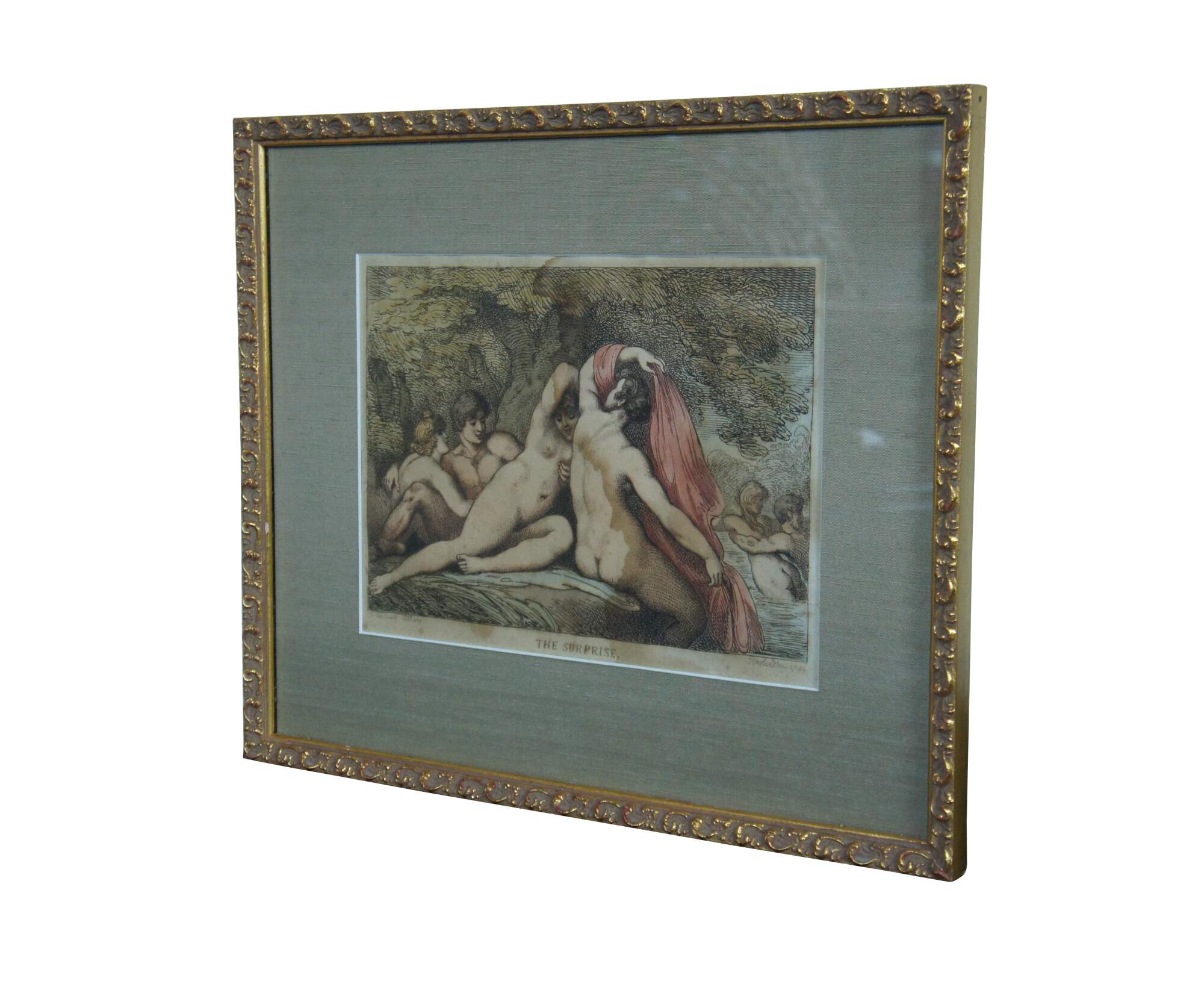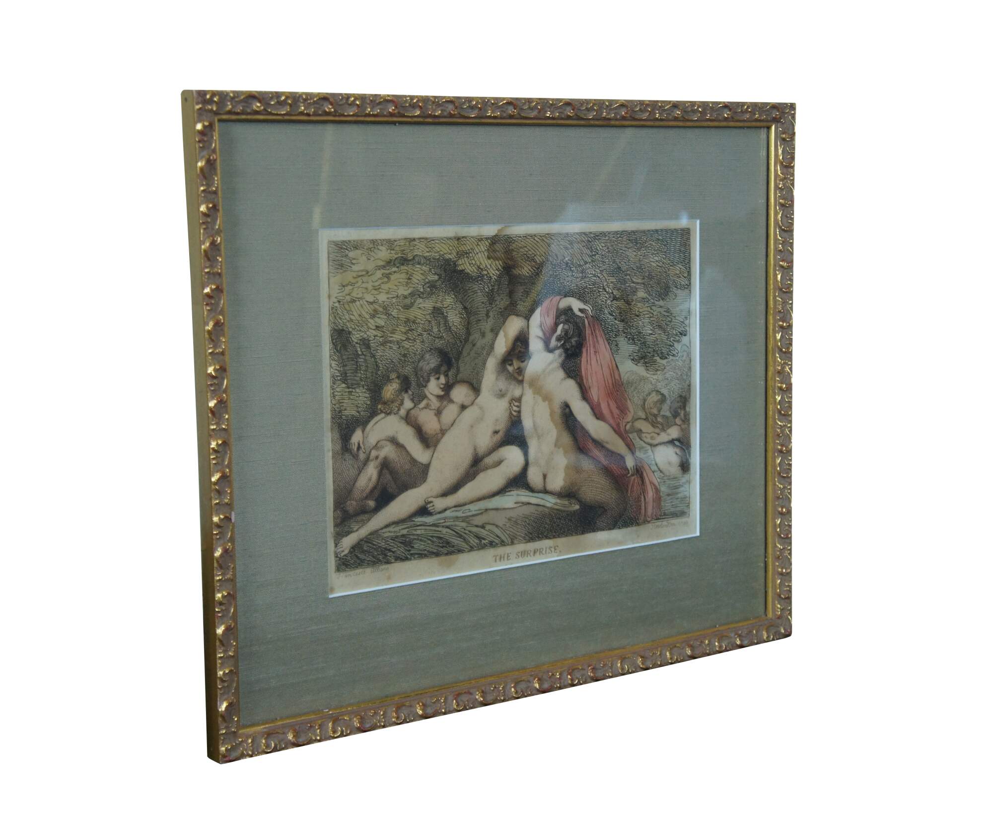 1799 hand colored erotic engraving titled "The Surprise" by Thomas Rowlandson after Francesco Albano. Shows a neoclassically inspired scene of two young, nude couples seated together on a bank under a tree, while a third couple frolicks in the lake. Foliate carved giltwood frame; sage green linen mat.