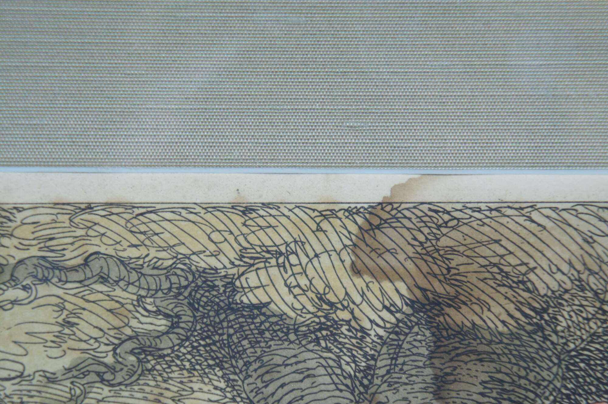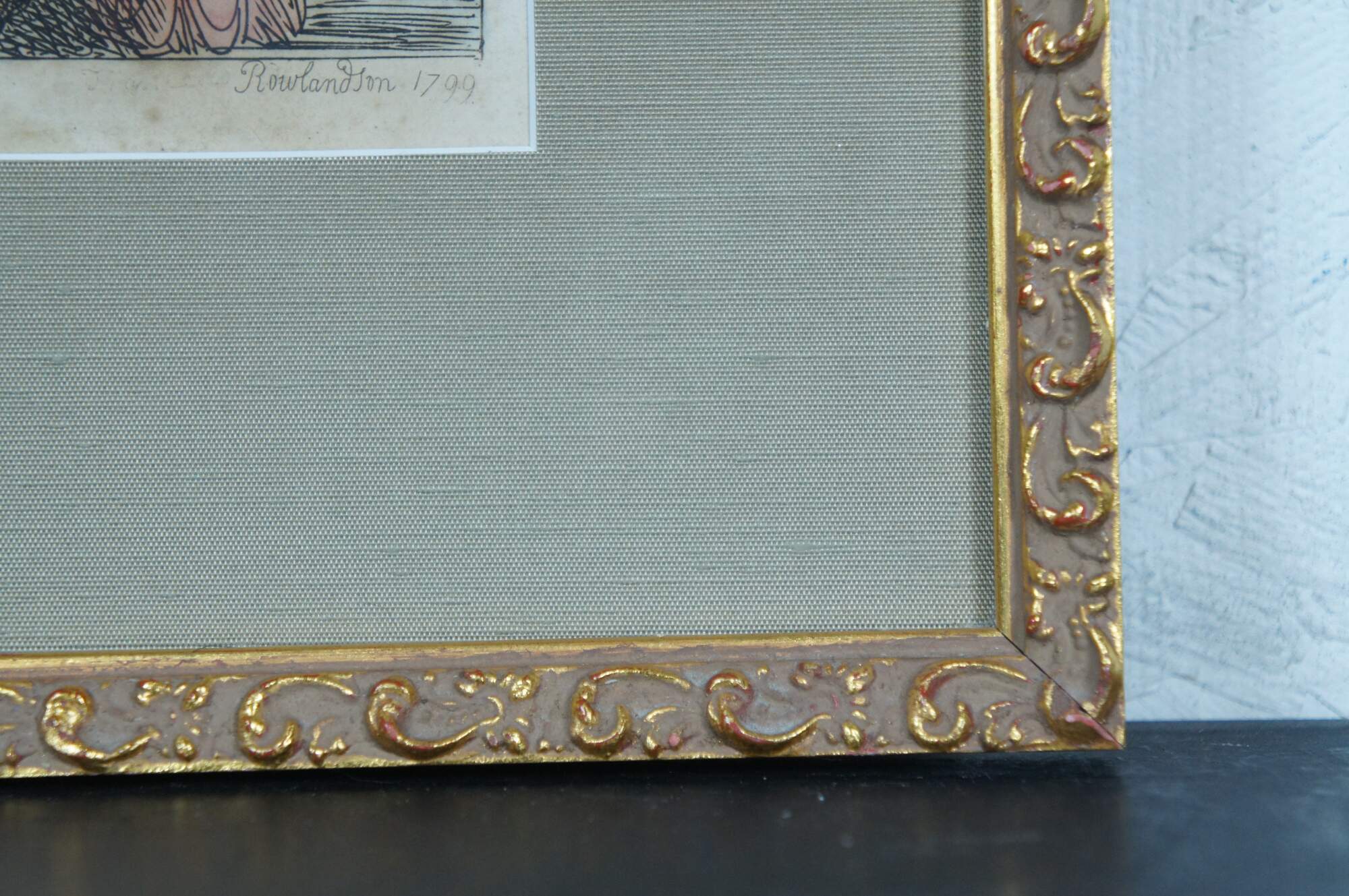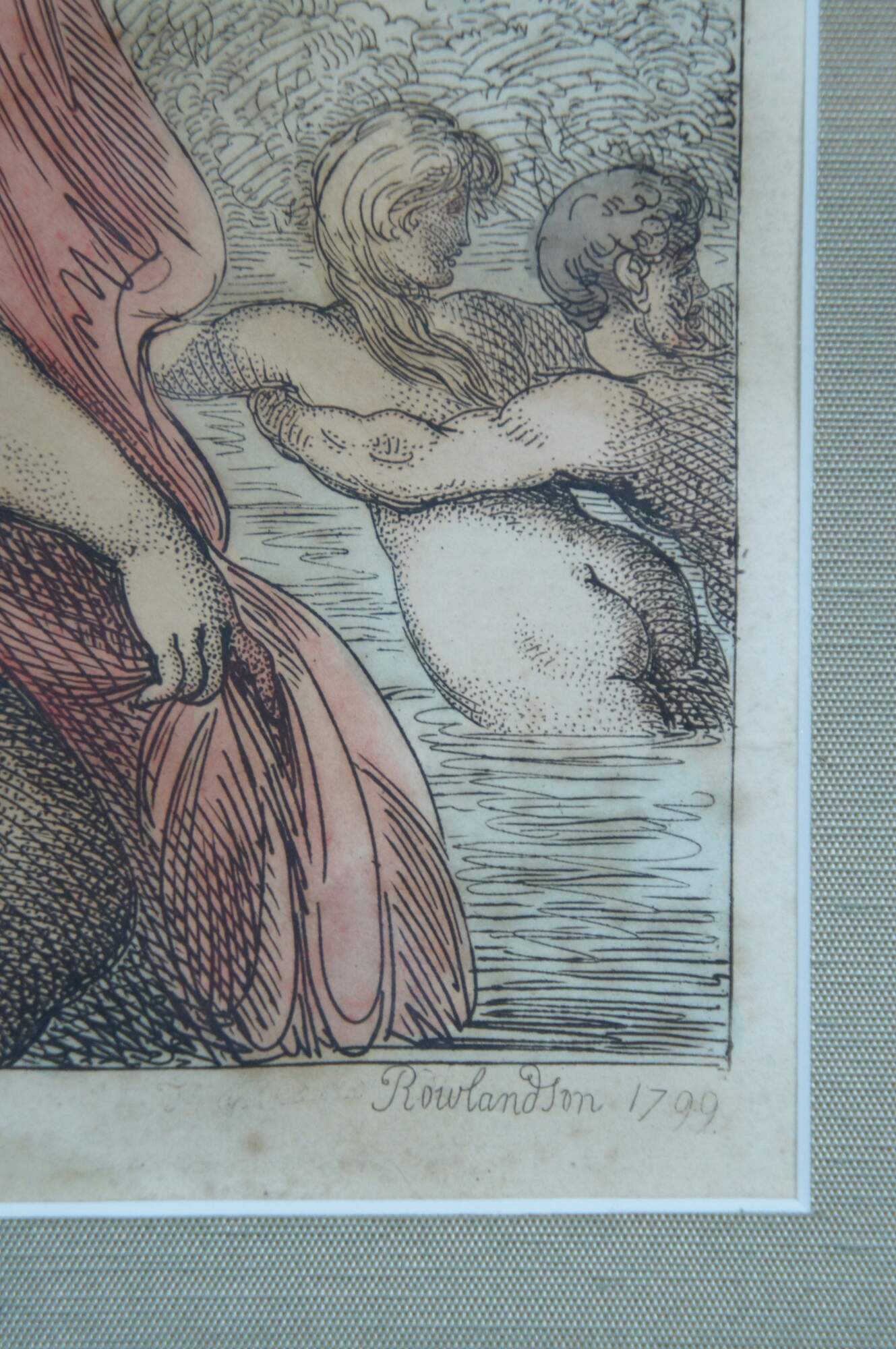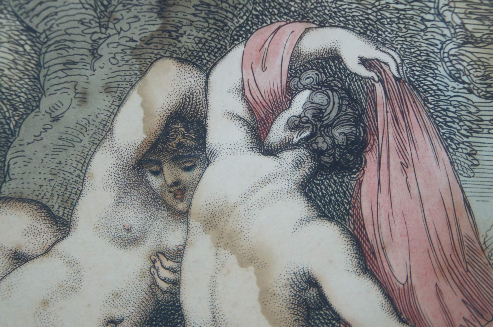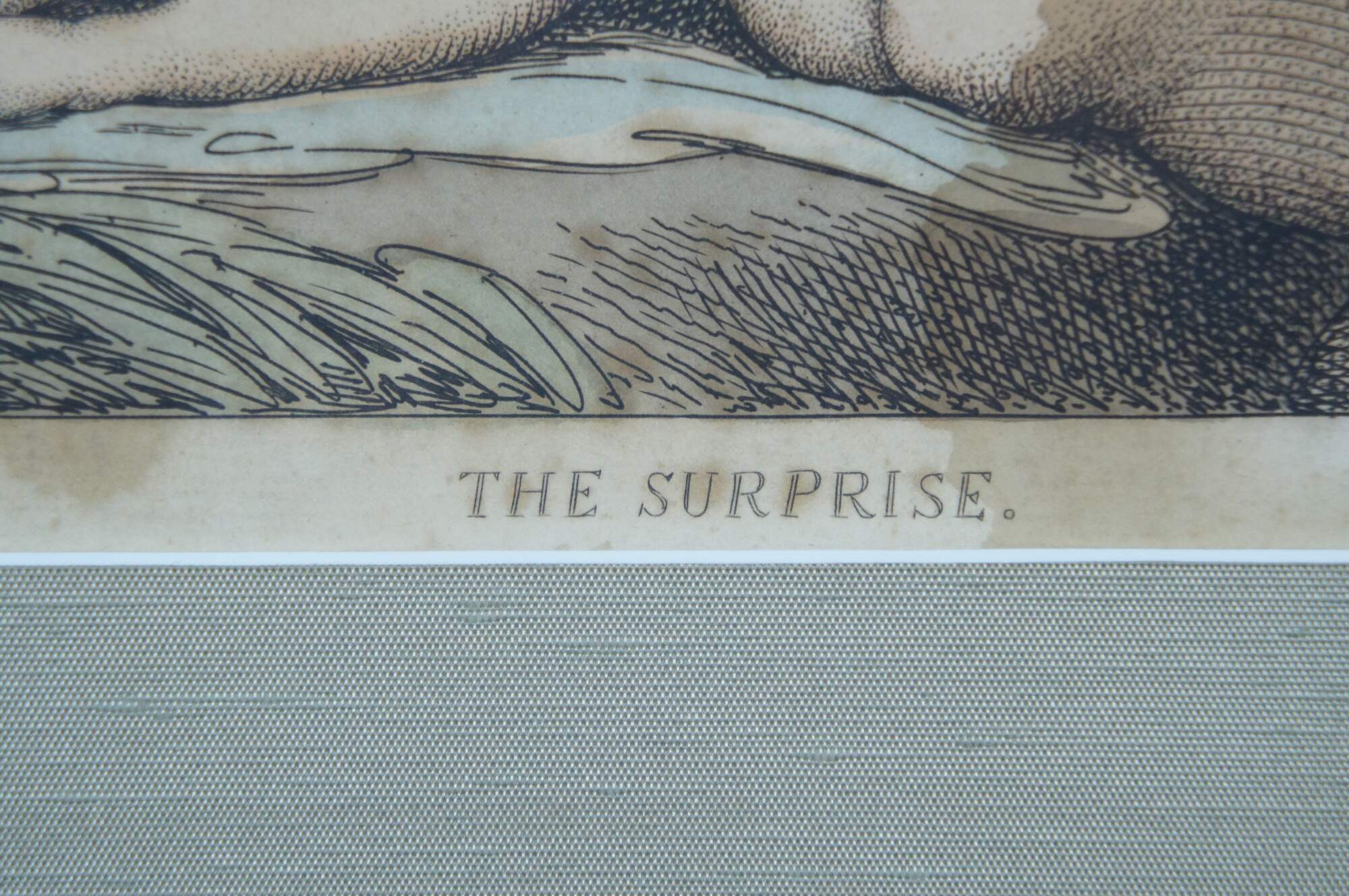 1799 hand colored erotic engraving titled "The Surprise" by Thomas Rowlandson after Francesco Albano. Shows a neoclassically inspired scene of two young, nude couples seated together on a bank under a tree, while a third couple frolicks in the lake. Foliate carved giltwood frame; sage green linen mat.