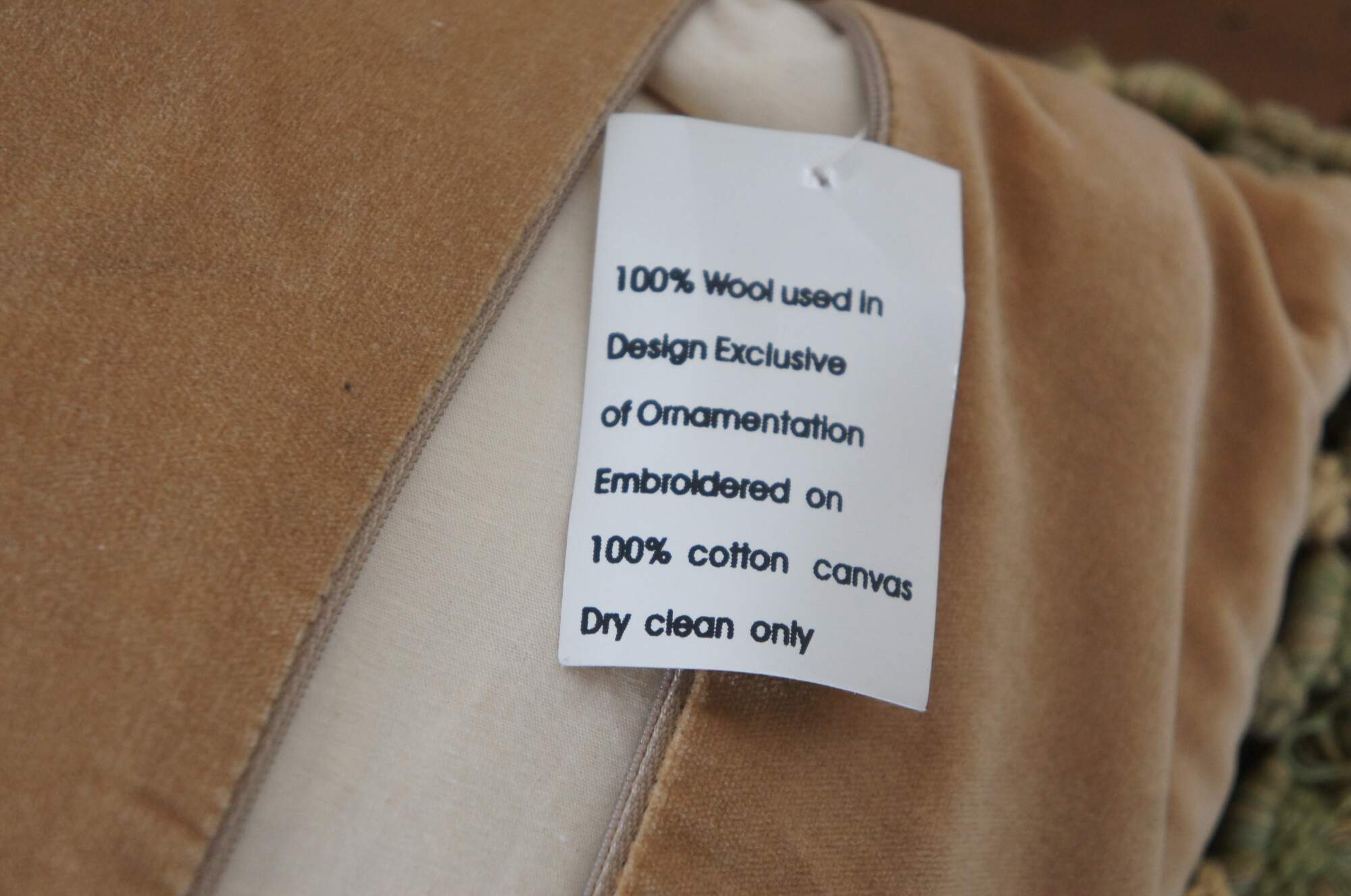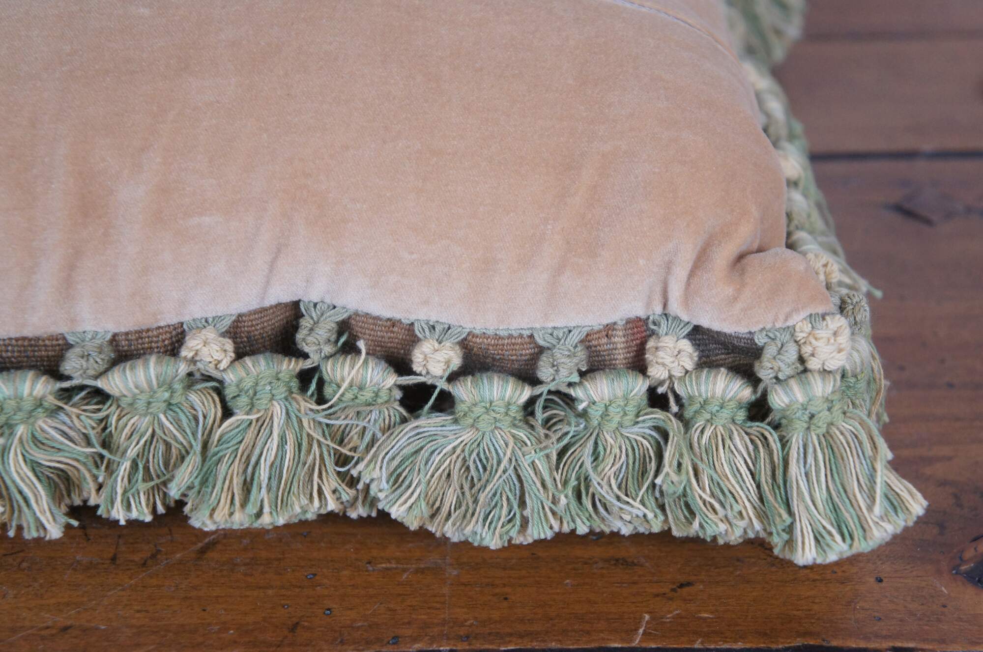 3 Available - 20th century French Aubusson style rectangular lumbar / throw pillow, embroidered in wool showing a cityscape along a river, framed with rocks and trees. Cream and green tassel trim. Light brown velour back with zipper closure. Down filled.