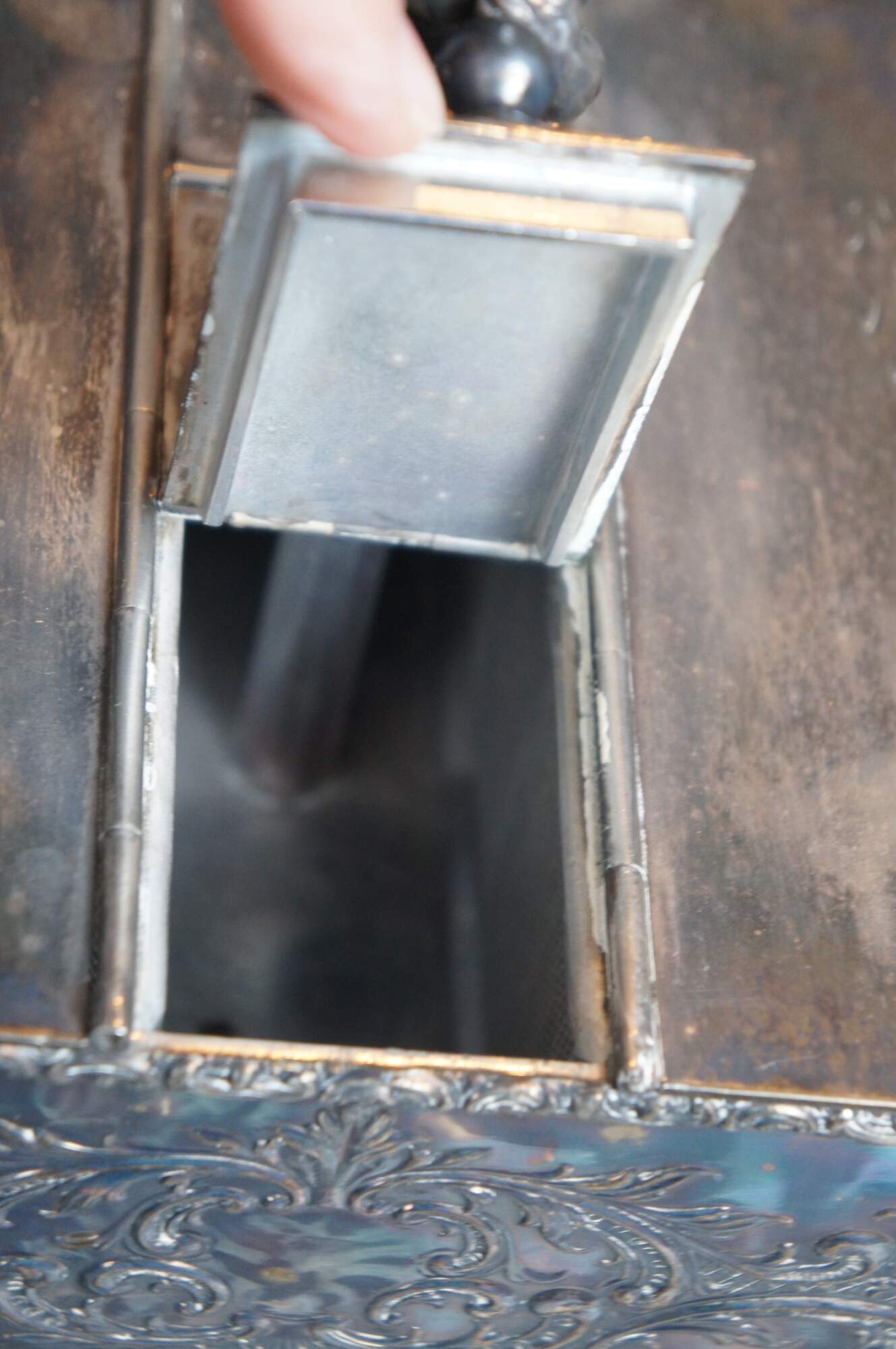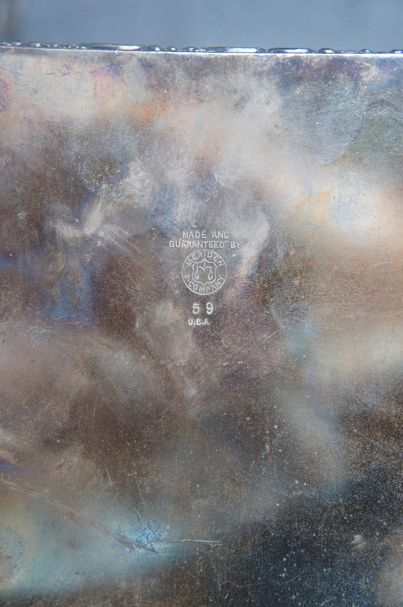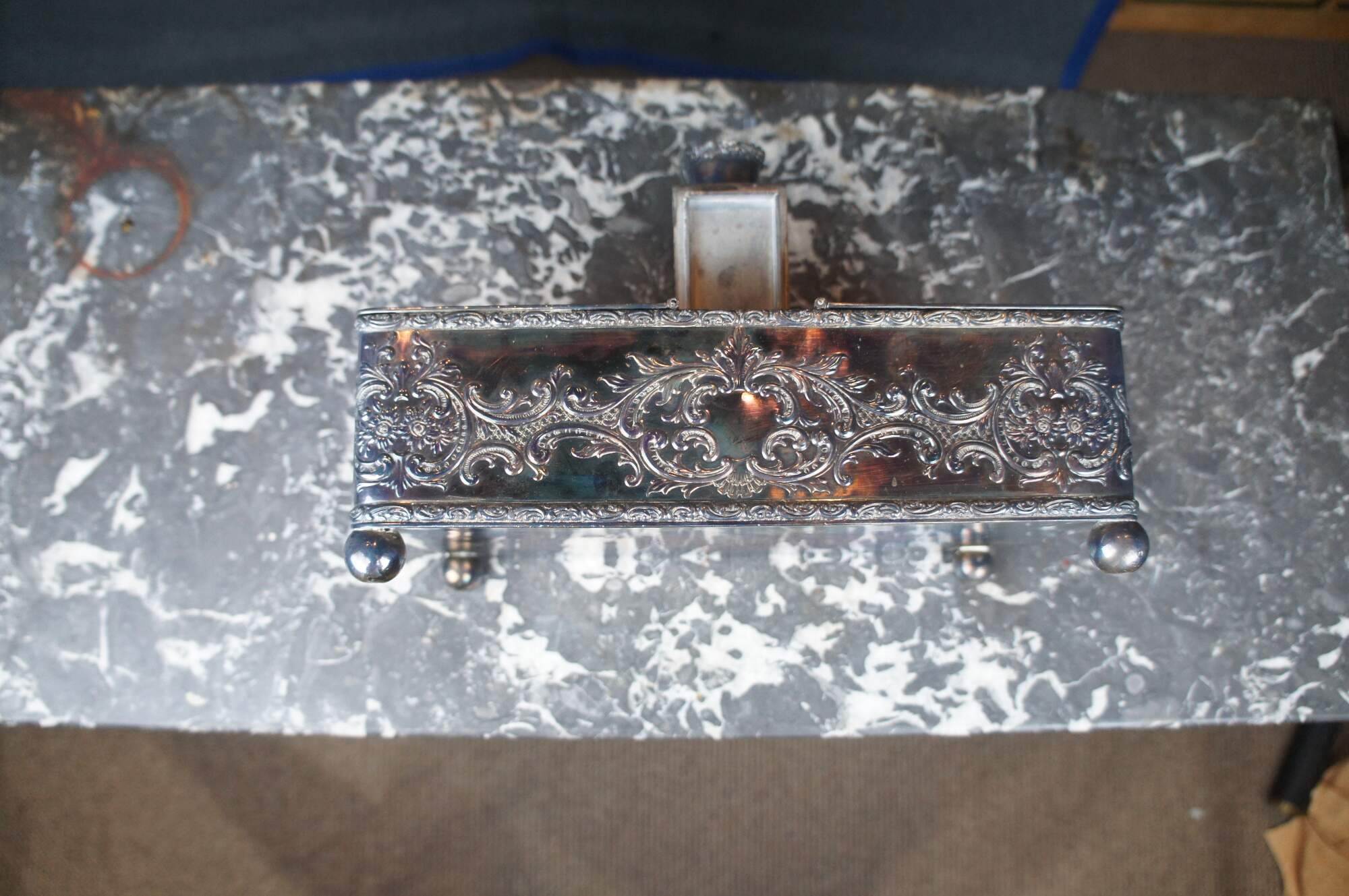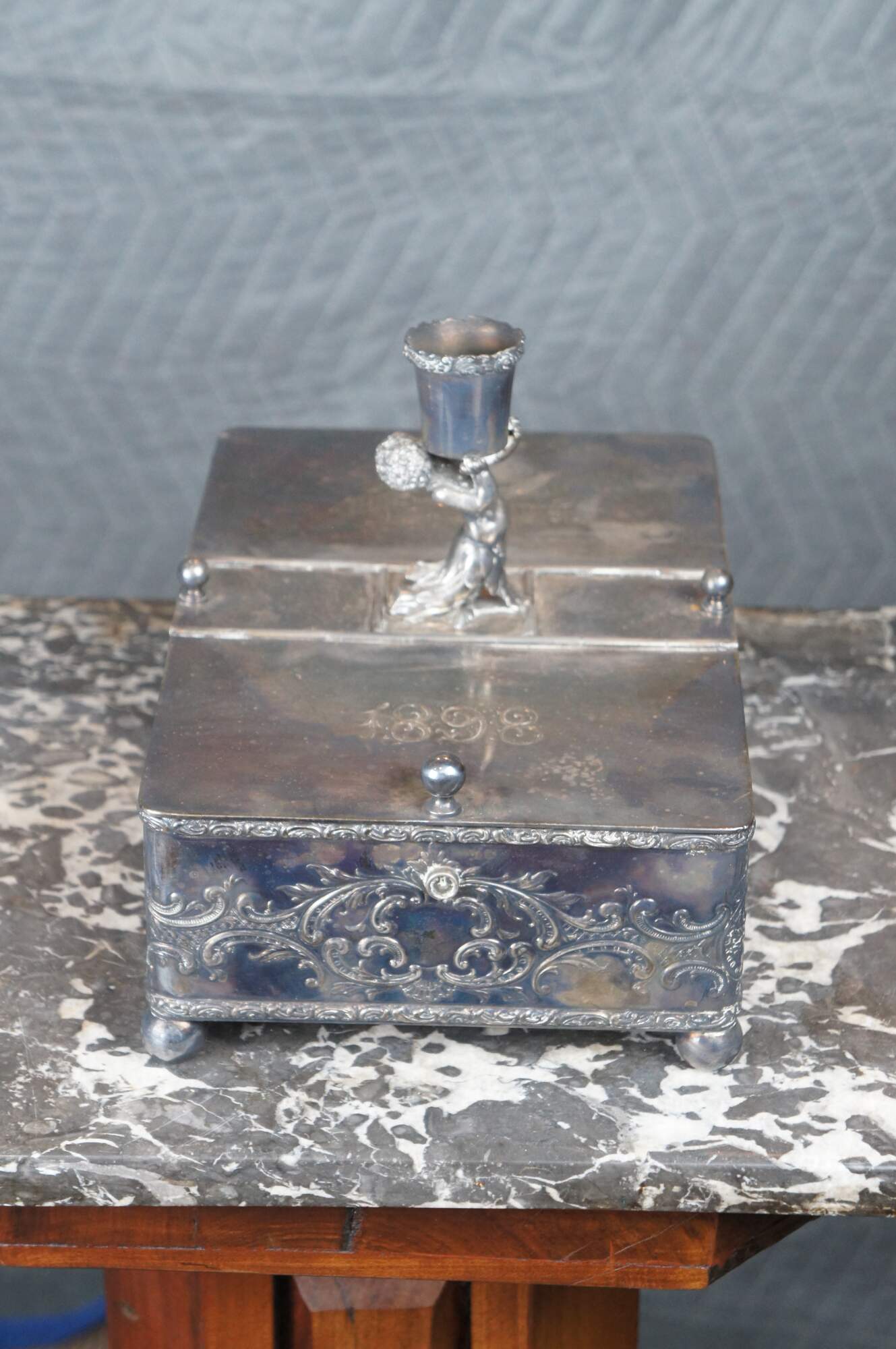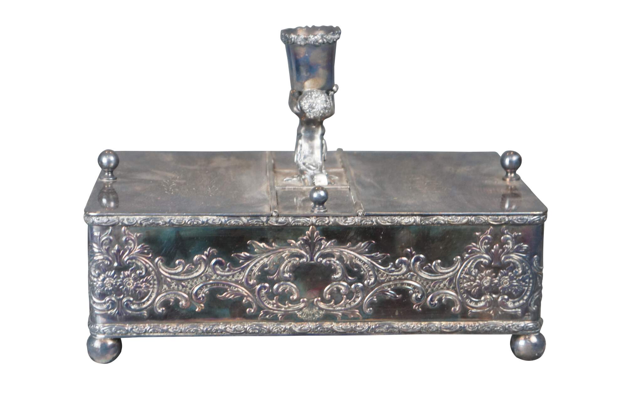 A divided Humidor by Meriden B. Company, Circa 1898. Made from silverplate with chased baroque pattern. The footed box has two large compartments and two small opening that allow access to the center. Along the top is a cherub holding a candleholder allowing the user to have light when accessing their favorite kind of smoke. The Humidor is marked 1898 and monogrammed along the top. The monogram reads To Blanche from Milly. Each side has a lock.