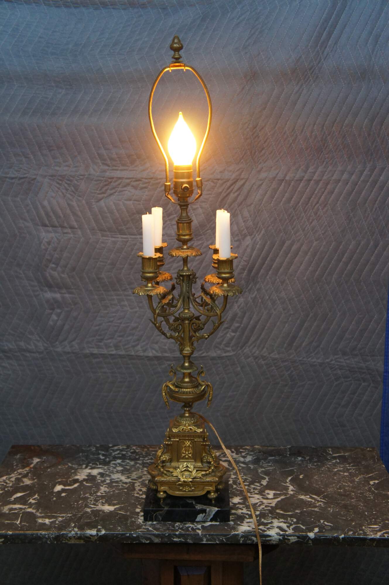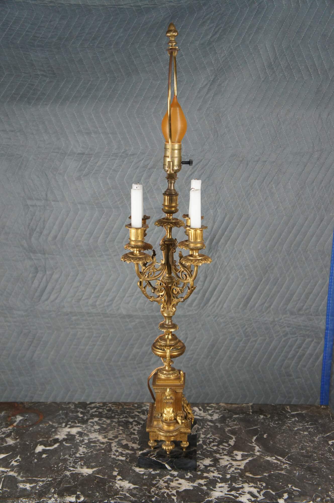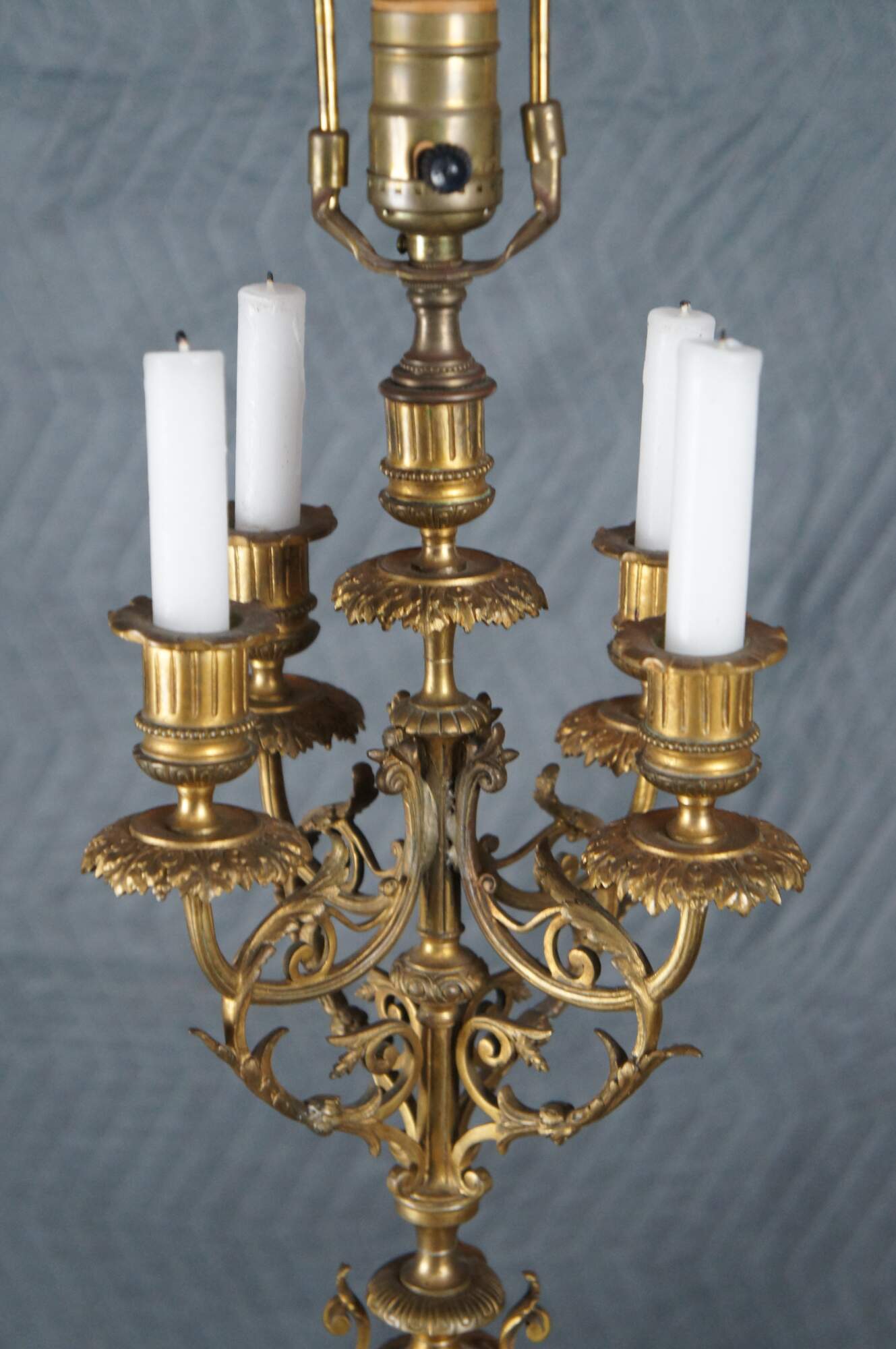 An elegant French Louis XVI Converted Candelabra Lamp. Features a gilt brass finish with classical motifs over a footed base on a black marble plinth. Arms are scrolled with acanthus accents and ornate drip pans. Lamp was added at the center where the fifth candle would have sat. Includes switch and brass harp with trophy finial.