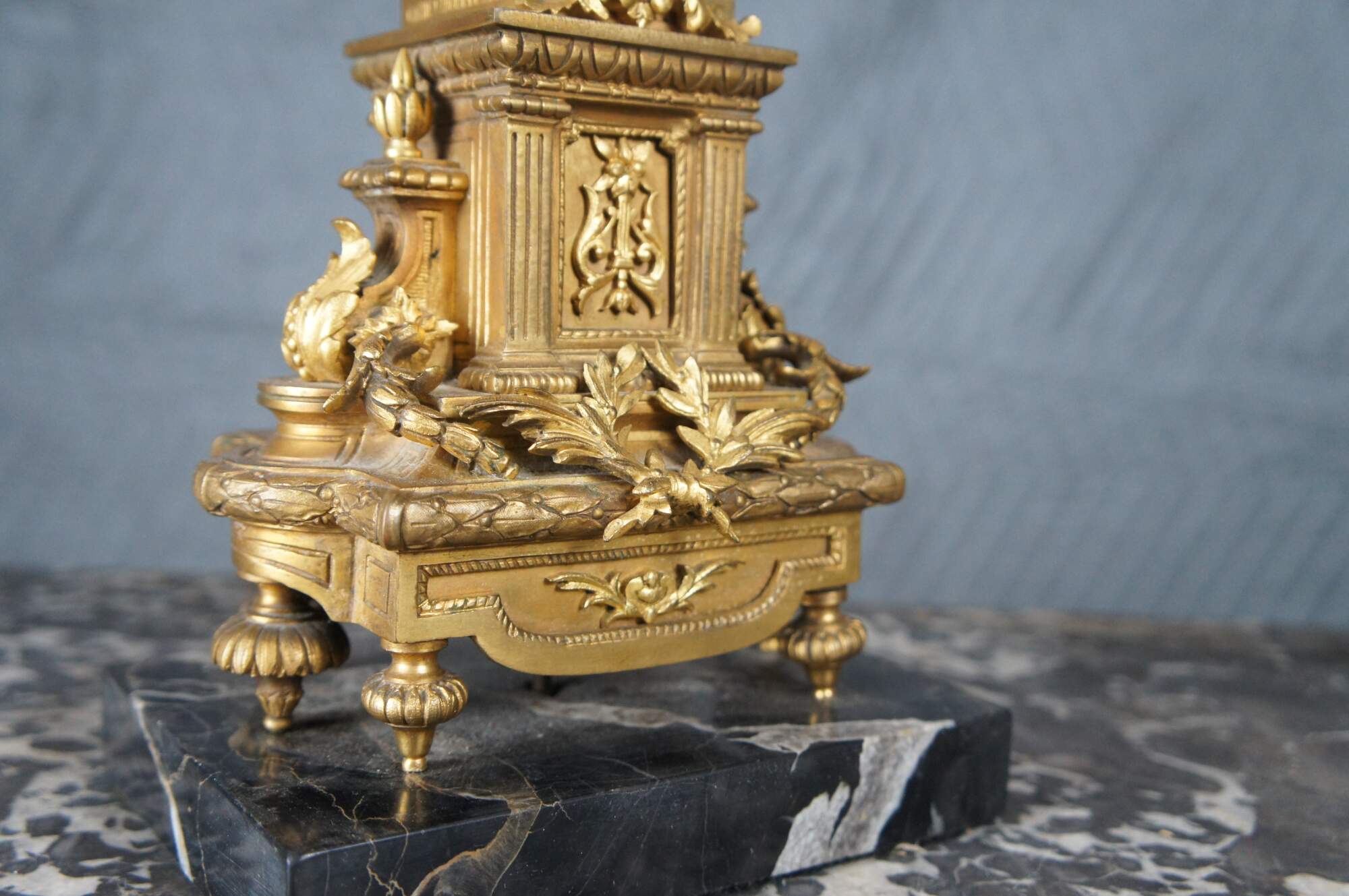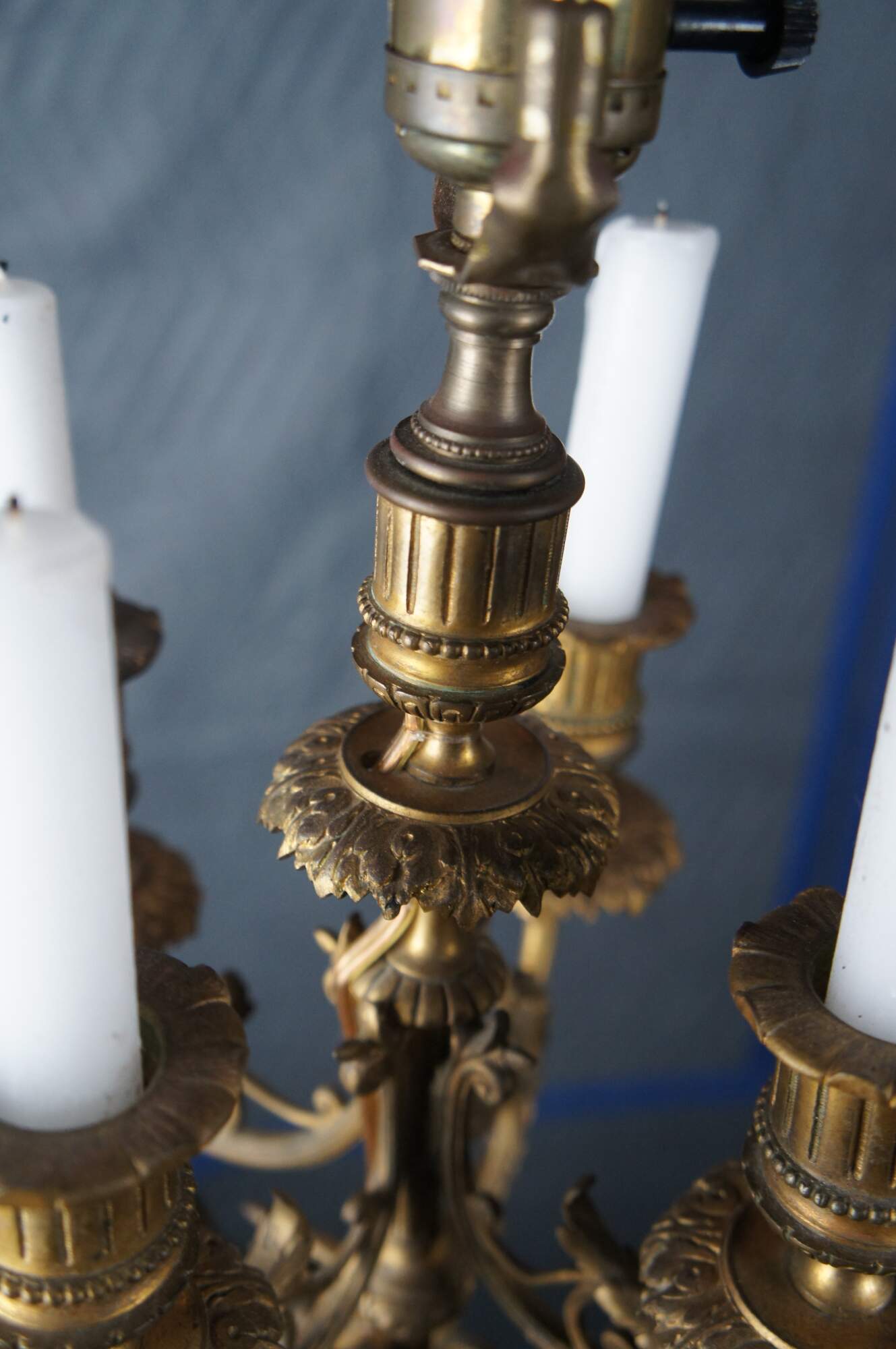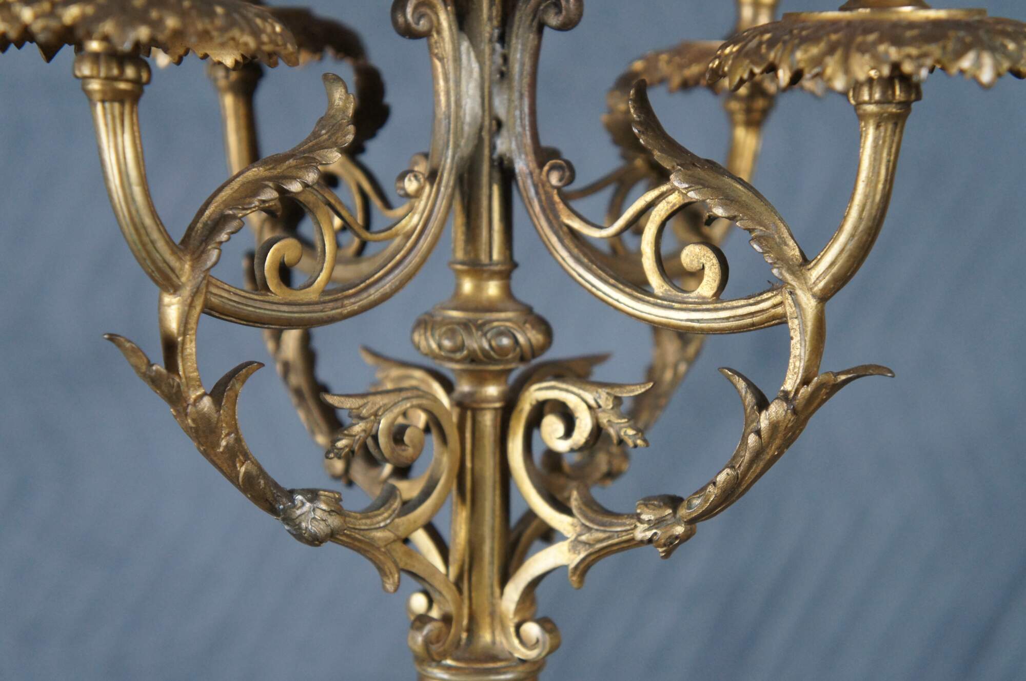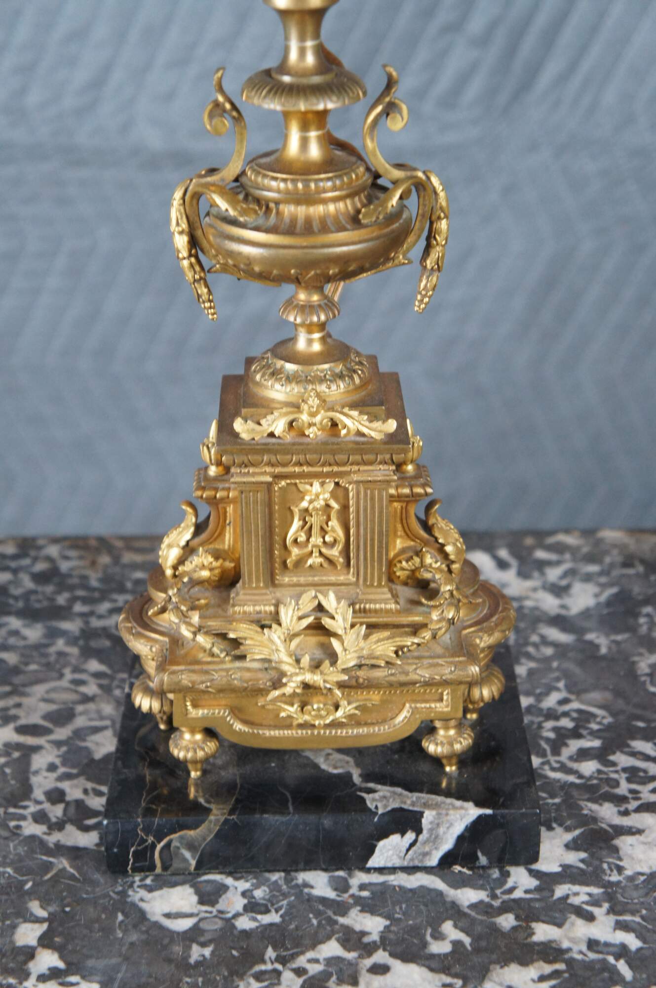 An elegant French Louis XVI Converted Candelabra Lamp. Features a gilt brass finish with classical motifs over a footed base on a black marble plinth. Arms are scrolled with acanthus accents and ornate drip pans. Lamp was added at the center where the fifth candle would have sat. Includes switch and brass harp with trophy finial.