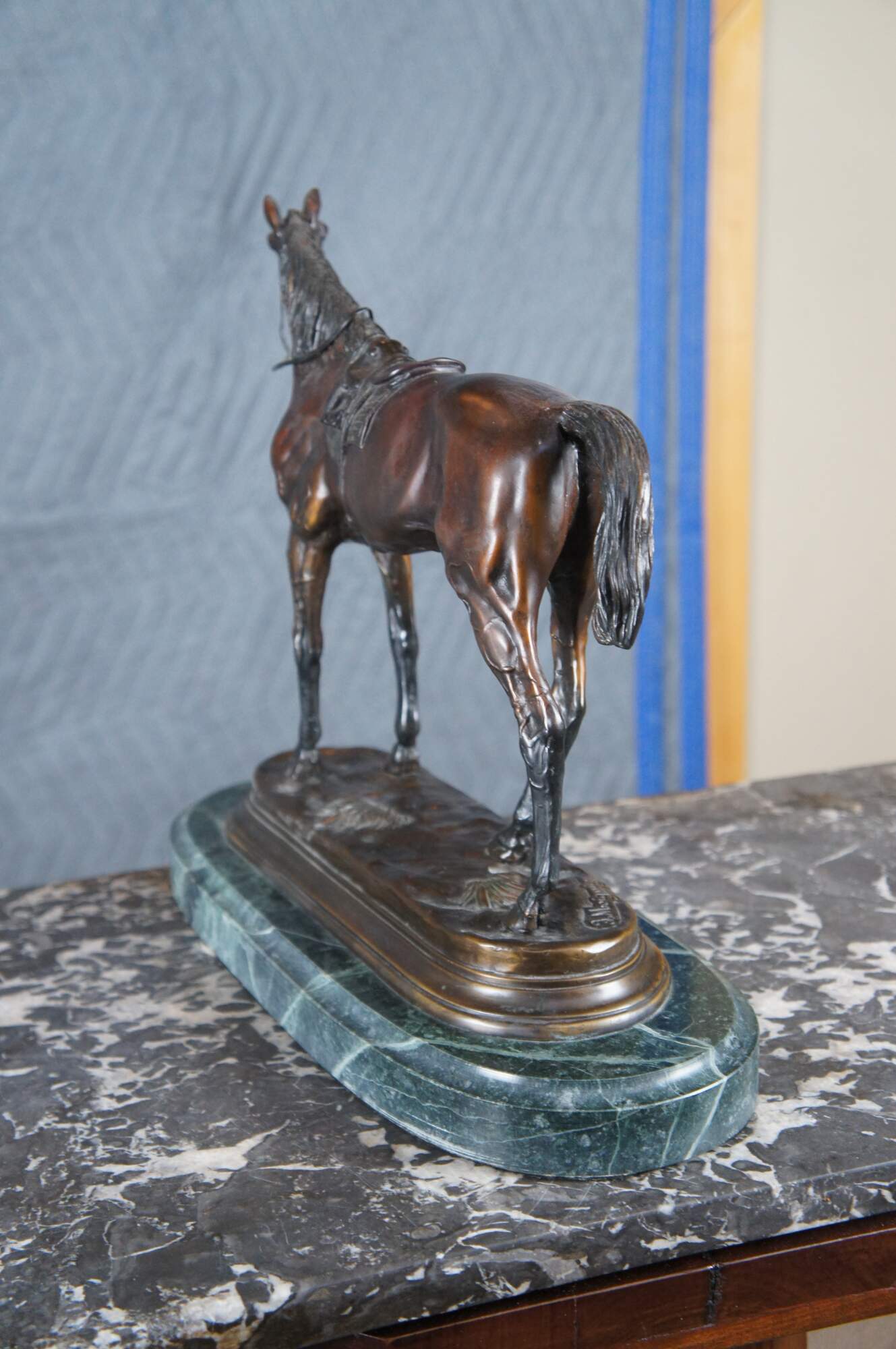 20th Century bronze depicting a saddled race horse. After Jules Moigniez (French, 1835-1894). Signed along the top by the hind legs. The bronze is mounted to a oval green plinth base. Originally used as a trophy for the 1999 Member Guest Invitational at Due Process Stables. The plaque is removable.