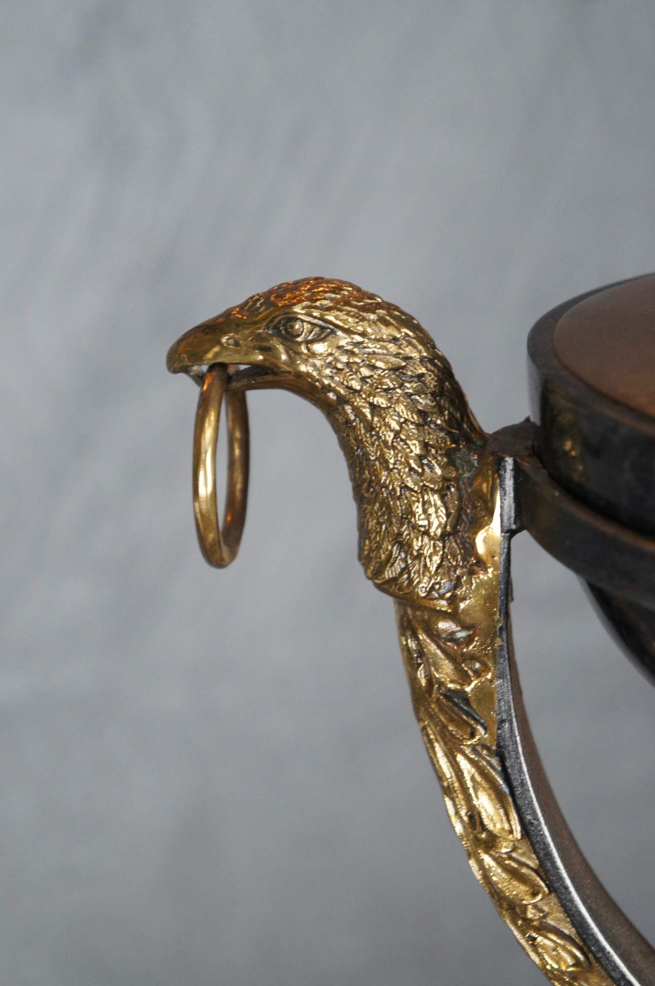 Late 20th century, iron, brass and tessellated marble table lamp by Maitland Smith. Features an oil urn shaped body over twisted iron supports and stepped tripod plinth base. The urn portion is connected to three brass eagle heads supports leading to paw feet. Switch is marked MTD, Sticker along underside.