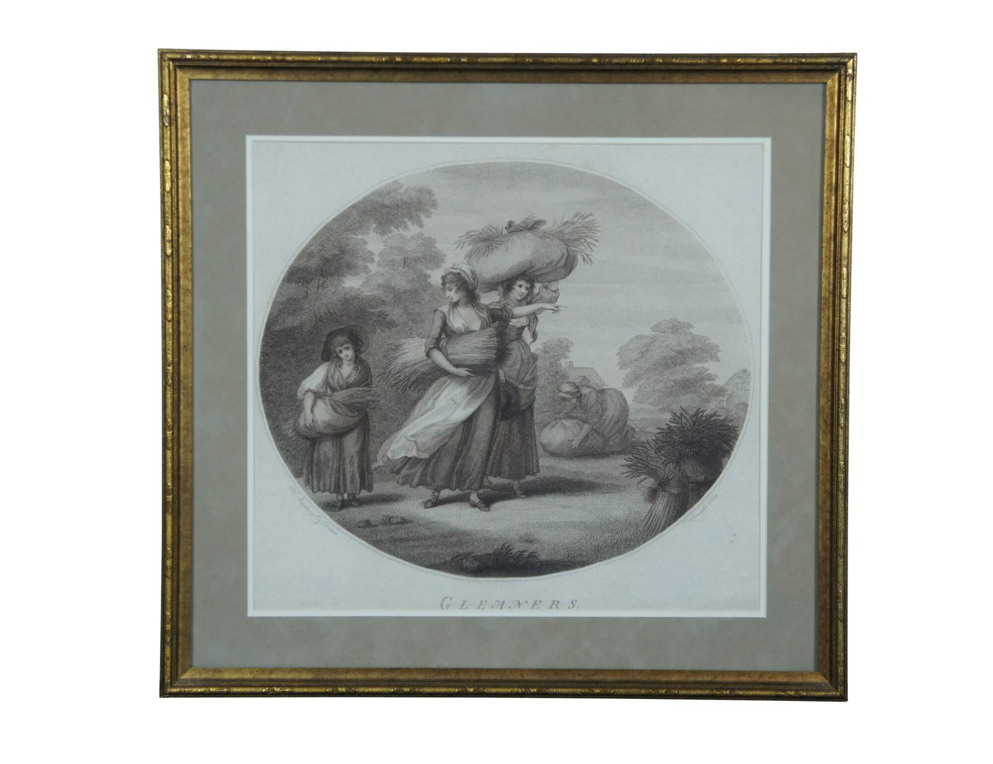 A pair of prints on the subject of "Gleaners" (rustic folk, gathering up leftover corn following the harvest). In England, up until the late 18th century, 'gleaning' was seen as an inherent right for landless tenants and poor "cottagers". The practice, customarily undertaken by women, had carried on for centuries, based on the Biblical precedent of Leviticus 19:9-10 which proposed the idea that landowners had an obligation to provide for the poor and marginalized by leaving field edges and gleanings "for the poor and the foreigner" (King James Version). In some parishes the church bell was rung (possibly signified here by the church tower in the print) to signal the times during which gleaners could operate.