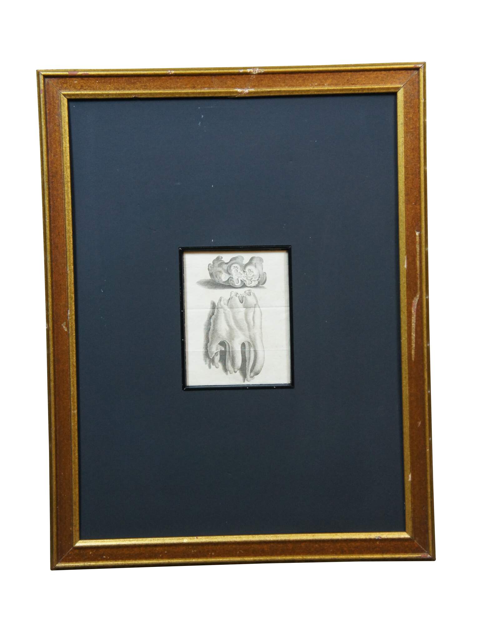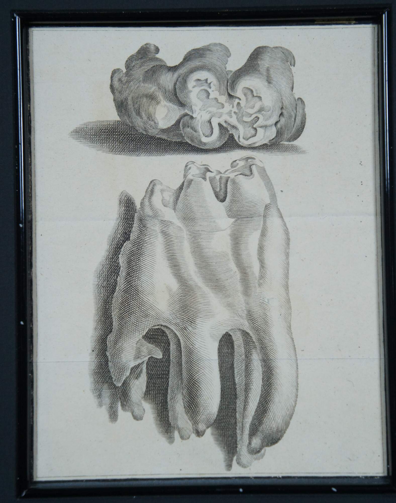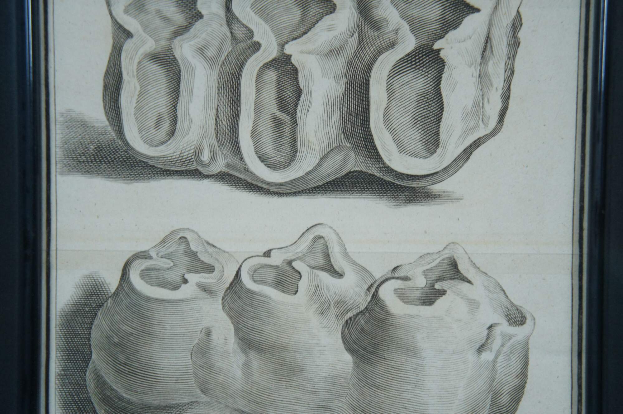 Pair of rare antique 18th century Jacques de Sève dental / Zoology / anatomy etchings / engravings of a Mastodon / Mammut tooth, front and top views / elevations. One marked as Plate 8 Original circa 1700-1880. Giltwood frame with raised bevel edge; black mat.