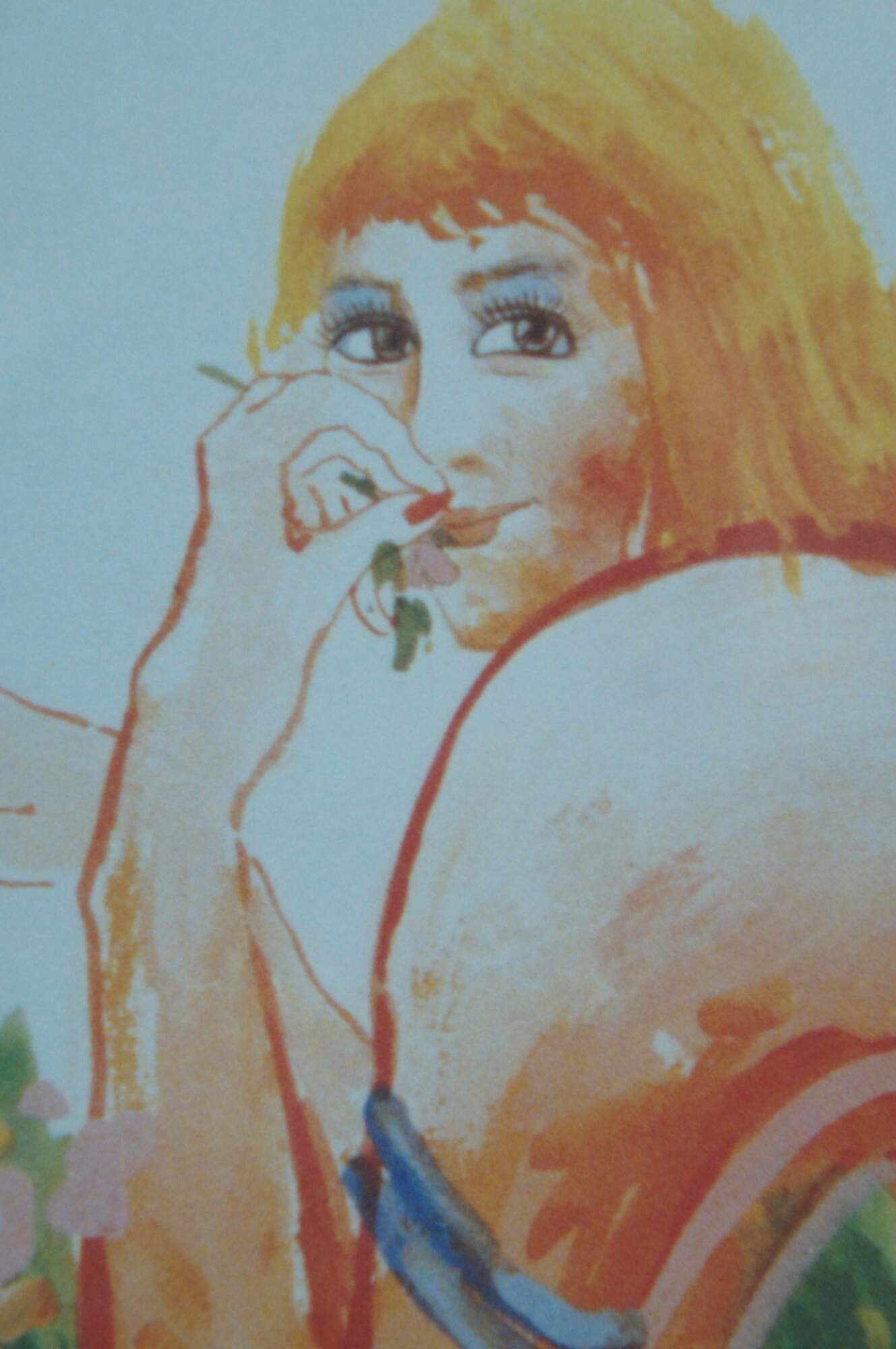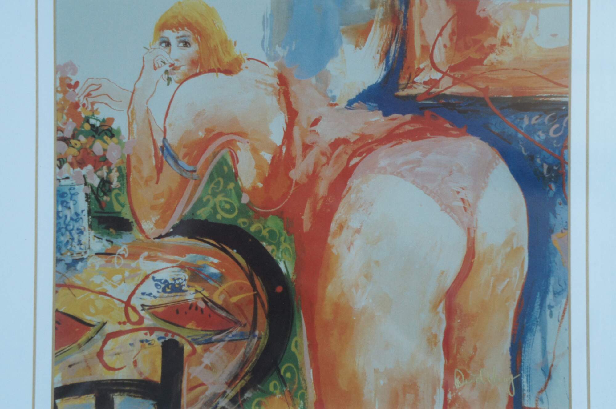 Late 20th century framed diptych featuring a print showing a female figure leaning over a dining table and smiling coqutteishly over her shoulder, and a single line style pencil drawing of a female figure in high heels lounging on the floor. Print signed in gold marker, lower right and twice on the sketch. Giltwood frame with raised bevel; white mat.