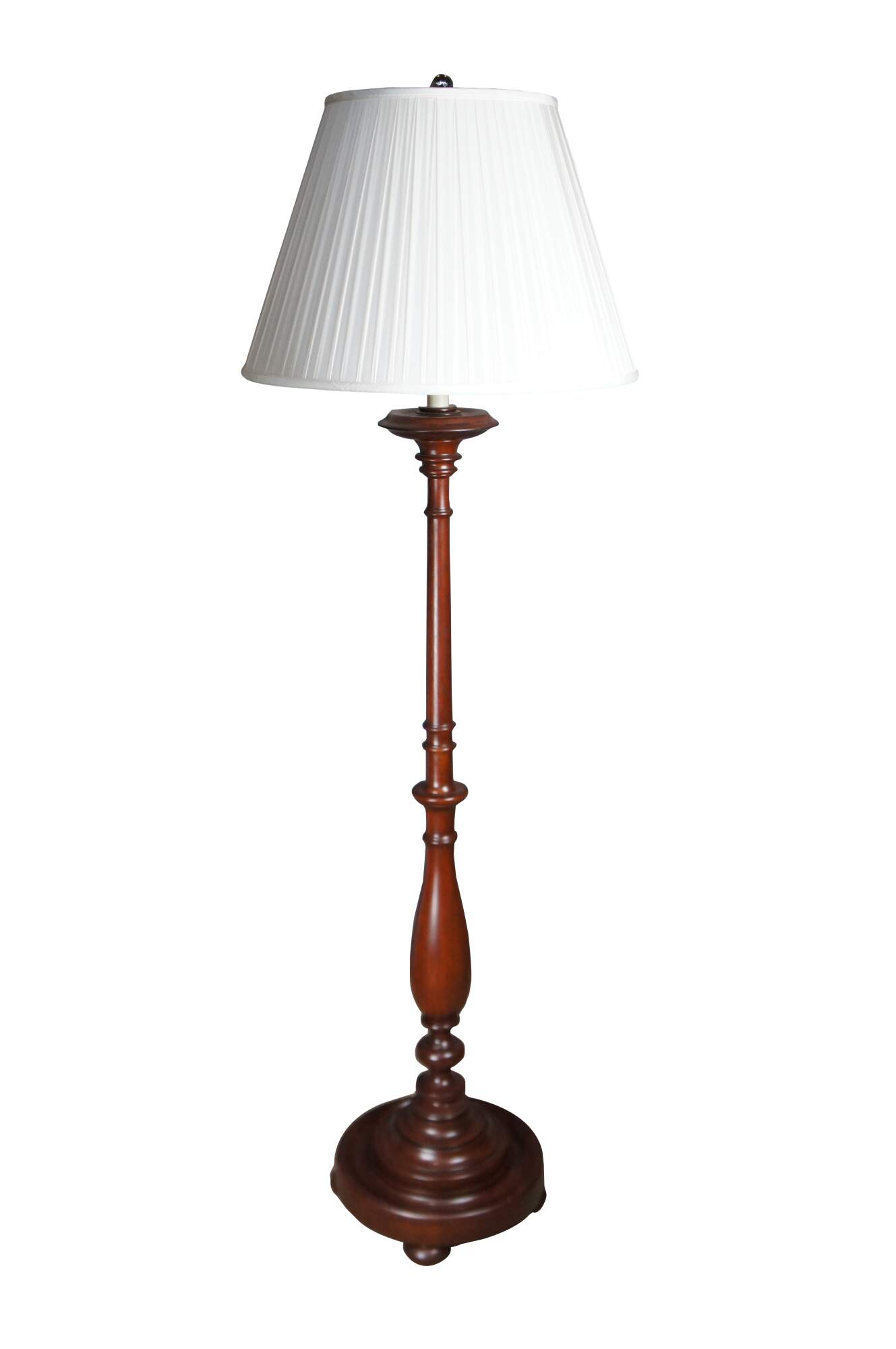 A traditional rich brown mahogany floor lamp by Ralph Lauren. The lamp is in the form of a large Early American / Colonial candle stand with candlestick center and adjustable harp allowing the shade to be raised / lowered. Features a baluster turned center over a round base with bun feet. The Harp is Chrome and the shade is pleated silk. A timeless classic that will make a warm addition to any space.