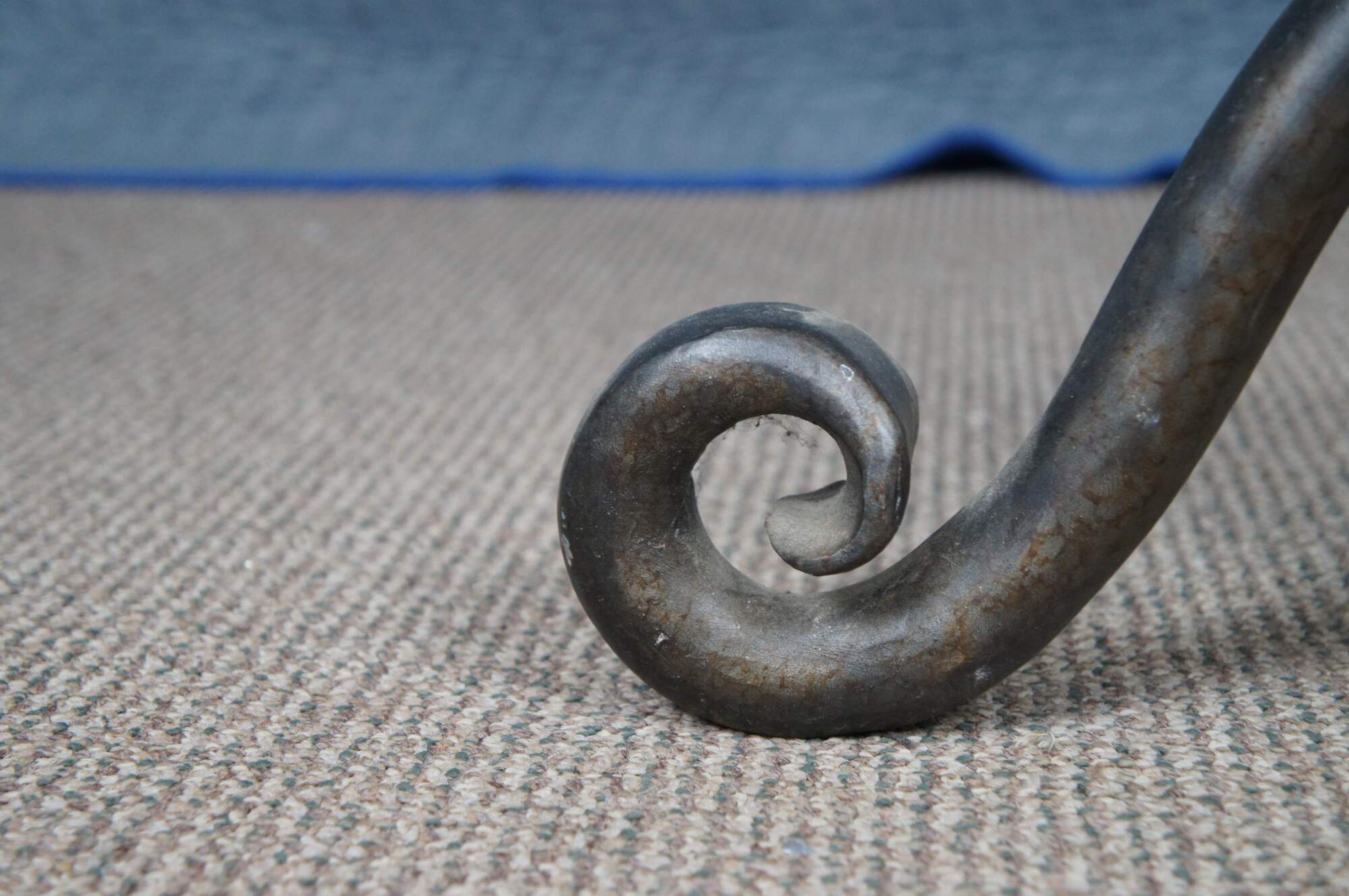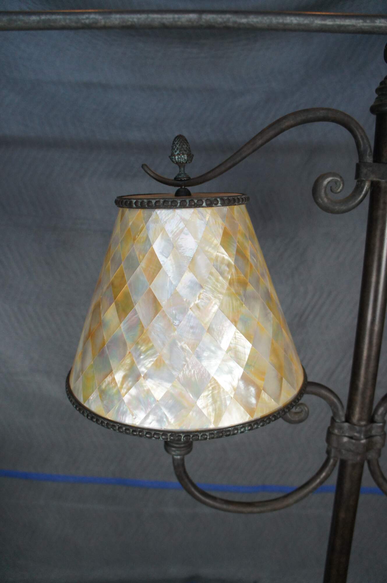 An impressive Iron Floor Lamp Handmade by Maitland Smtih. Features a rich patinated finish with scrolled accents and two Mother of Pearl hanging shades with Tessellated Harlequin pattern. Finial is twisted in a torchiere shape. The lamp is supported by a four legged base