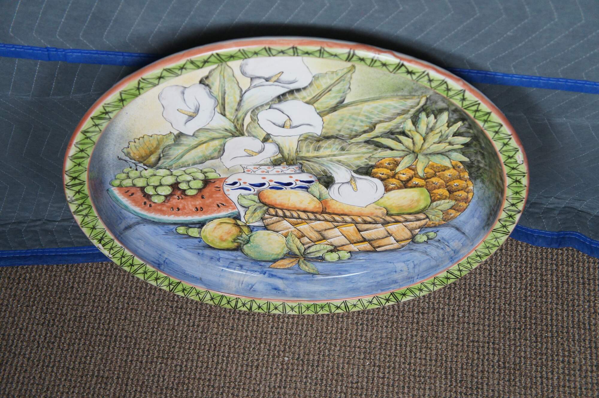 A beautiful 20th century Majolica Platter / Decorative Wall Plate. Made in Santa Rosa de Lima (Villagrán), Guanajuato. Features a hand painted still life with a basket of fruit besides a watermelon, grapes and a pineapple. In the center is a porcelain face with Cala Lily's. The foreground of the plate is blue and the rim has a green and black repeated bat / hourglass pattern.