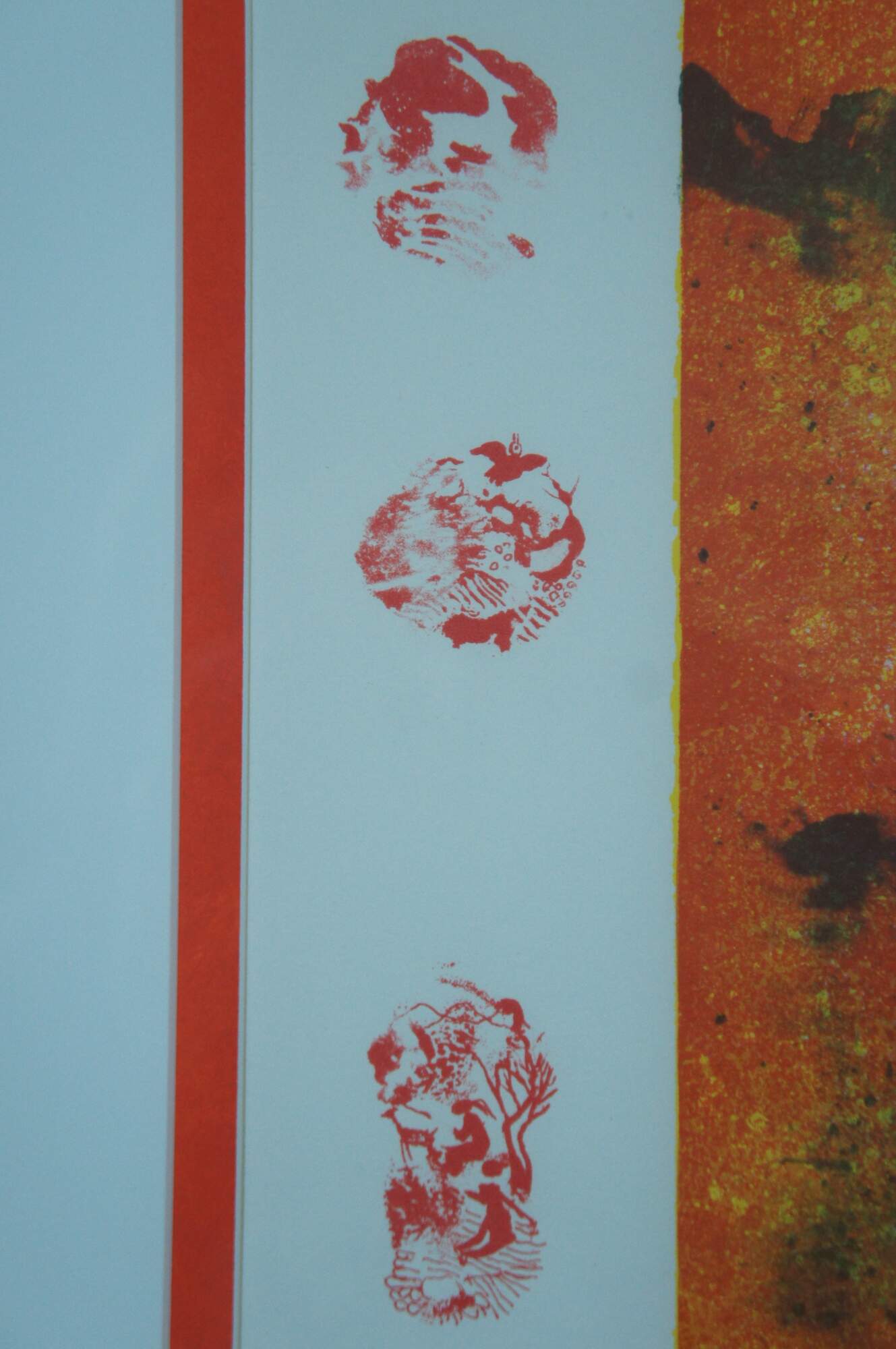 Mid century 1962 nautical Vietnamese waterway scene titled "Boat Clothesline. This lithograph print by Hoi Lebadang shows a semi abstract seascape in reds and oranges of boats and laundry strung over water, in front of a tree and a small cottage on stilts. The white space is stamped with six miniature landscape scenes and embossed CG and a floral design in opposite lower corners. Pencil signed Hoi (lower right) and numbered 345/375 (lower left). Plain wood frame; white and orange-red layered mat.