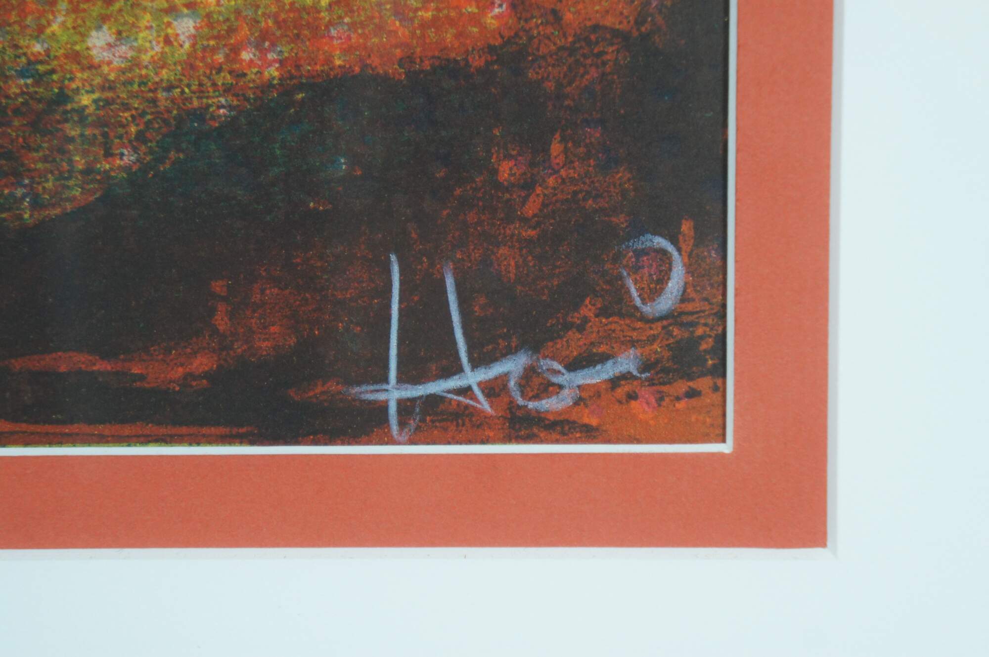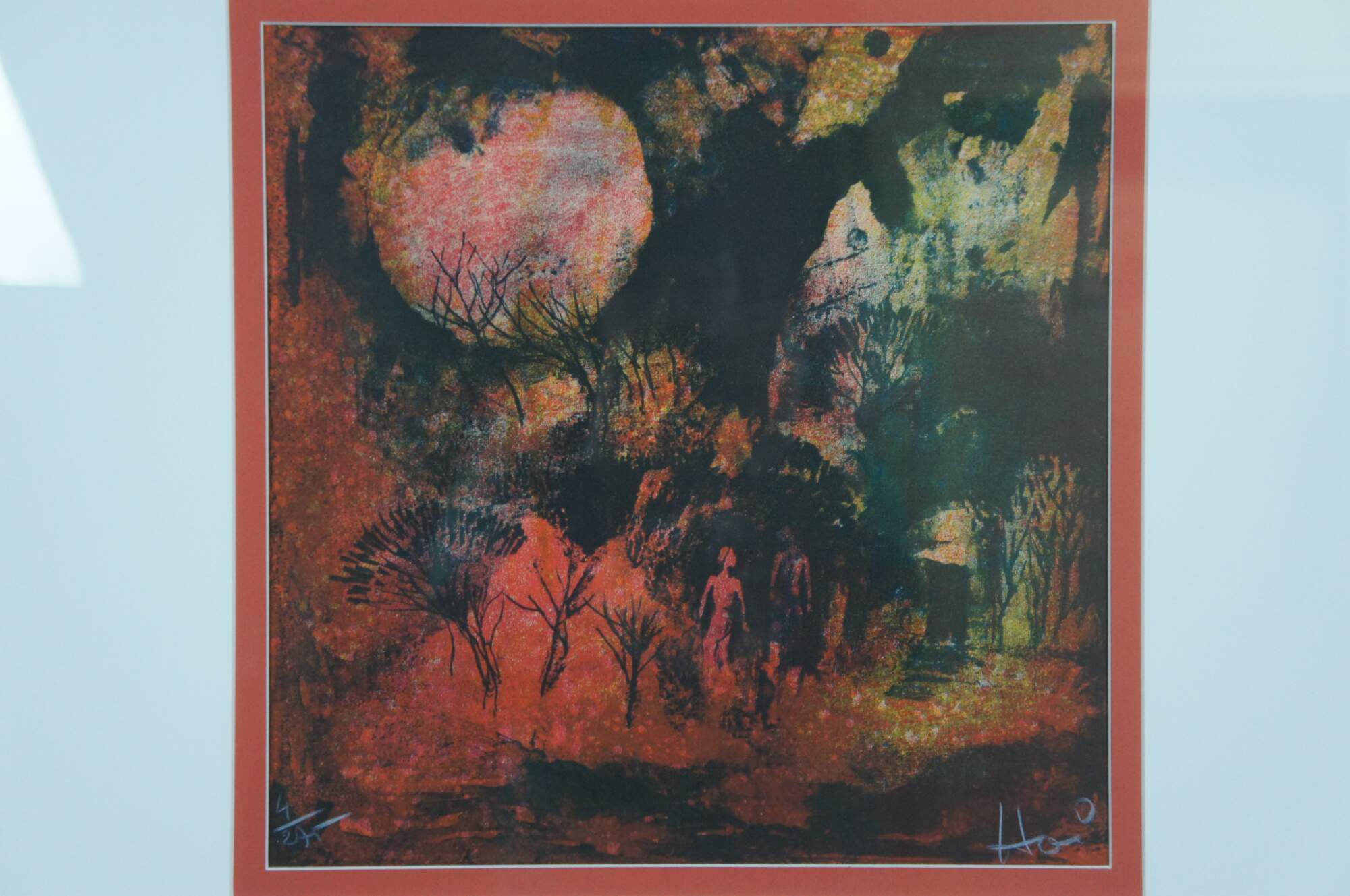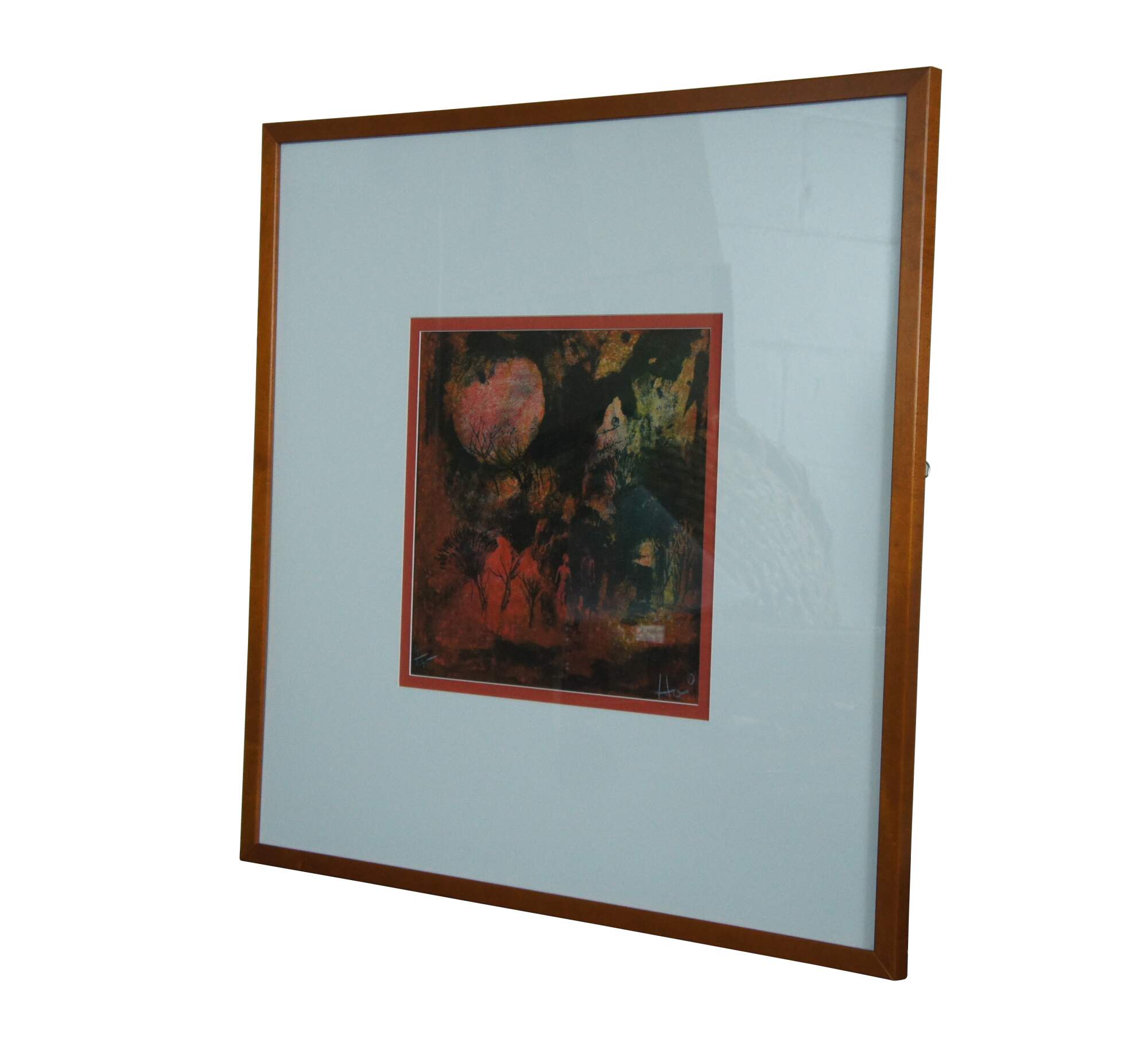 Mid century lithograph print titled Rendez Vous Sous La Loun (Meet under the Moon) by Hoi Ledabang. Shows a abstract landscape of trees in red, green and black under a moon lit sky, through which walks a pair of figures. Signed Hoi (lower right) and numbered 4/245 (lower left). Certificate of Authentication on back of frame. Plain wood frame; white and orange-red layered mat.
