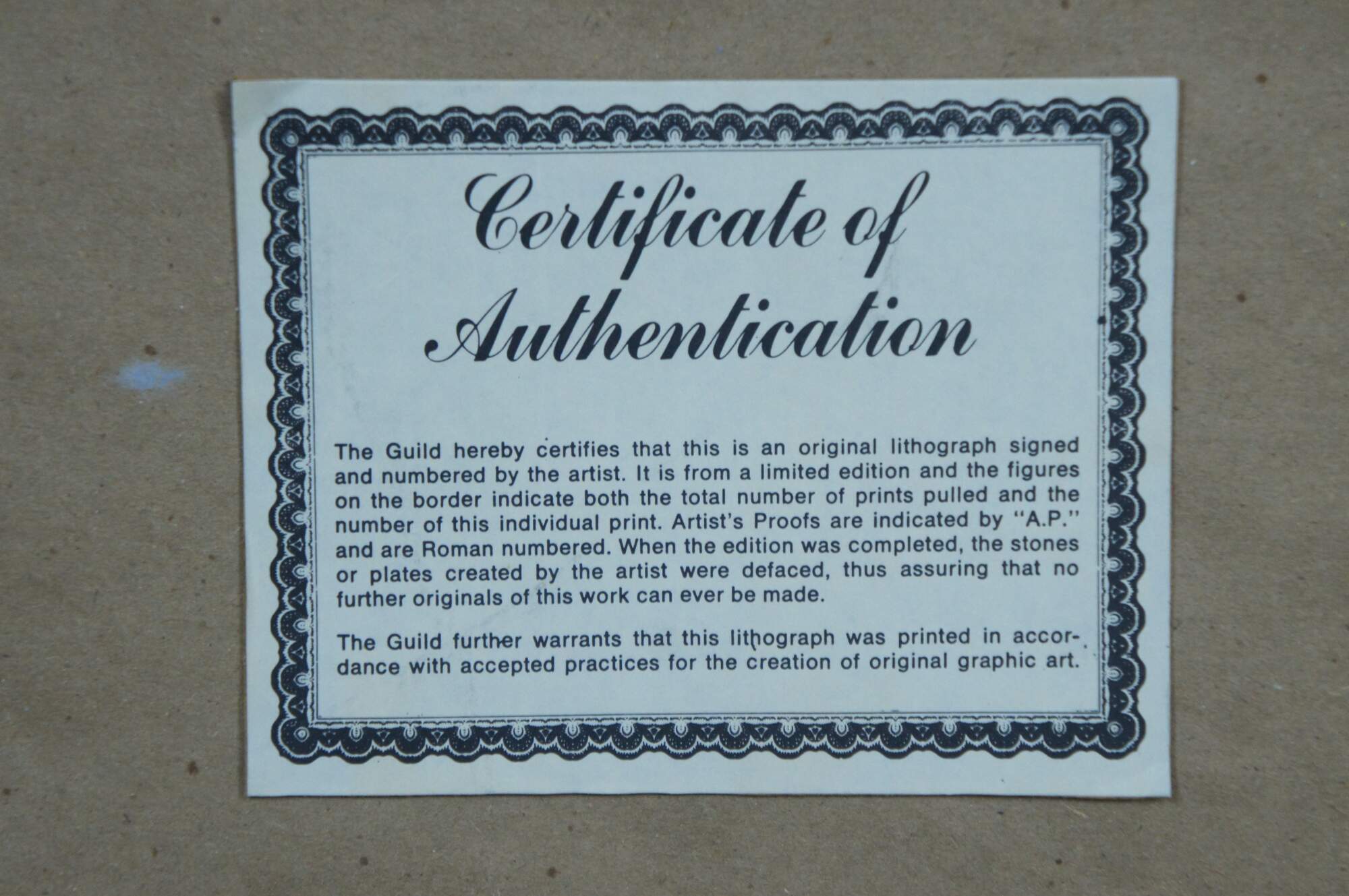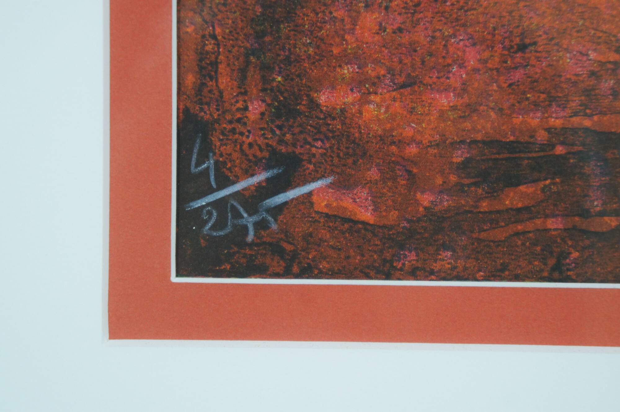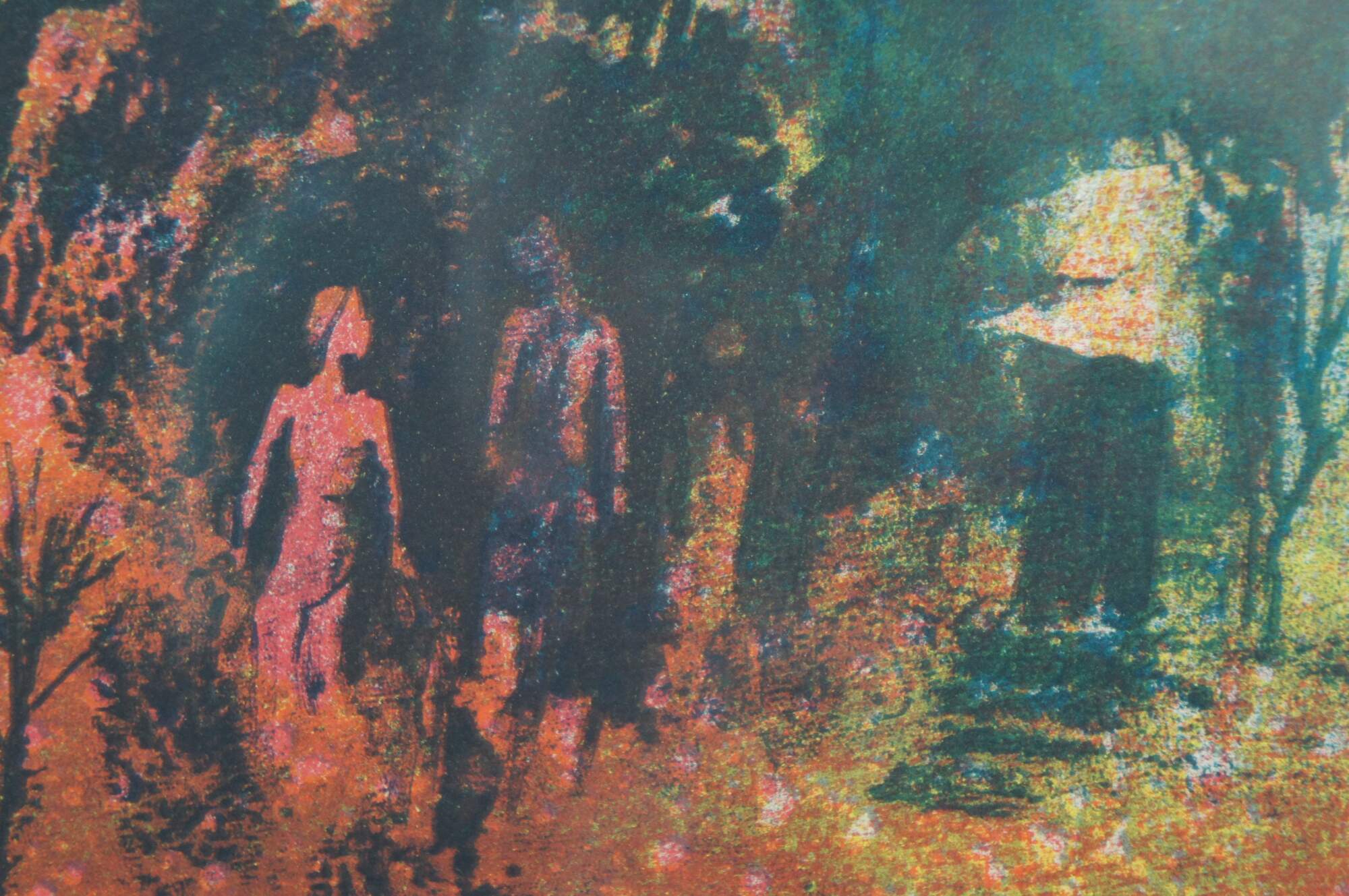 Mid century lithograph print titled Rendez Vous Sous La Loun (Meet under the Moon) by Hoi Ledabang. Shows a abstract landscape of trees in red, green and black under a moon lit sky, through which walks a pair of figures. Signed Hoi (lower right) and numbered 4/245 (lower left). Certificate of Authentication on back of frame. Plain wood frame; white and orange-red layered mat.