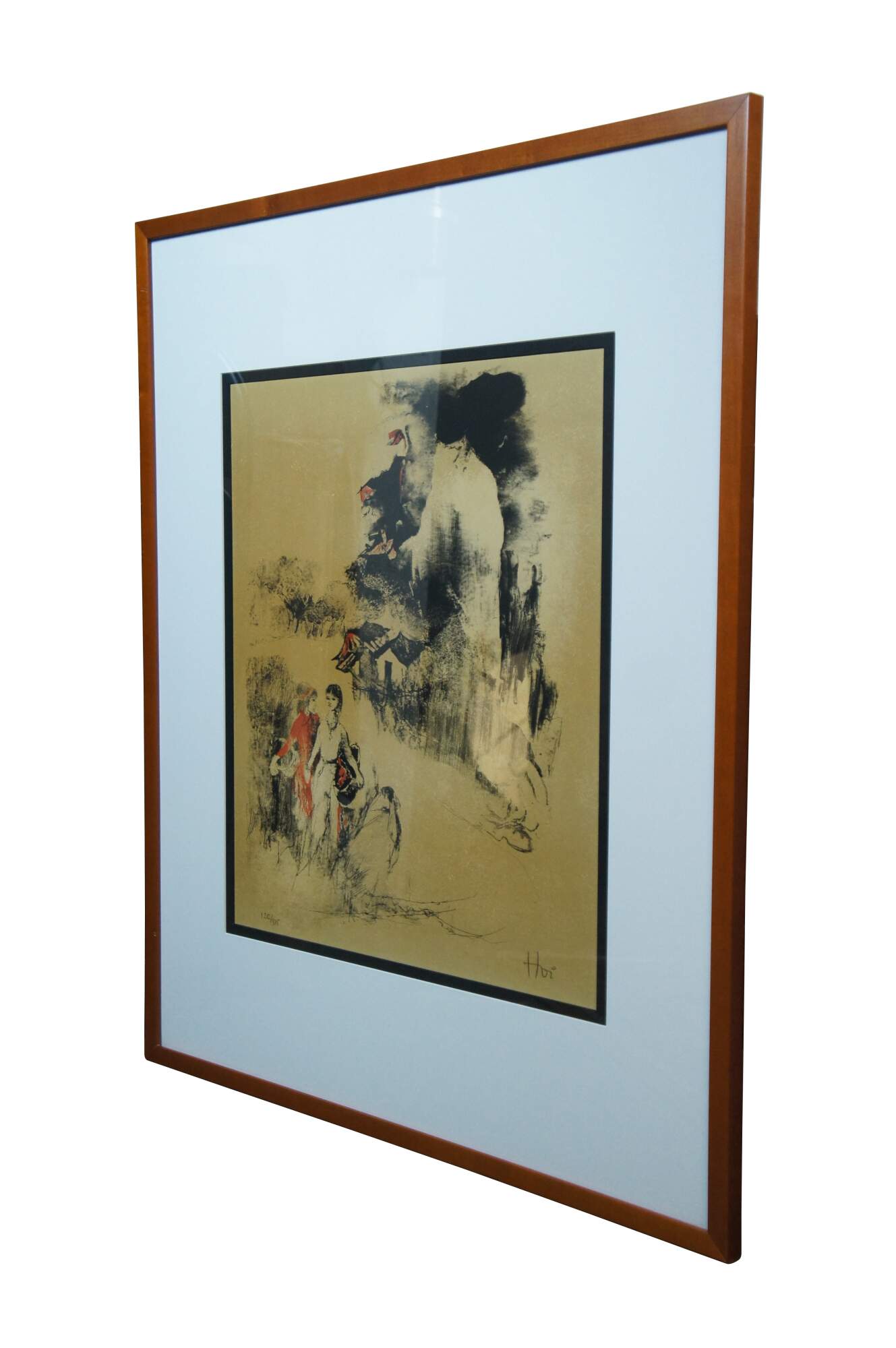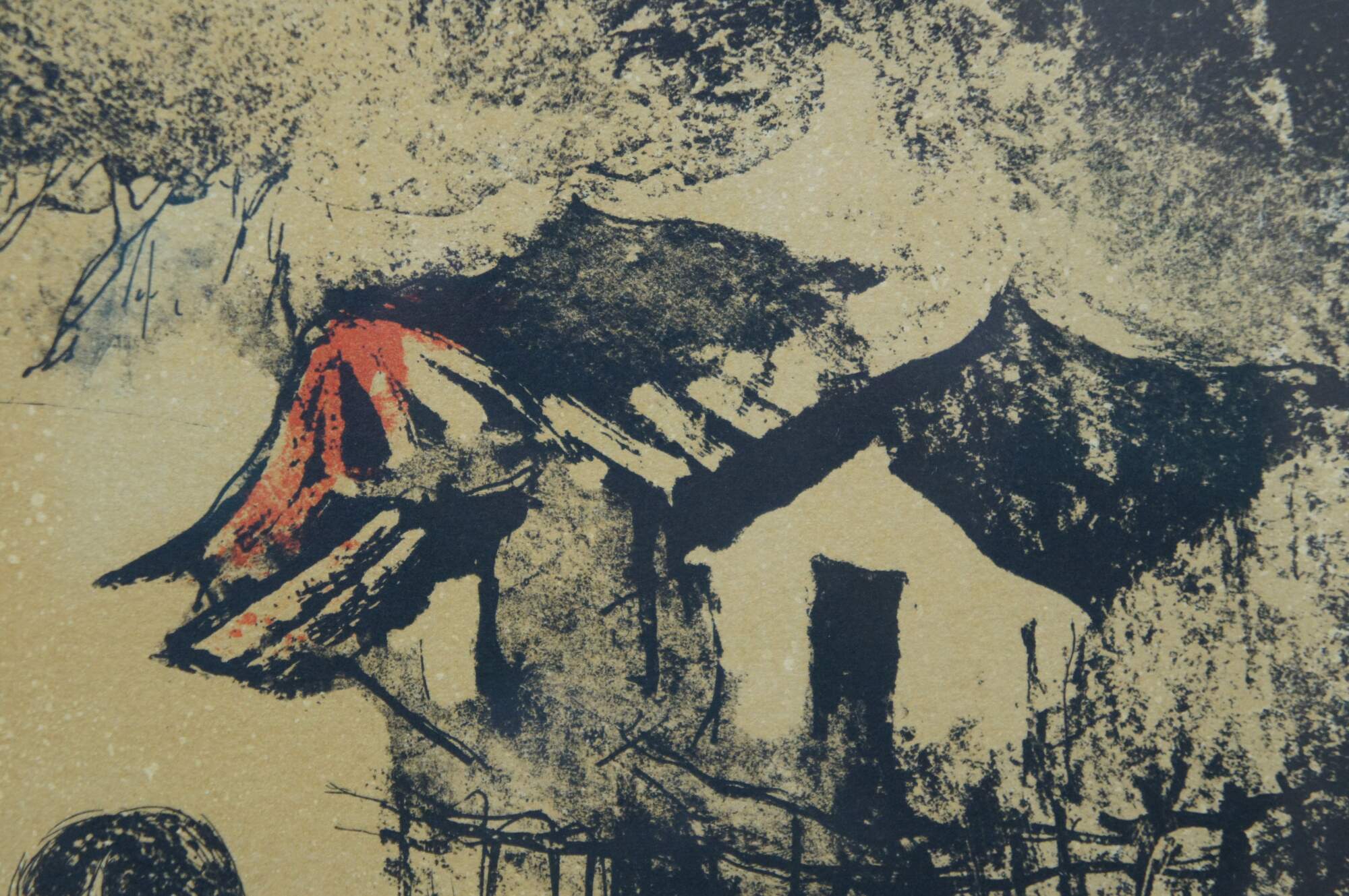 Mid century lithograph print by Hoi Ledabang. Shows a country village landscape at the base of a mountain with a pair of figures carrying baskets in the foreground, done in black and red on golden paper. Signed Hoi (lower right) and numbered 120/325 (lower left). Paper embossed CG lower left. Plain wood frame; white and orange-red layered mat.