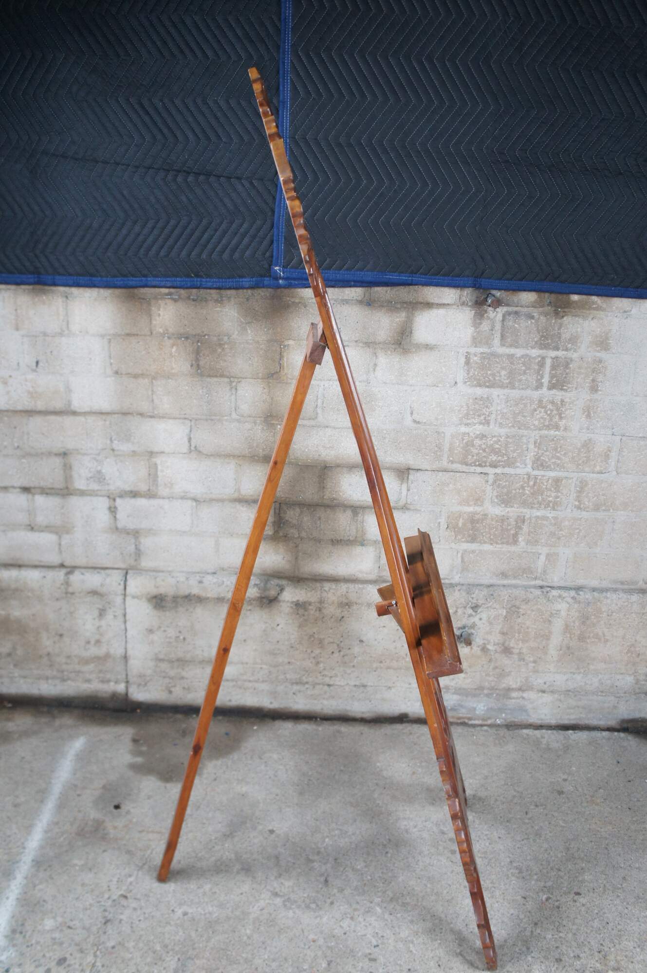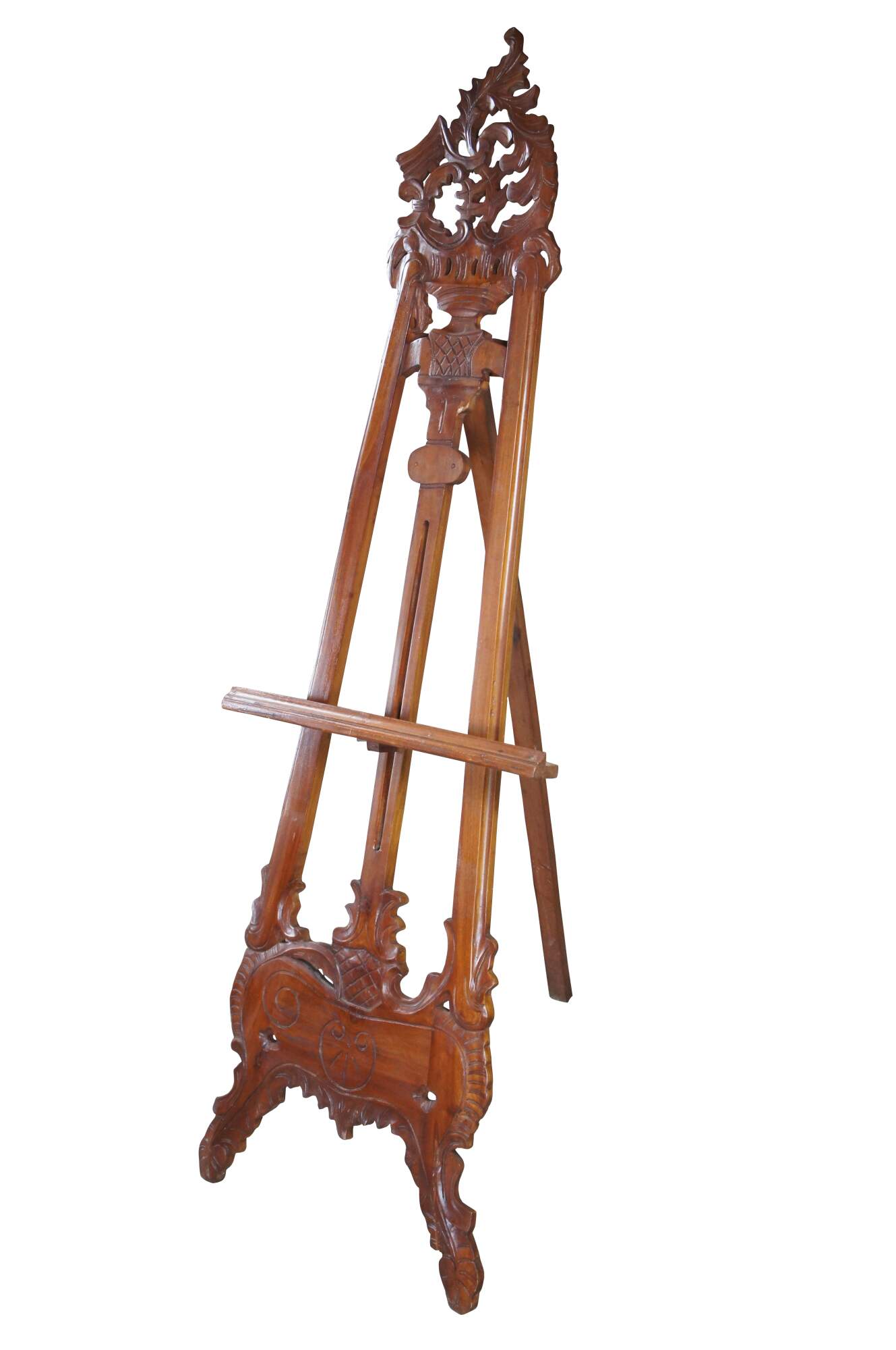 Late 20th Century Baroque inspired easel. Made from mahogany with pierced and carved foliate. Features an adjustable stand for displaying artwork.