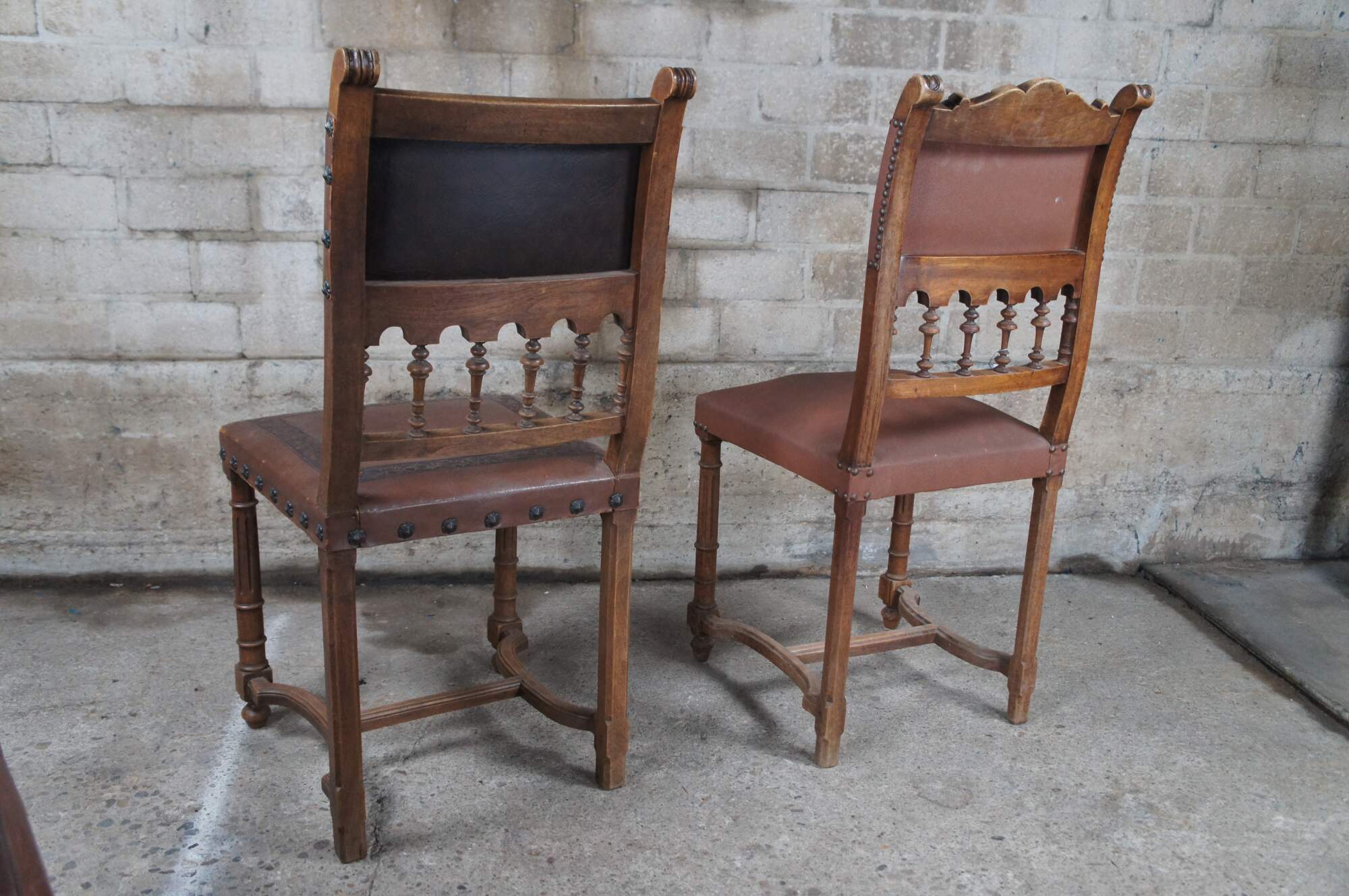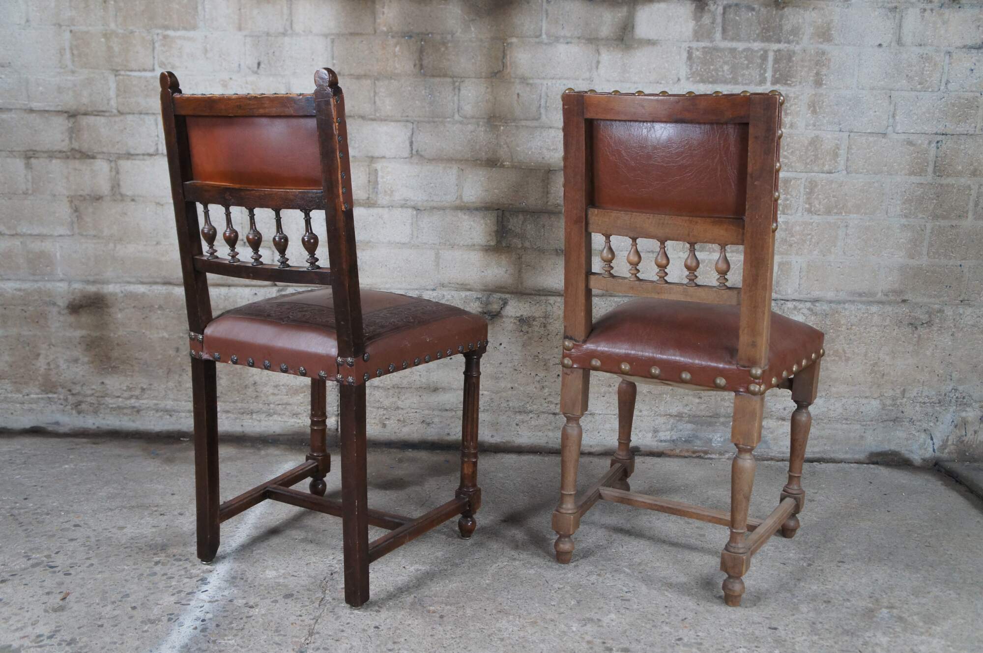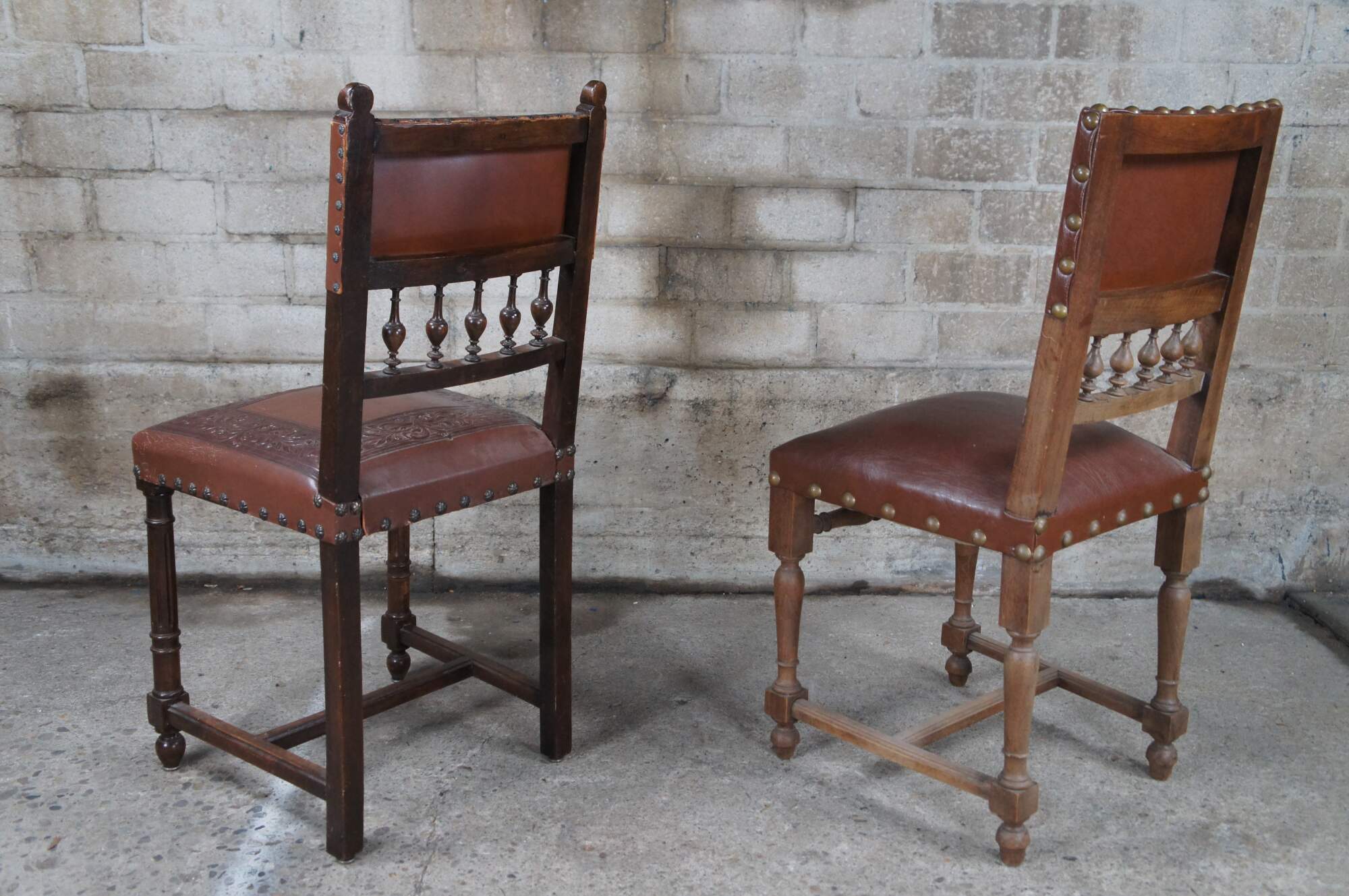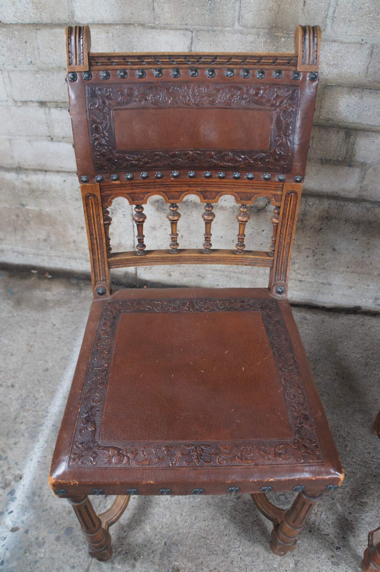 Lot of four Henry II style dining chairs. Features a hardwood construction with carved and molded spindle backs. The chairs are supported by fluted legs with H stretchers and bun feet. Upholstered in leather with some tooling and nailhead trim.