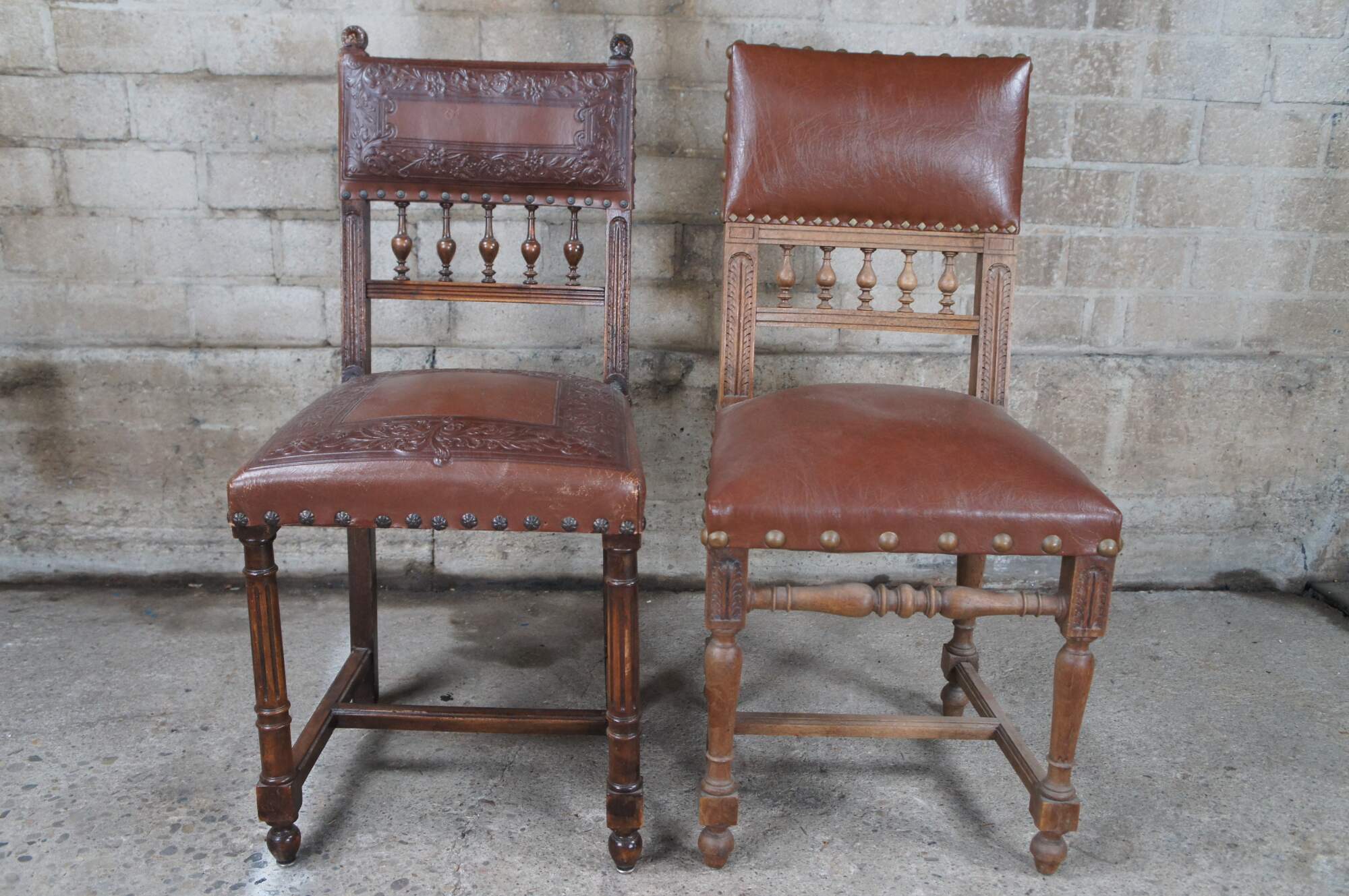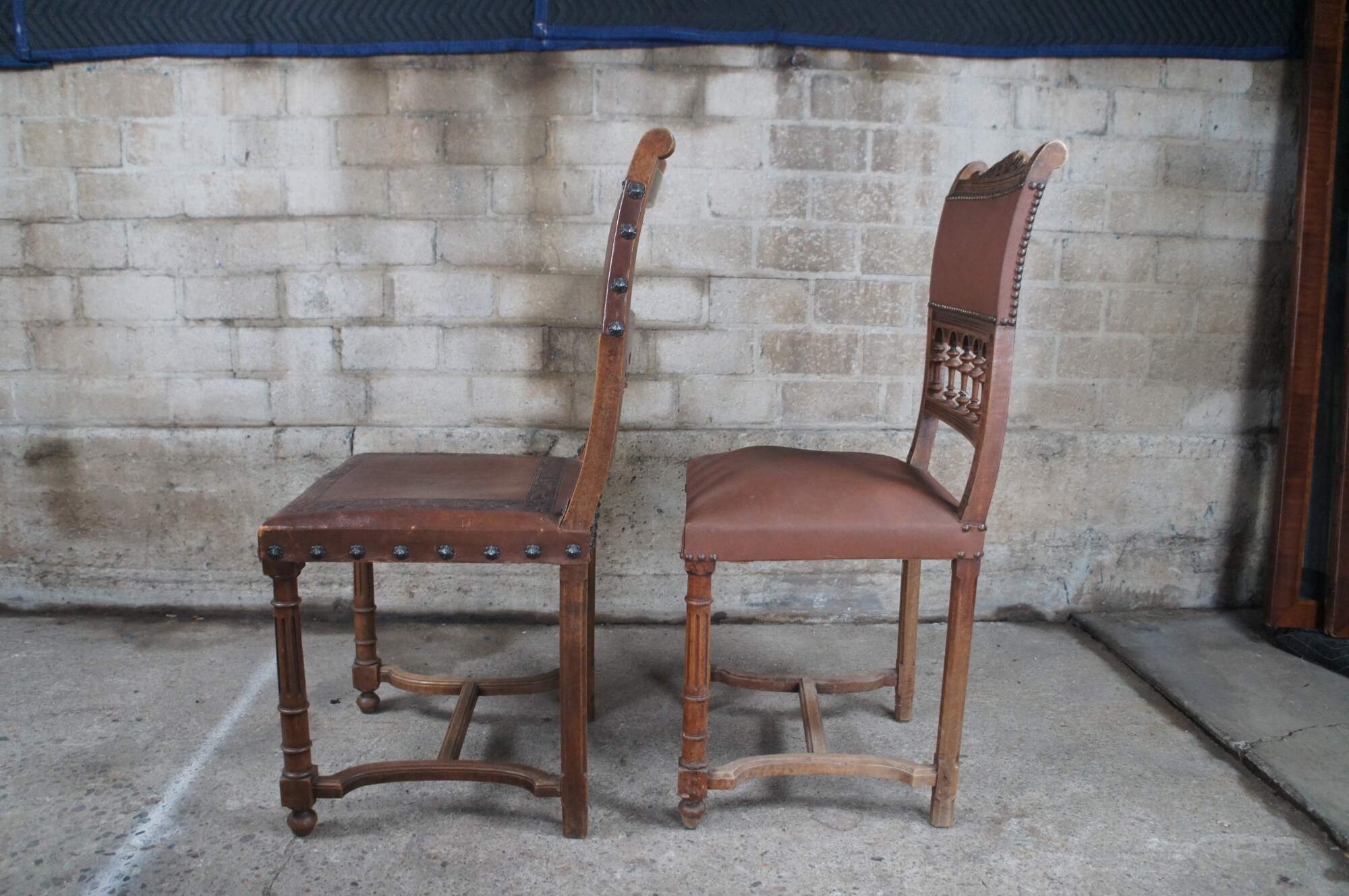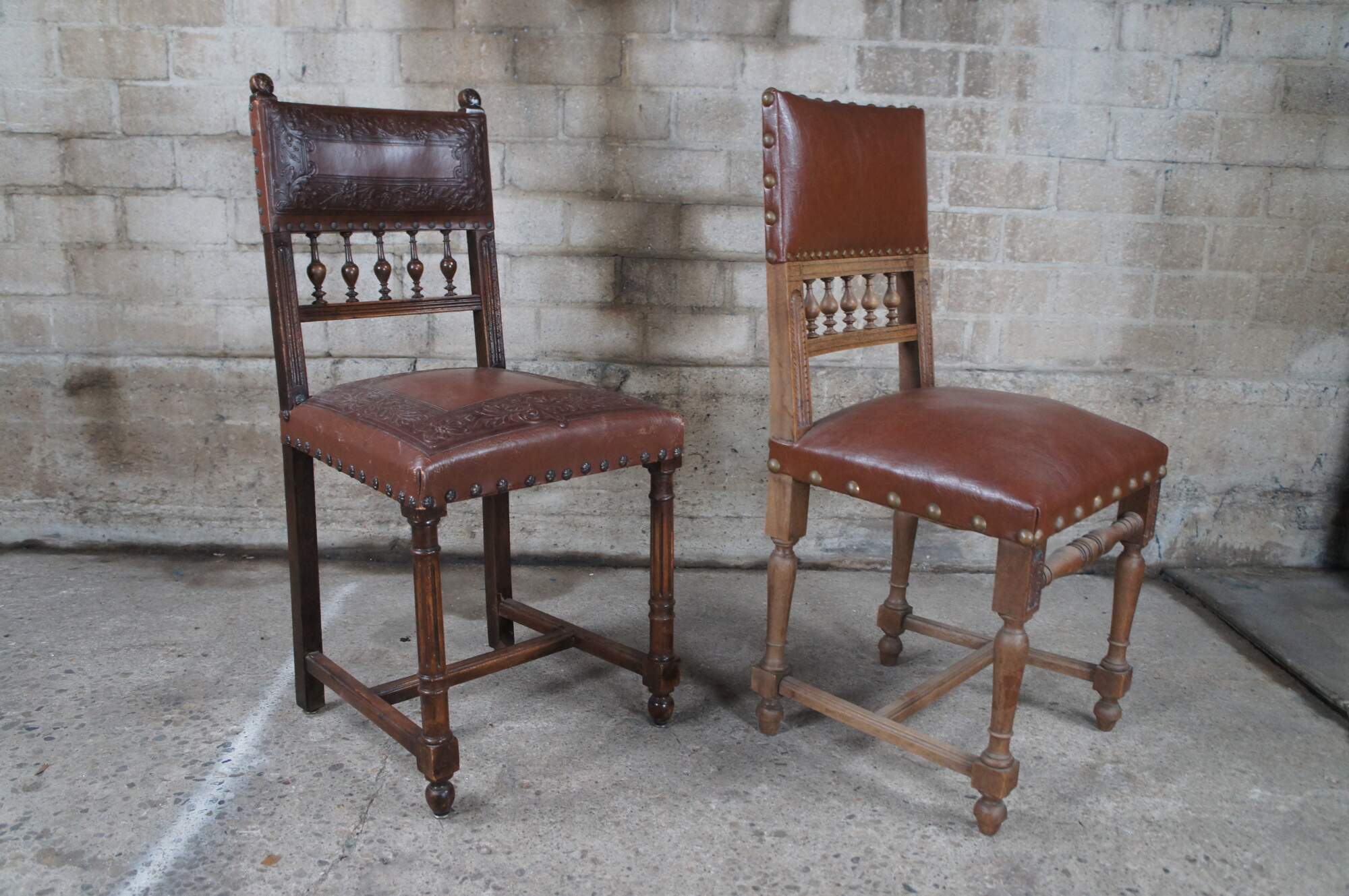 Lot of four Henry II style dining chairs. Features a hardwood construction with carved and molded spindle backs. The chairs are supported by fluted legs with H stretchers and bun feet. Upholstered in leather with some tooling and nailhead trim.