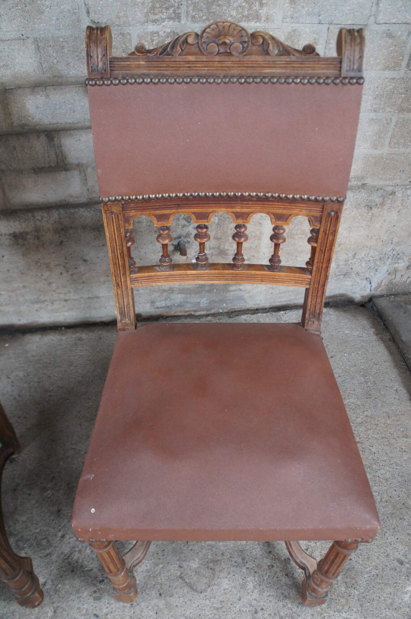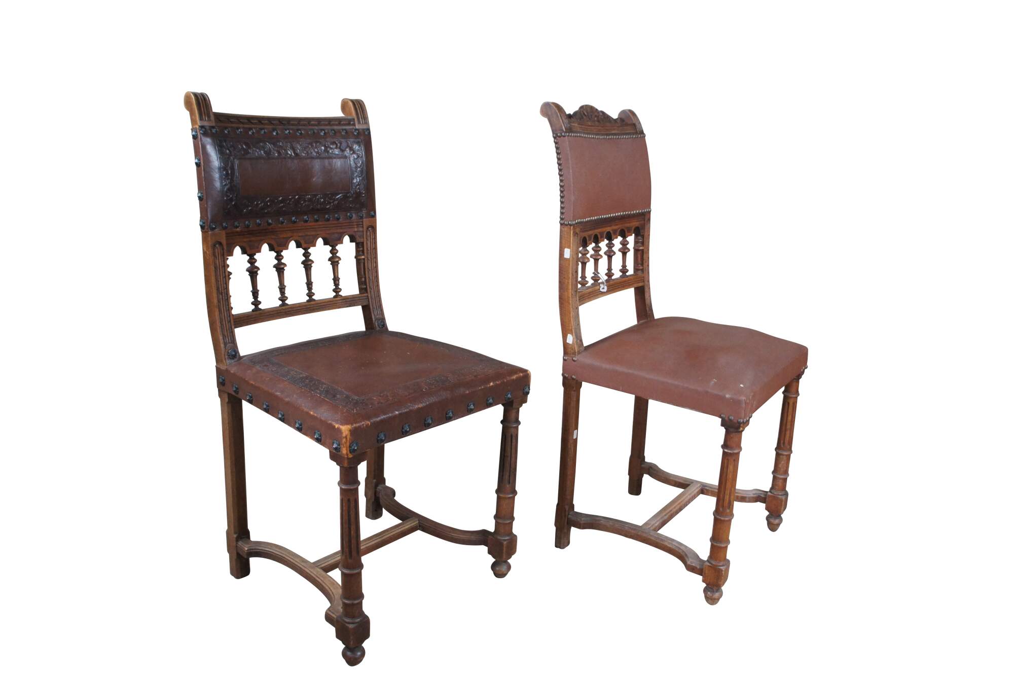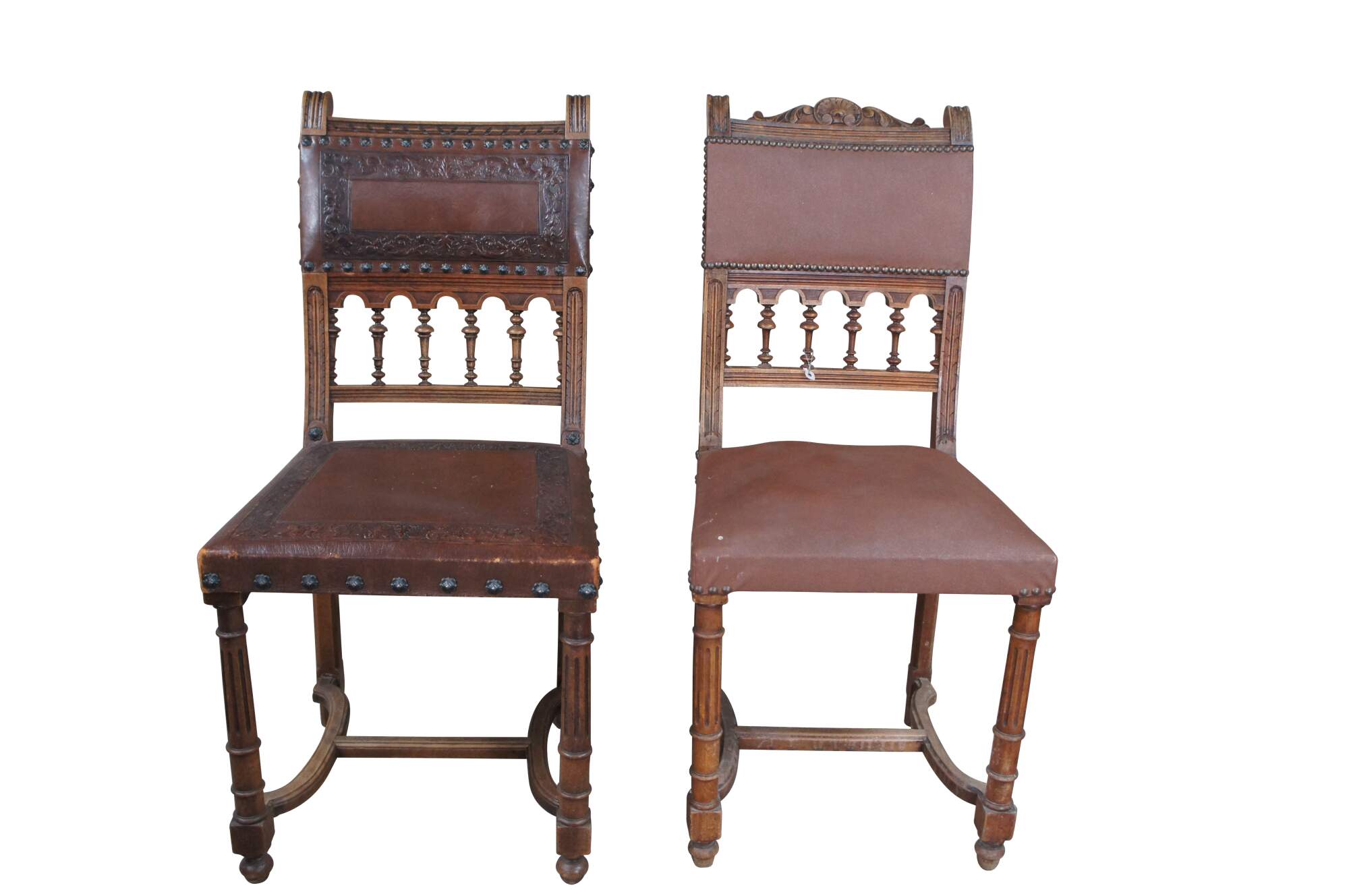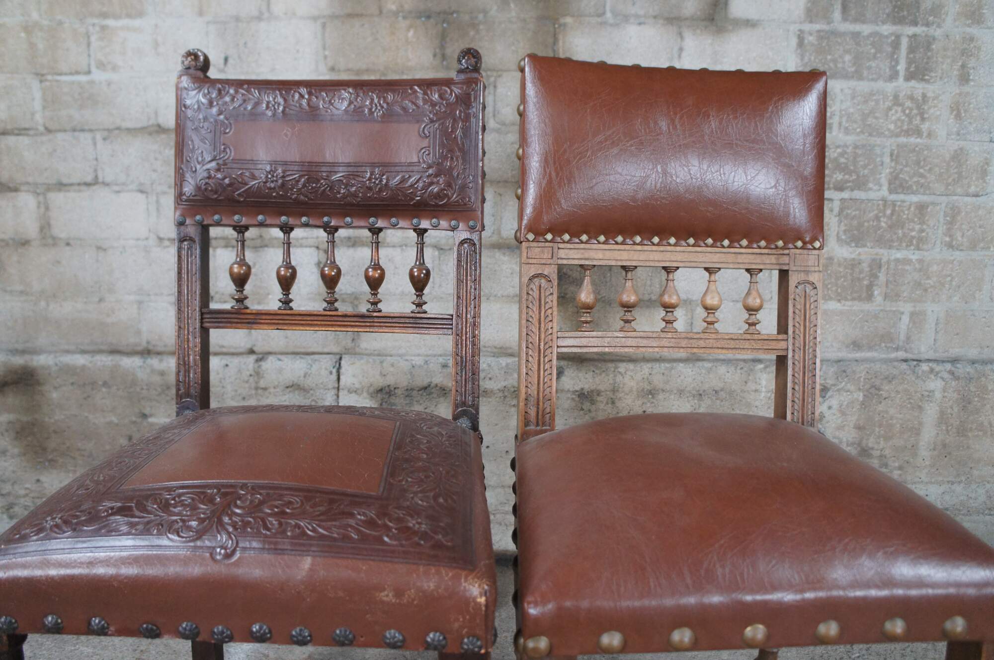 Lot of four Henry II style dining chairs. Features a hardwood construction with carved and molded spindle backs. The chairs are supported by fluted legs with H stretchers and bun feet. Upholstered in leather with some tooling and nailhead trim.
