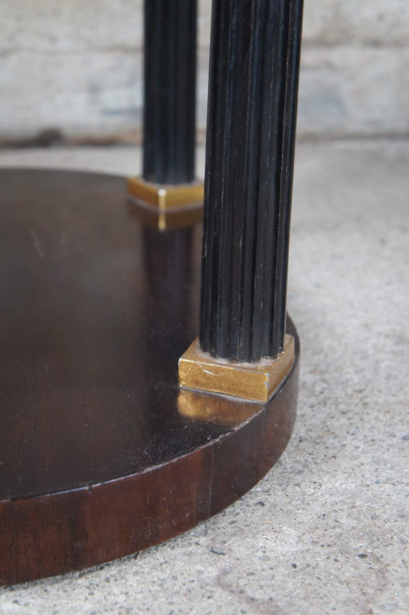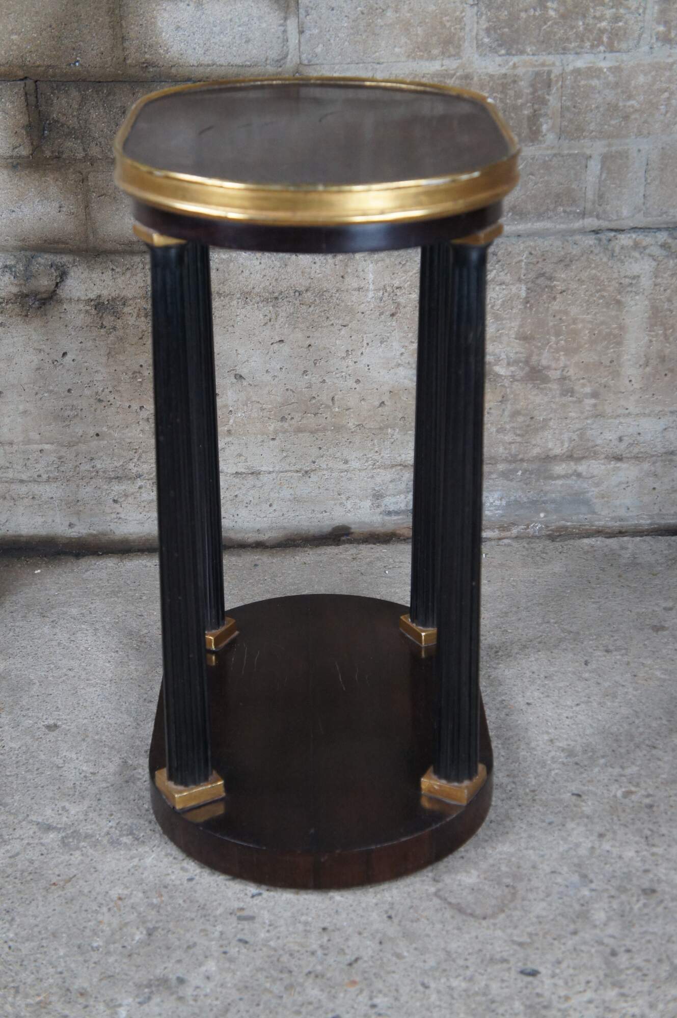 Dessin Fournir Romney Side Table, circa late 20th Century. Drawing inspiration from Louis XVI, Neoclassicism and Empire styling. Features an oval top made from mahogany with 22k gold leaf giltwood-trimmed tray edge over fluted ebonized columns and an oval base.